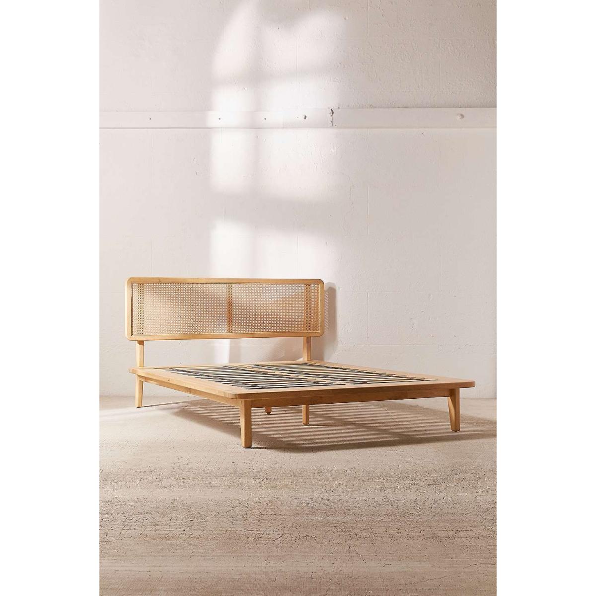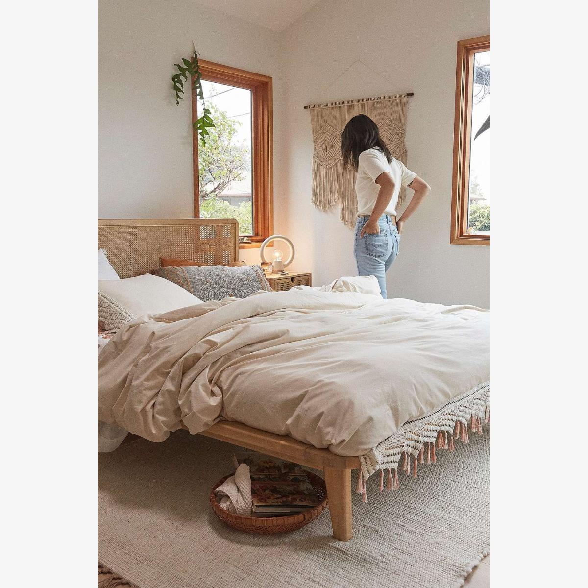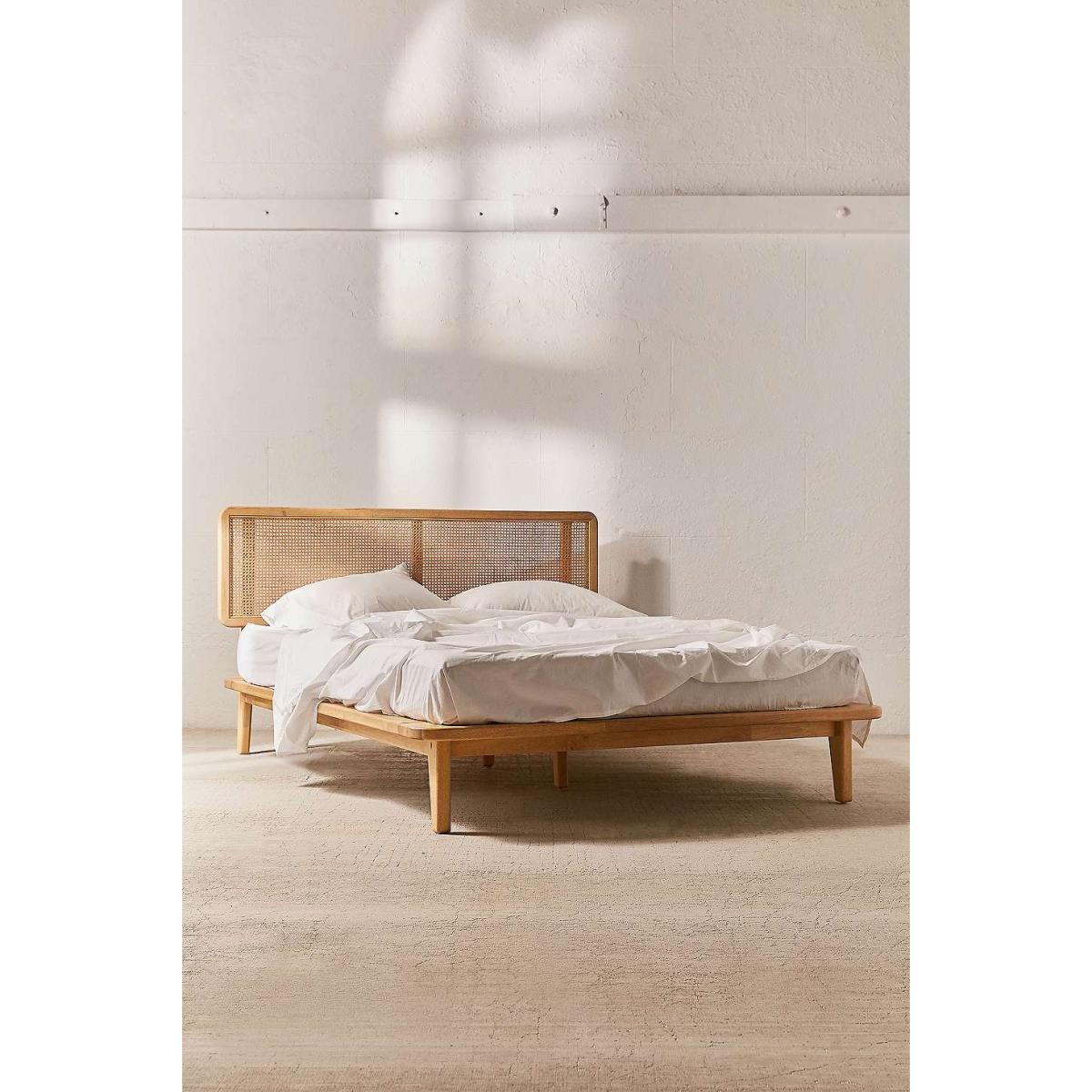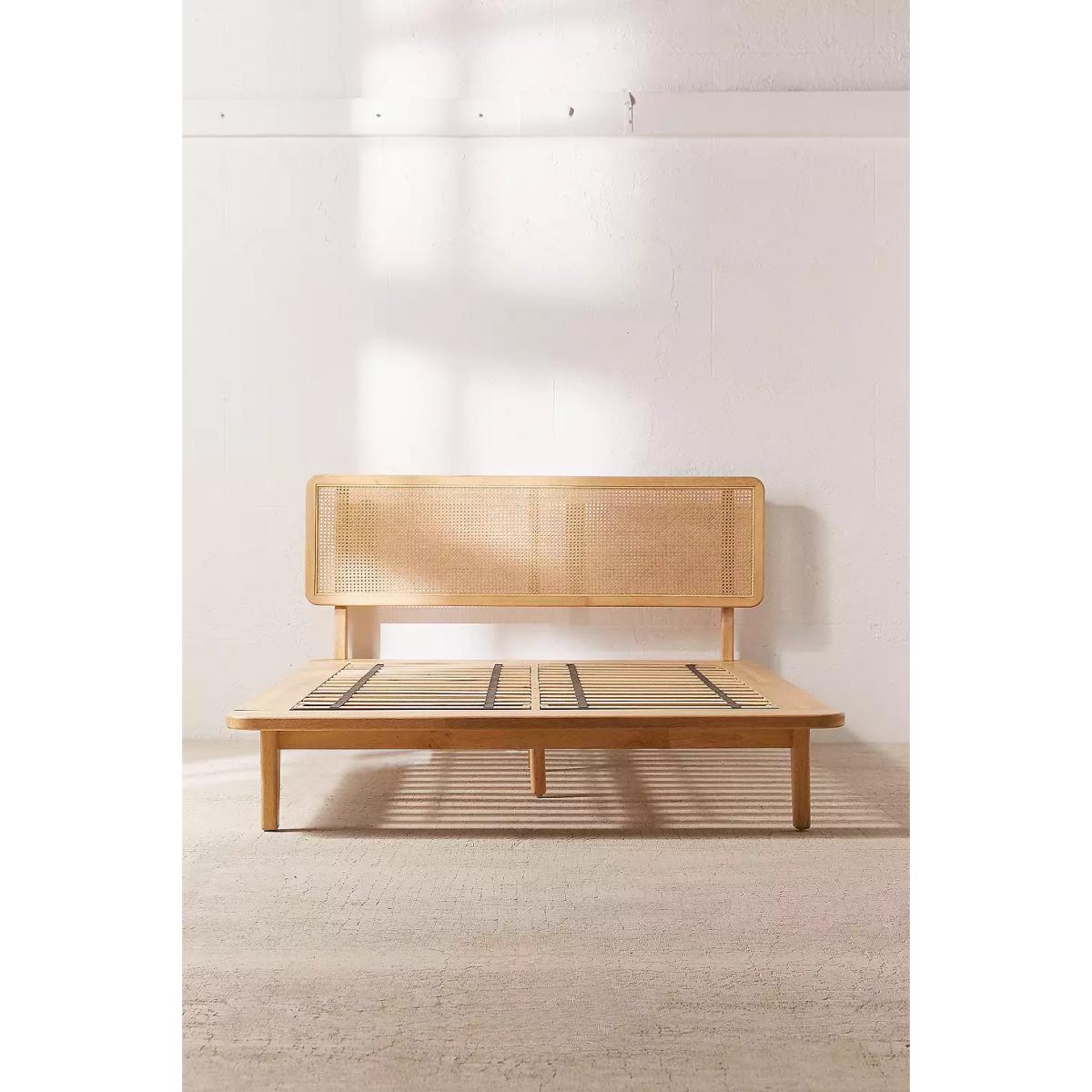 Minimal rubberwood bedframe with a rattan inset headboard. Features rounded corners and a supportive slatted surface. Part of the mid-century inspired Marte collection, perfect for your 70s-style interiors. *Online return only. This item cannot be returned instore. Please note furniture items currently cannot be shipped to Northern Ireland or The Republic of Ireland. Delivery of large furniture items may take 1-2 weeks and are therefore not eligible for Next Day Delivery.* **Content + Care** \- Assembly required \- Rubberwood \- Wipe clean **Size** \- Double \- L: 154.31cm x W: 207cm x H: 100.3cm \- Headboard L: 154.31cm x H: 48.3cm \- Mattress space: L: 137.2cm x W: 190.5cm \- Leg: H: 27.9cm \- Shipping dimensions: BOX 1: 164cm x 34cm x 107.8cm, BOX 2: 190cm x 29cm x 22cm \- Shipping package weight: BOX 1: 45 kg BOX 2: 26 kg \- King \- Dimensions: L: 210.18cm x W: 219.71cm x H: 100.33cm \- Headboard: L: 210.18 cm x H: 48.26 cm \- Mattress space: L: 193.04 cm x W: 203.2 cm \- Leg: 27.94 cm \- Weight: 170.64 lbs \- Shipping package dimensions:BOX 1: L: 219.71 cm x W: 107.95 cm x H: 34.29 cm BOX 2: L: 200.02 cm x W: 29.21 cm x H: 22.225 cm \- Shipping package weight: BOX 1: 141.98 lbs BOX 2: 57.32 lbs