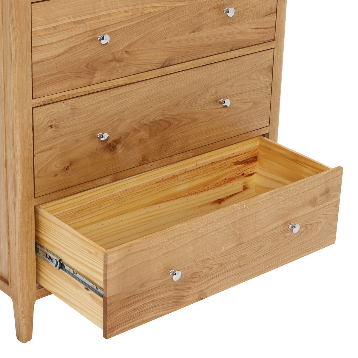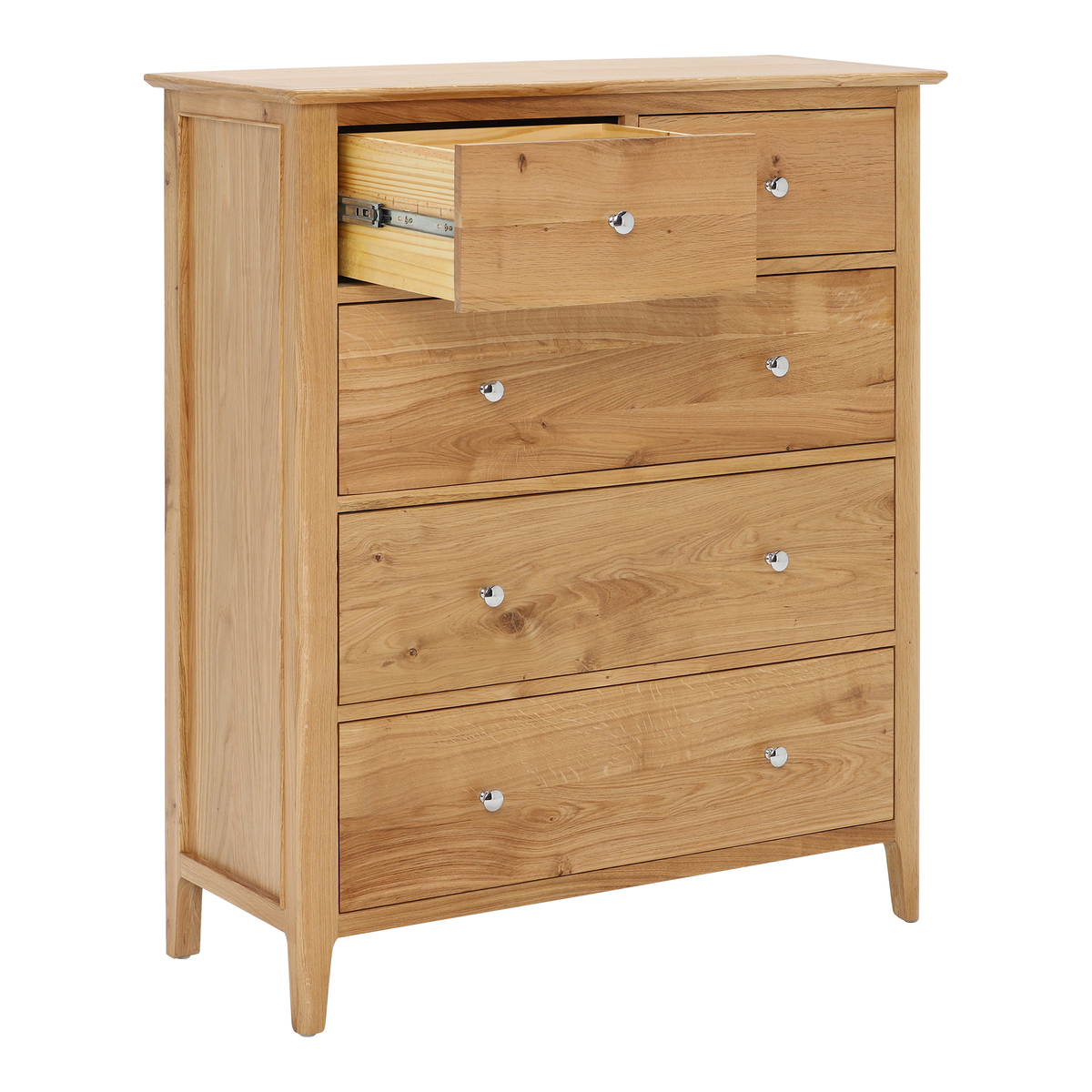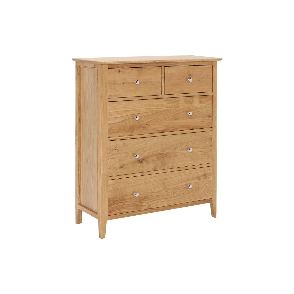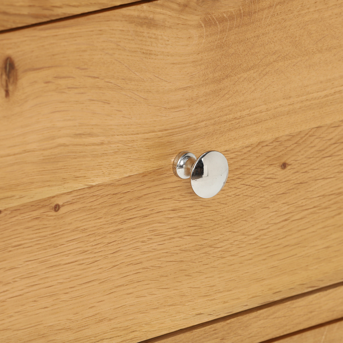 Beautifully oak veneered and finished with a scandinavian oak to accentuate its natural grains and knots, the Jumbo 2 Over 3 Drawer Chest is an attractive addition to the modern home. The Martello’s 3 large and 2 smaller sliding drawers provide ample storage space, perfect for your bedroom or living area. Coming with a choice of sleek chrome or natural oak handles, you can adapt your Martello to complement both classic contemporary and modern rustic interior styles.
