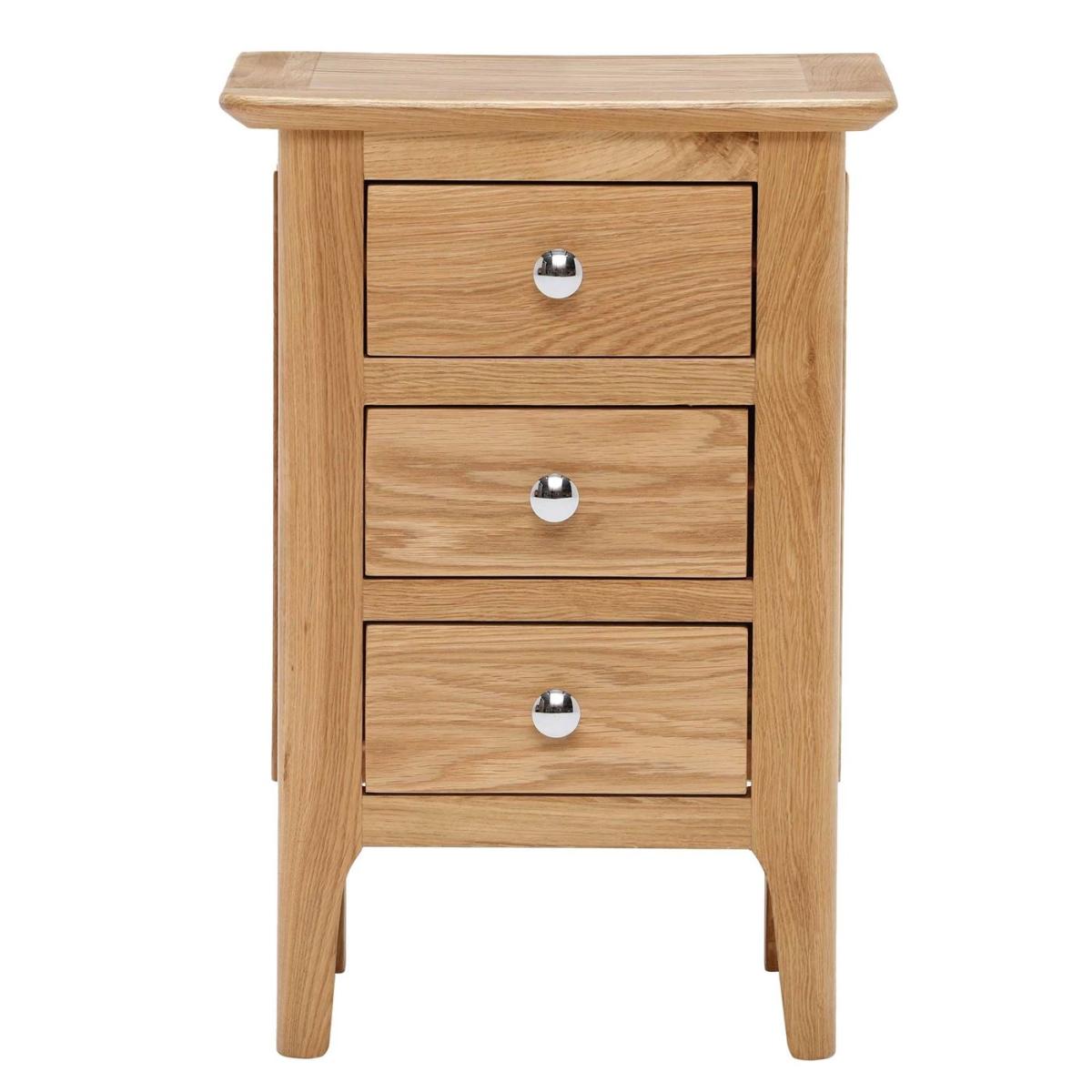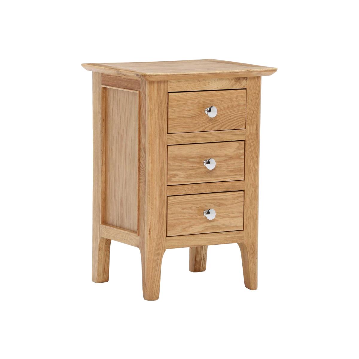 Design. The beautiful Martello Small Bedside masters classic elegance with a modern twist. Handcrafted from sturdy oak and durable oak veneering, the minimalist Martello is finished in a natural scandinavian oak to accentuate its own knots and grains. Featuring 3 handy sliding drawers for storing your bedroom essentials, the Martello is perfectly suited to a contemporary-rustic home décor.