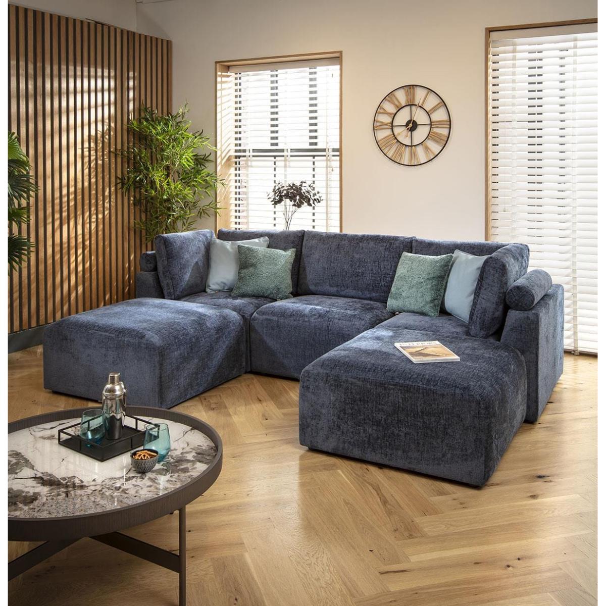 This small modular corner sofa combines modern minimalism with premium comfort, perfect for any contemporary space. Upholstered in a soft blue chenille fabric, it offers a modern, sophisticated look with a customisable, modular layout. Ideal as a 3-seater L-shape corner sofa, its both stylish and functional. Featuring a contemporary boxy silhouette, this small corner settee boasts a built-in base cushion for long-lasting support. The loose back cushion, paired with a fixed bolster-style cushion on the backrest, offers added flair and convenience. Low-profile black feet and a floor-hugging design complete this modern corner sofa. The sofa is upholstered in premium quality, soft blue chenille fabric, adding a luxurious and sophisticated touch to your living space. The luxury cushioning ensures a plush and comfortable experience, making this fabric corner sofa perfect for everyday relaxation. With a modular design, this sectional corner sofa allows you to configure it to suit your space. Corner sections measure 92cm x 92cm, middle sections are 82cm x 92cm, and footstools are 84cm x 87cm. Recreate your ideal layoutyour sofa, your way, for the perfect compact corner sofa experience. W266cm D176cm H90cm 3 Seater U-Shape Corner Sofa Set with Footstools Fully modular design: this set includes 2 corner sections, 1 middle section, 2 footstools