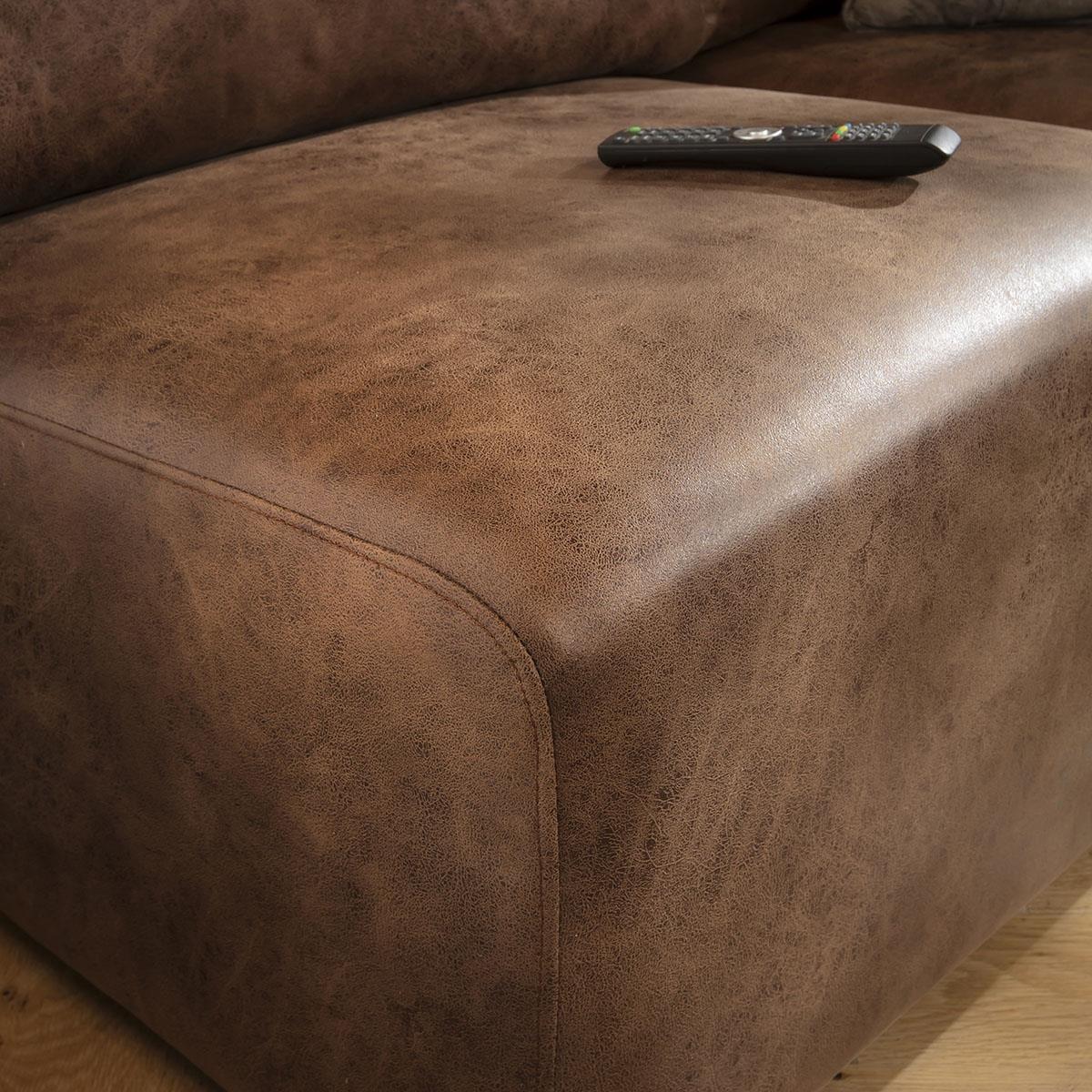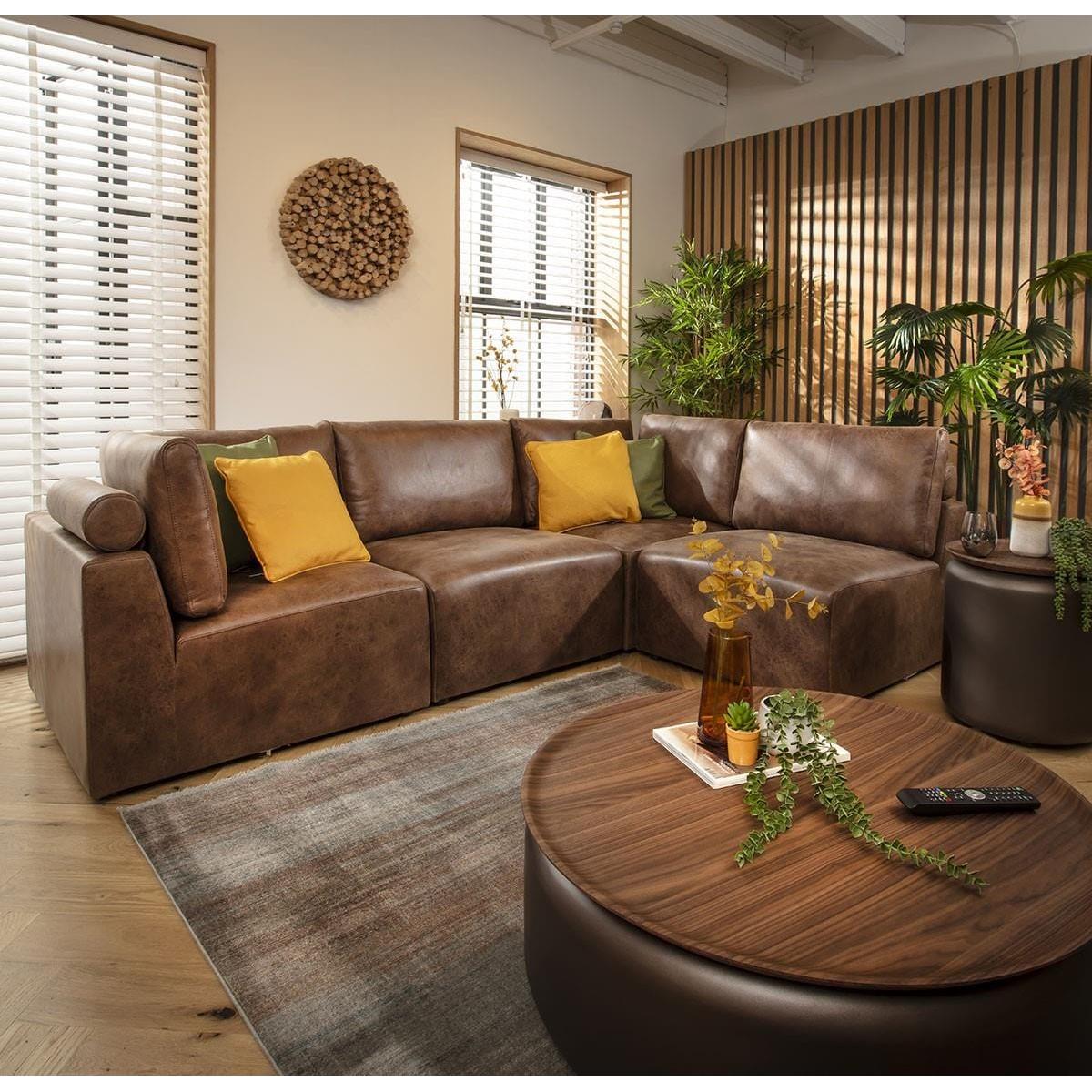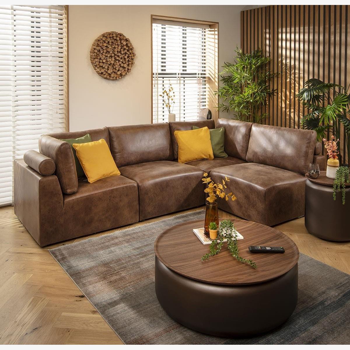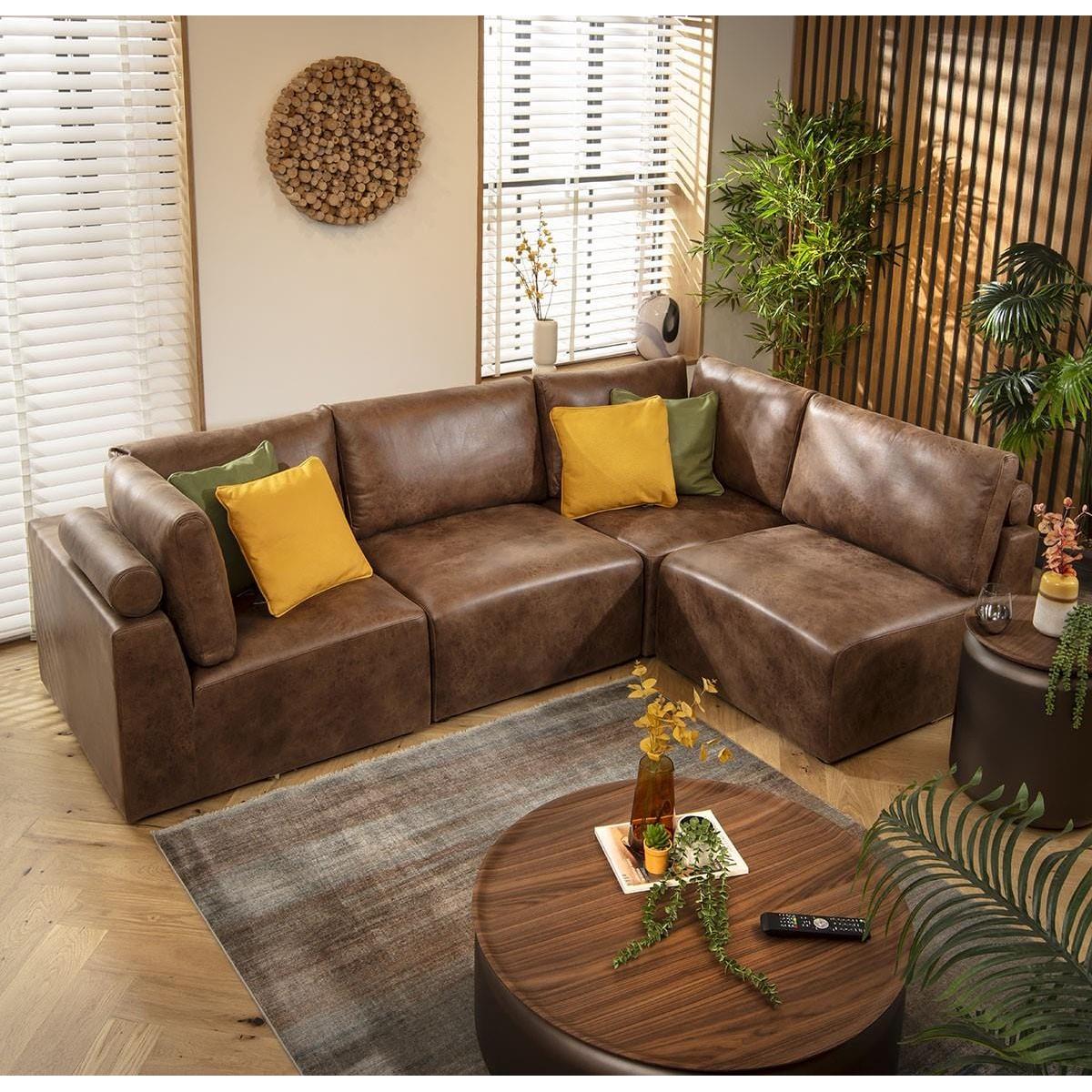 This small modular corner sofa combines modern minimalism with premium comfort, perfect for any contemporary space. Upholstered in an antique brown leather-look fabric, it offers a sleek, rustic design with a customisable, modular layout. Ideal as a 4-seater L-shape corner sofa, its both stylish and functional. Featuring a contemporary boxy silhouette, this small corner settee boasts a built-in base cushion for long-lasting support. The loose back cushion, paired with a fixed bolster-style cushion on the backrest, offers added flair and convenience. Low-profile black feet and a floor-hugging design complete this modern corner sofa. The sofa is upholstered in premium quality, antique brown leather-look fabric, adding a luxurious and sophisticated touch to your living space. The luxury cushioning ensures a plush and comfortable experience, making this fabric corner sofa perfect for everyday relaxation. With a modular design, this sectional corner sofa allows you to configure it to suit your space. Corner sections measure 92cm x 92cm, middle sections are 82cm x 92cm, and footstools are 84cm x 87cm. Recreate your ideal layoutyour sofa, your way, for the perfect compact corner sofa experience. W266cm D174cm H90cm 4 Seater Corner Sofa Set Fully modular design: this set includes 2 corner sections, 2 middle sections