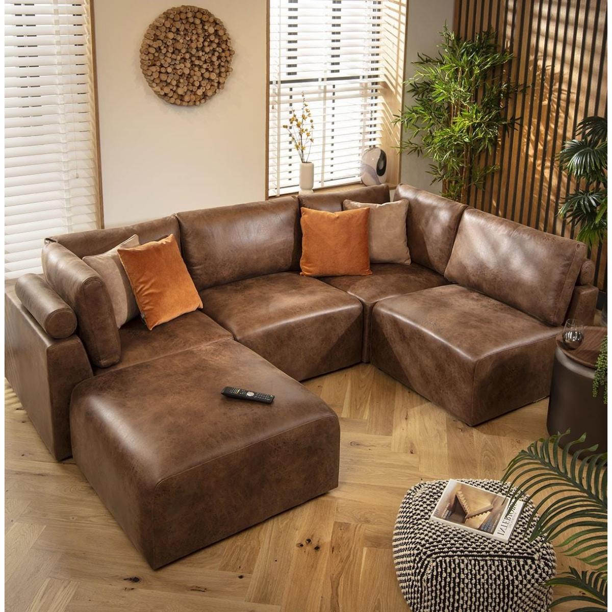 This small modular corner sofa combines modern minimalism with premium comfort, perfect for any contemporary space. Upholstered in an antique brown leather-look fabric, it offers a sleek, rustic design with a customisable, modular layout. Ideal as a 4-seater L-shape corner sofa, its both stylish and functional. Featuring a contemporary boxy silhouette, this small corner settee boasts a built-in base cushion for long-lasting support. The loose back cushion, paired with a fixed bolster-style cushion on the backrest, offers added flair and convenience. Low-profile black feet and a floor-hugging design complete this modern corner sofa. The sofa is upholstered in premium quality, antique brown leather-look fabric, adding a luxurious and sophisticated touch to your living space. The luxury cushioning ensures a plush and comfortable experience, making this fabric corner sofa perfect for everyday relaxation. With a modular design, this sectional corner sofa allows you to configure it to suit your space. Corner sections measure 92cm x 92cm, middle sections are 82cm x 92cm, and footstools are 84cm x 87cm. Recreate your ideal layoutyour sofa, your way, for the perfect compact corner sofa experience. W266cm D176cm H90cm 4 Seater Corner Sofa Set with Footstool Fully modular design: this set includes 2 corner sections, 2 middle sections, 1 footstool