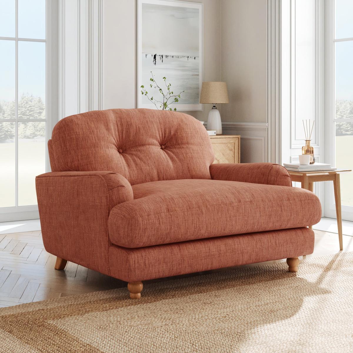 * Single Seater Sofa* Soft Faux Linen Upholstery* Matching family items available The Martha snuggle sofa is the epitome of comfort and sophistication. With its soft touch fabric, you'll experience a luxurious seating experience that invites relaxation. The generous, fibre-filled seating ensures hours of comfort, while the turned wooden legs add a touch of vintage charm. This snuggle sofa is the perfect spot to unwind and cosy up with your favourite book or loved one. This product has fibre filled seat cushions. This means they require vigorous plumped by shaking and redistributing the fibres daily. This will add air back into the fibres and preventing clumping, flattening and the seat dipping.