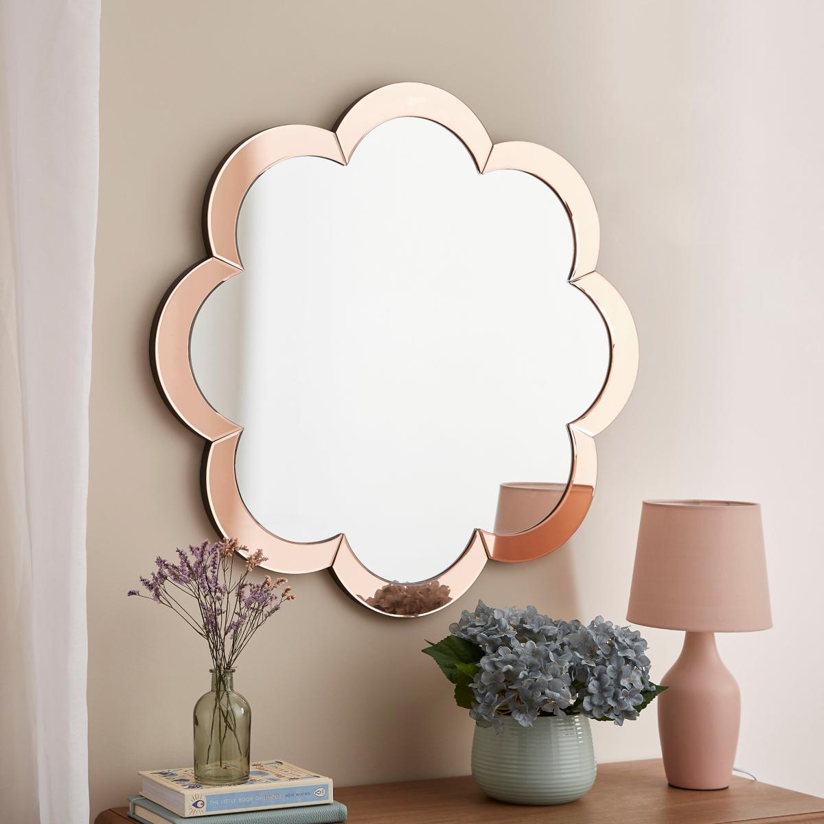 * Unusual flower shape* Bevelled edge detail* Soft rose gold colourway* Suitable for wall hanging This wall mirror is perfect for fans of floral touches. Its flower shape is accented by bevelled, soft rose gold coloured edging to reflect the light and add a subtle splash of colour. It’s suitable for wall hanging and would be a lovely focal centrepiece in a modern but classic interior design style. Please note: this mirror is not suitable for use in bathrooms.