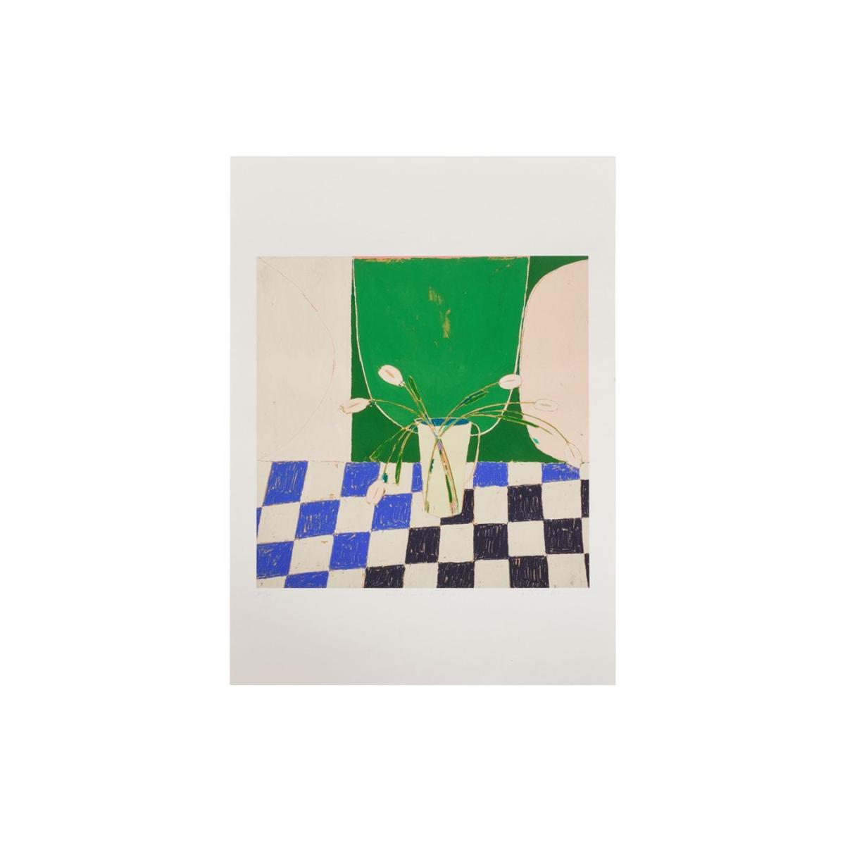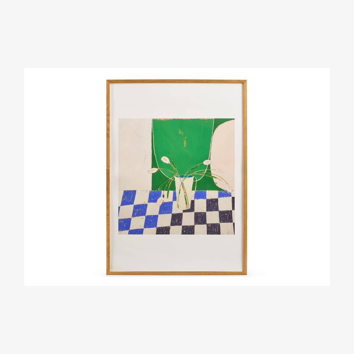 Fun Tulips in the Studio’ captures a moment in the studio in early spring - a jug of sculptural tulips sits on a fun checked table cloth with a colour palette picking up on hues from surrounding paintings.