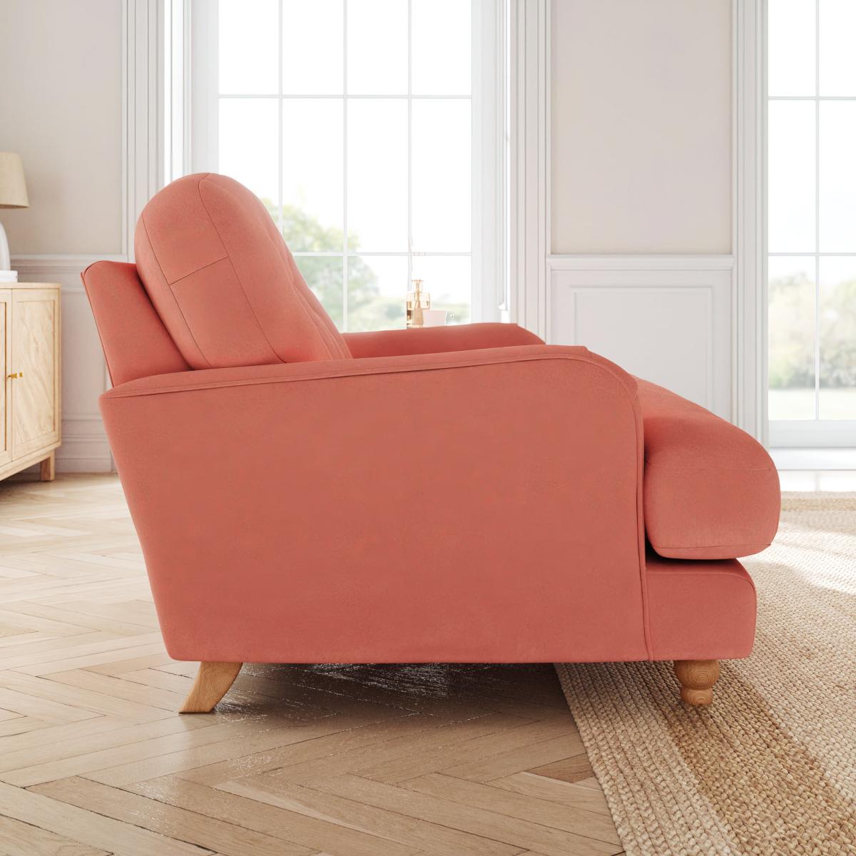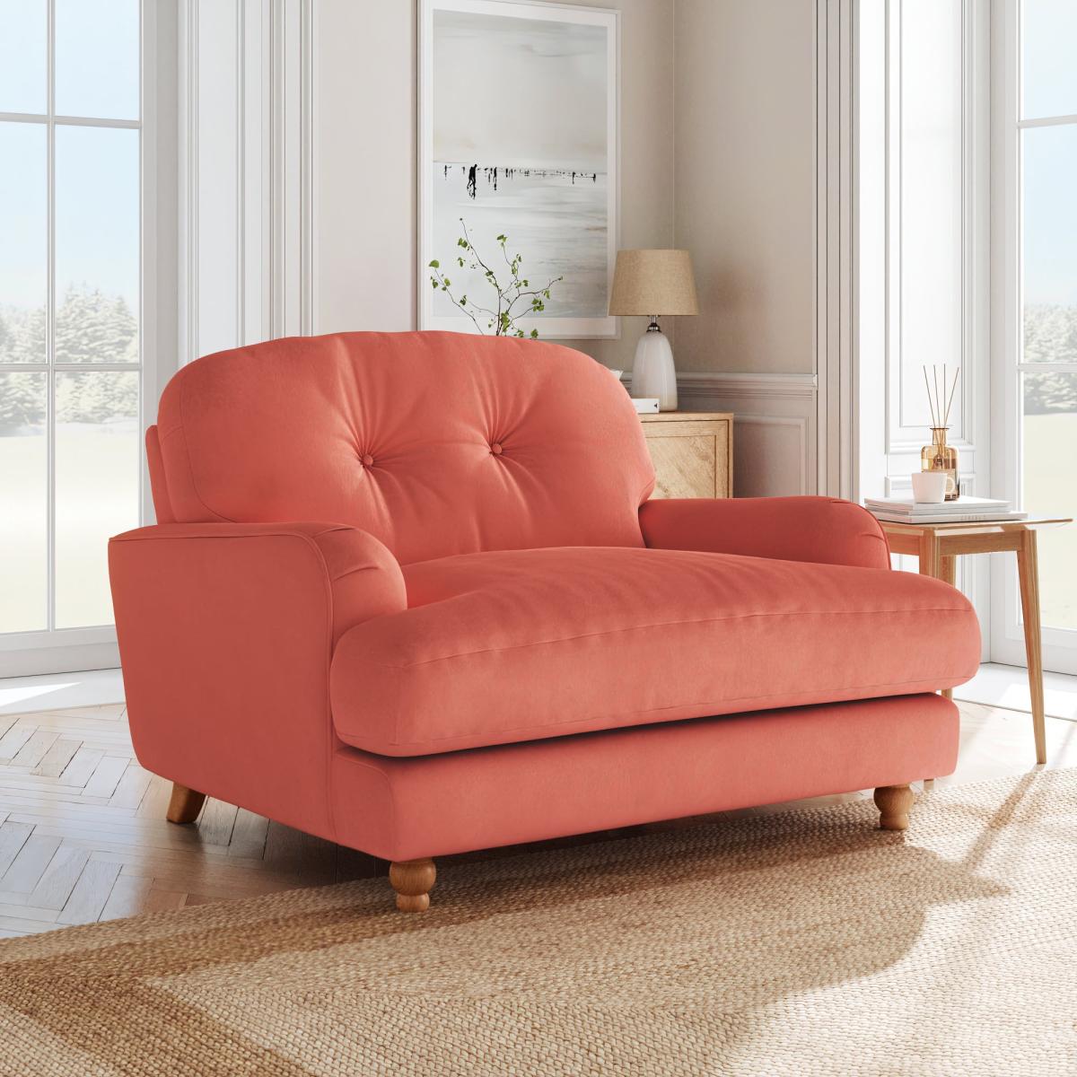 I love this snuggle sofa for its bold, bright coral hue and plush velvet finish, which instantly adds a lively and cosy touch to any interior. It works especially well in contemporary or eclectic living spaces where colour and texture can be focal points. The matte plush velvet offers a soft, matte sheen that’s less reflective and more inviting, making it perfect for creating a relaxed environment. Practical styling tips include pairing it with neutral-toned accessories and cushions to let the sofa stand out or balancing with softer textiles like throws and layered rugs. Its compact size makes it a versatile choice for cosy corners, reading nooks, or smaller living areas where comfort is key without sacrificing style.