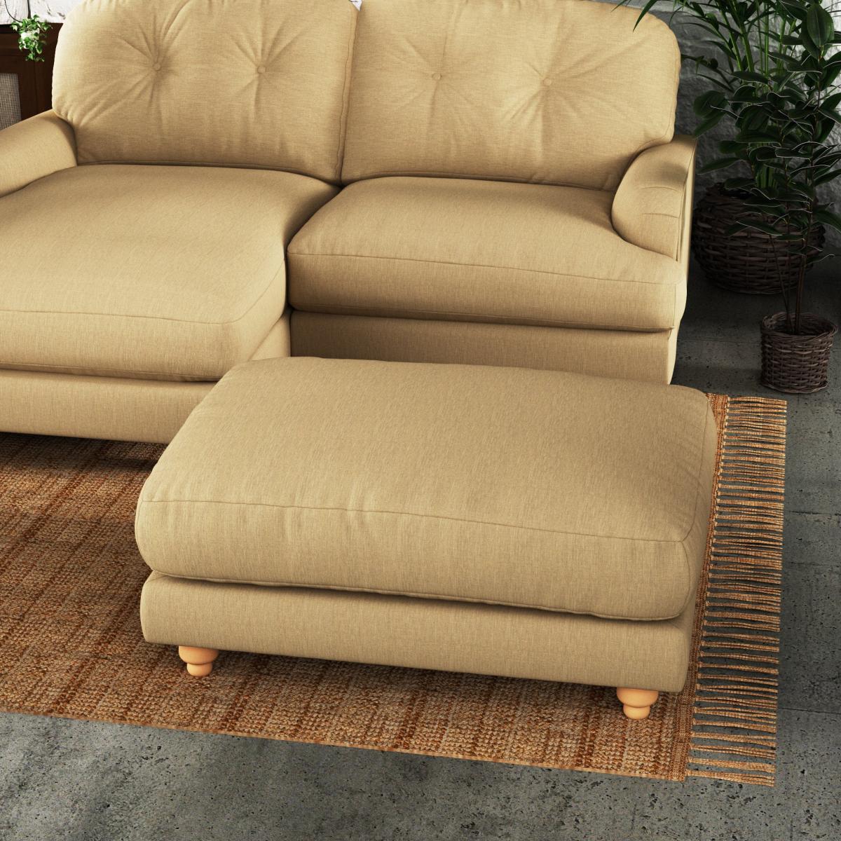 * Soft Linen Upholstery* Chesterfield style* Part of the Martha family This exquisite piece seamlessly blends sophistication with comfort, making it the perfect addition to your living space. The faux linen fabric adds a touch of refined elegance, while its cushioned top offers a luxurious spot to kick up your feet after a long day. Whether placed as a standalone statement or paired with other Martha pieces, this footstool effortlessly complements a variety of interior styles. It's not just a footrest; it's a stylish accent that infuses a touch of opulence into any room, inviting you to relax in absolute luxury. This product has fibre filled seat cushions. This means they require vigorous plumped by shaking and redistributing the fibres daily. This will add air back into the fibres and preventing clumping, flattening and the seat dipping.