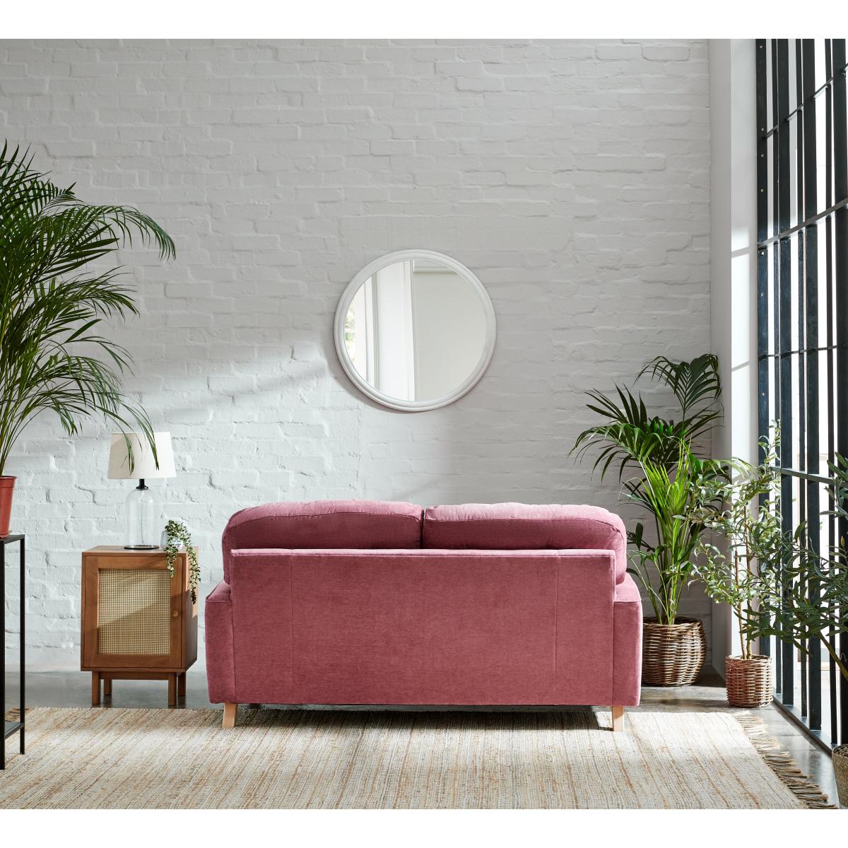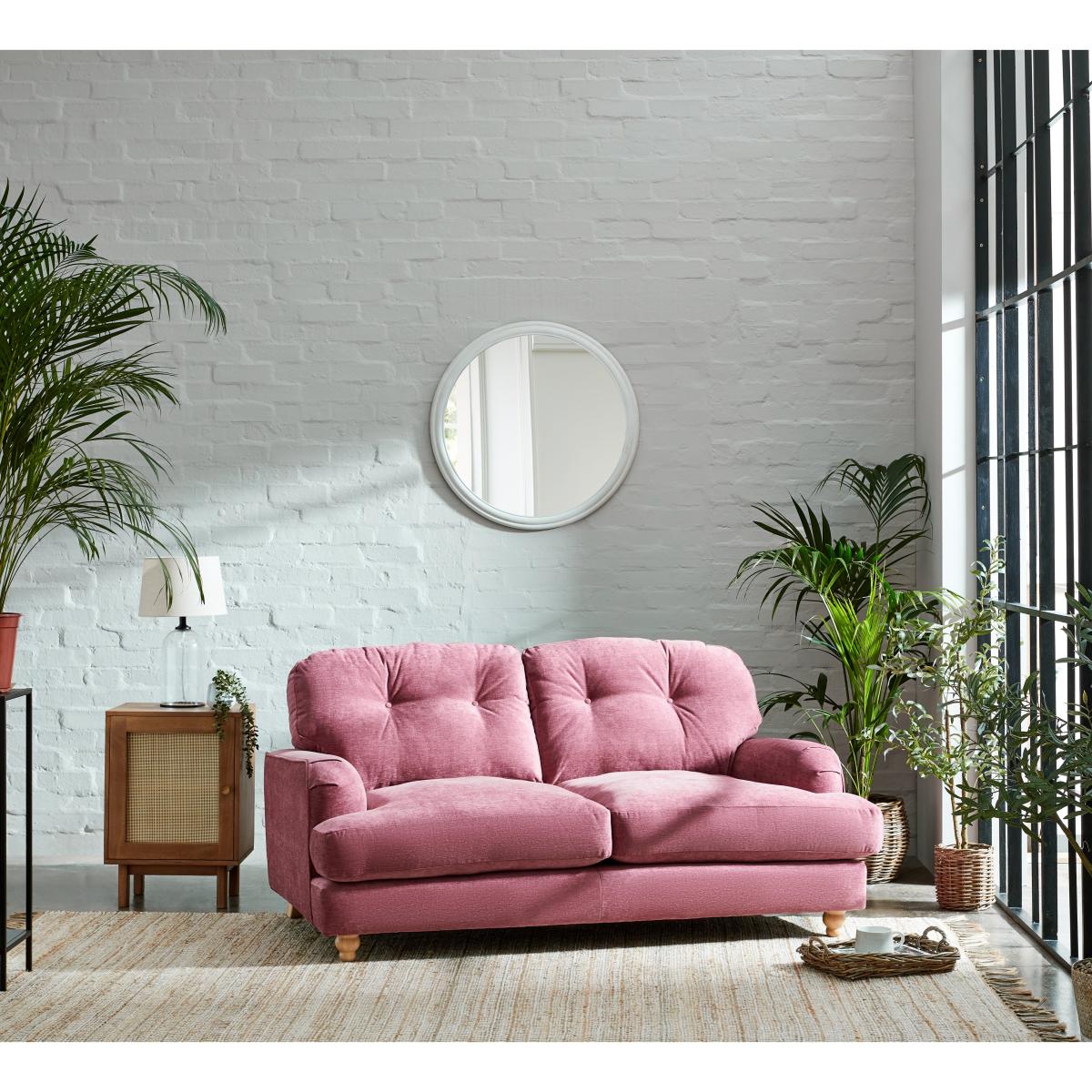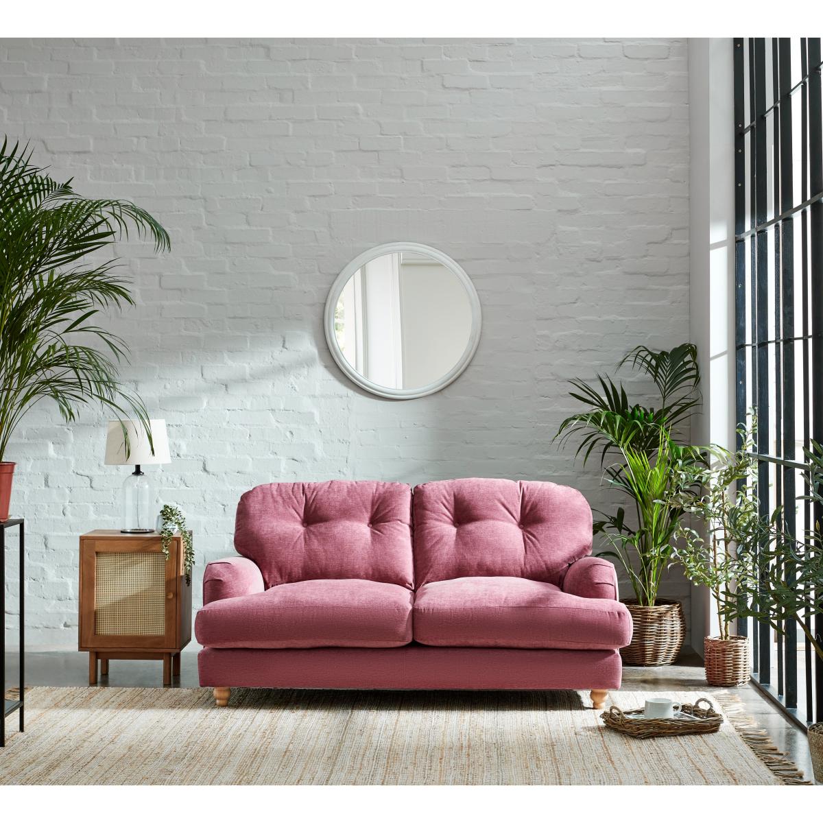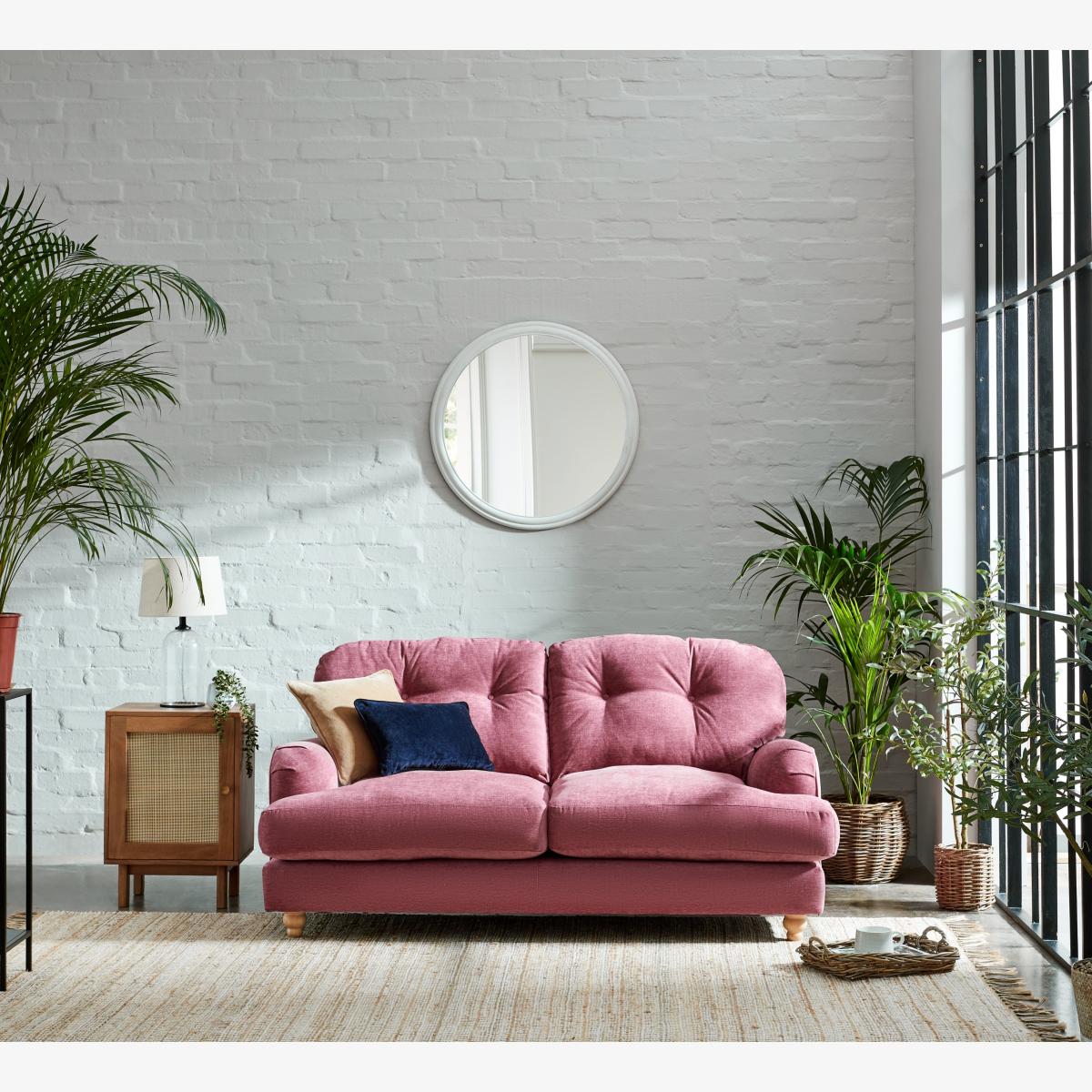 The Martha vintage chenille two-seater offers a charming pop of colour that works beautifully in both contemporary and eclectic interiors. I love its plush pink hue, which instantly adds warmth and personality without overpowering a space. It's versatile enough to be styled with neutral tones for a soft, inviting look or paired with bold accessories for a more vibrant feel. Practical styling tips include adding textured cushions in contrasting colours or materials, like the navy and mustard options pictured, to enhance its vintage vibe. For placement, try positioning it against a light wall to make the colour stand out, and complement it with natural textures such as rattan or wood to create a cosy yet stylish environment.