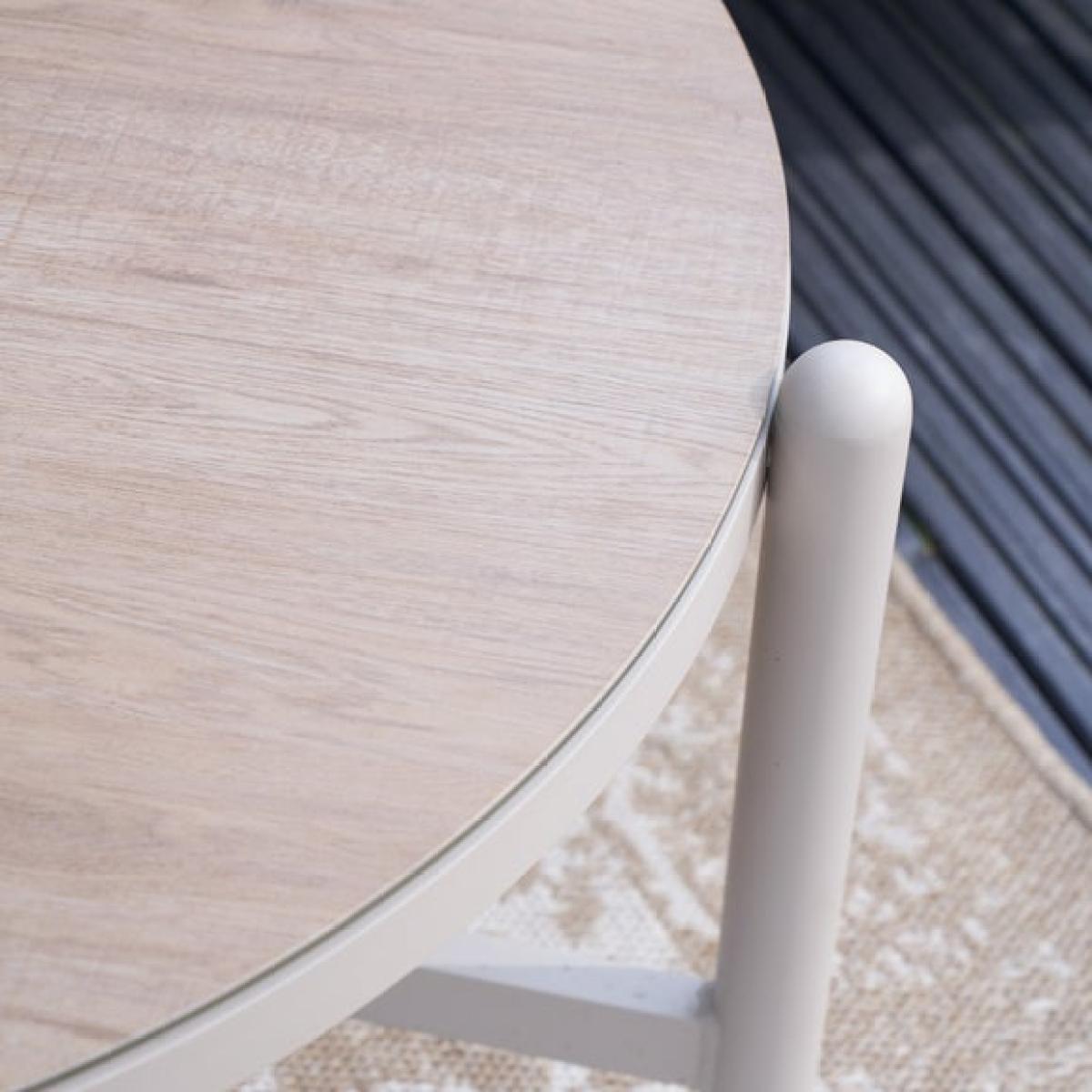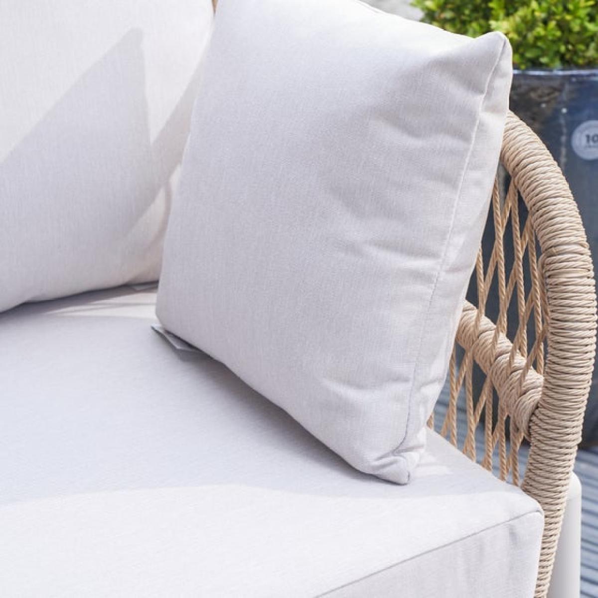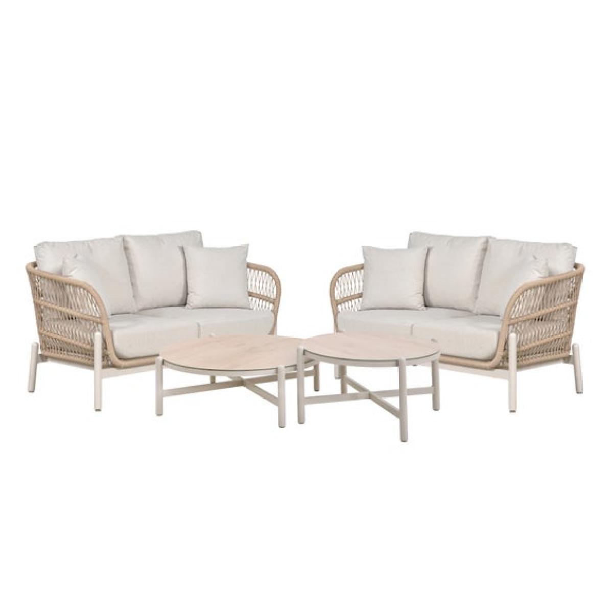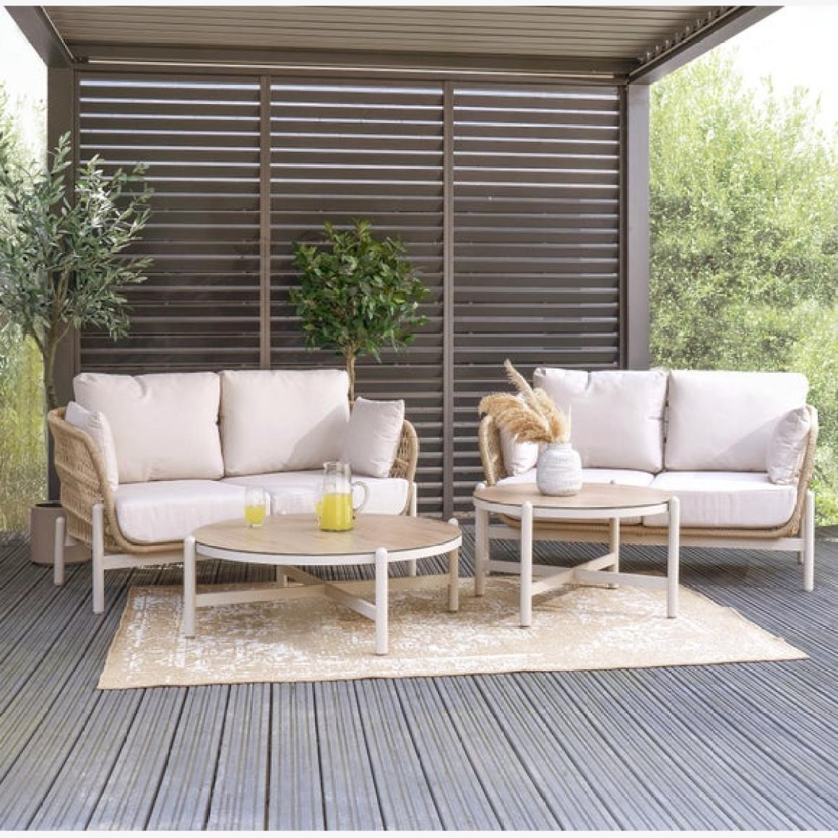 * Features a durable powder coated aluminium frame * Perfect for summer gatherings * Stain resistant cushions Sink into sunshine-ready comfort with the Martic Outdoor Sofa Table Set, a perfect pairing of style and practicality. This contemporary twin set includes two 2-seater sofas crafted from Natural Synthetic Core Weave and Latte-toned, powder-coated aluminium for a sturdy yet elegant finish. The plush Light Putty Olefin cushions aren’t just easy on the eye they’re made to resist stains, fading and soggy seats after summer showers. Accompanied by two chic round tables with an Ash wood effect top, there's plenty of room for snacks, drinks, and everything in between. Designed to coordinate seamlessly with the rest of the Martic range or shine solo in your garden space. All that’s left to do is pop the kettle on (or the fizz).