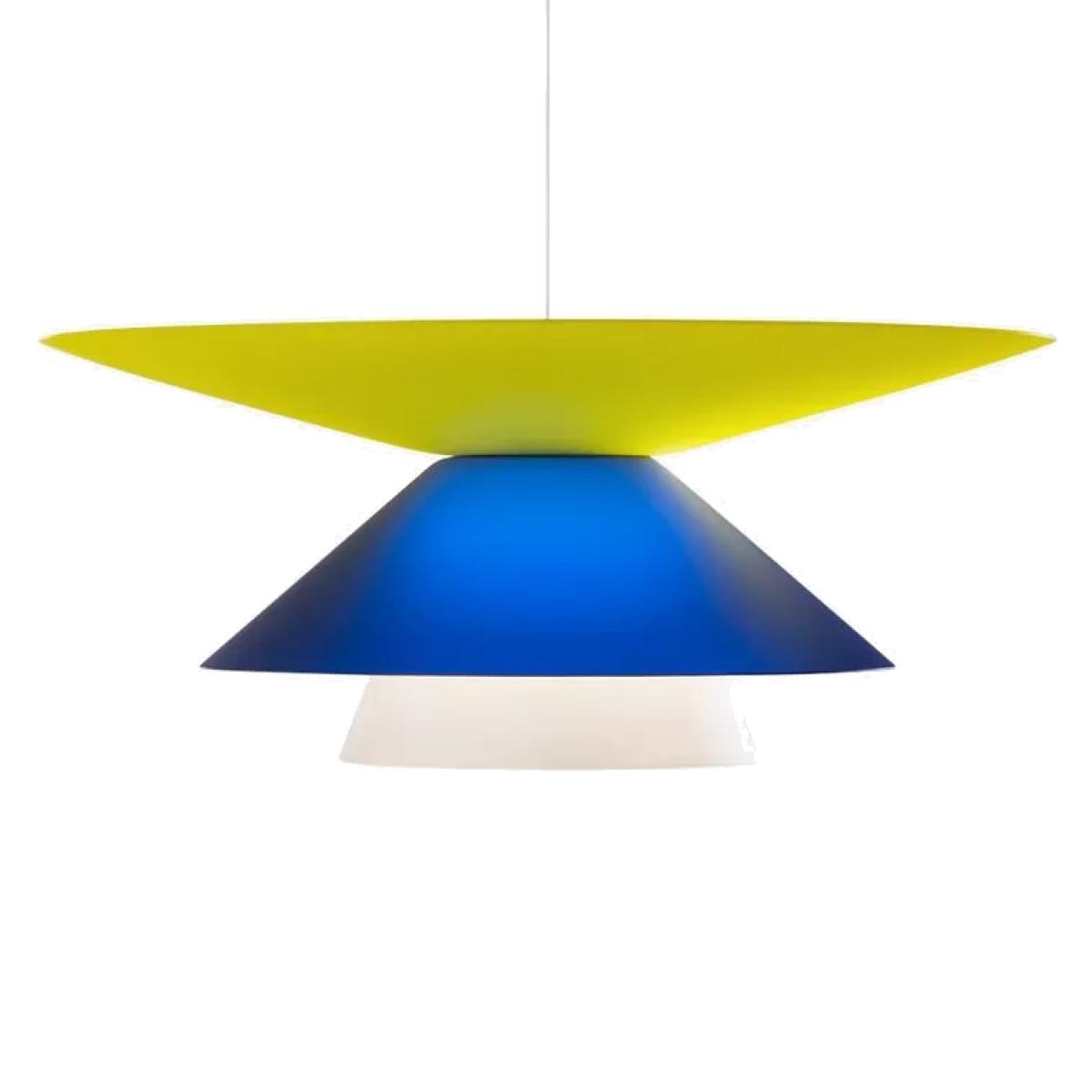Modularity, colour and transformation are the key words to best describe this ceiling light, composed of different shaped shades. Made in Italy by Martinelli Luce, the Lady Galala is a suspension light consisting of an interior body combining three different conical-shaped diffusers of different diameters and shades of colour. This light can therefore assume many configurations. One shade is made of aluminium painted in matt white, integrated with two bi-satin methacrylate diffusers.
