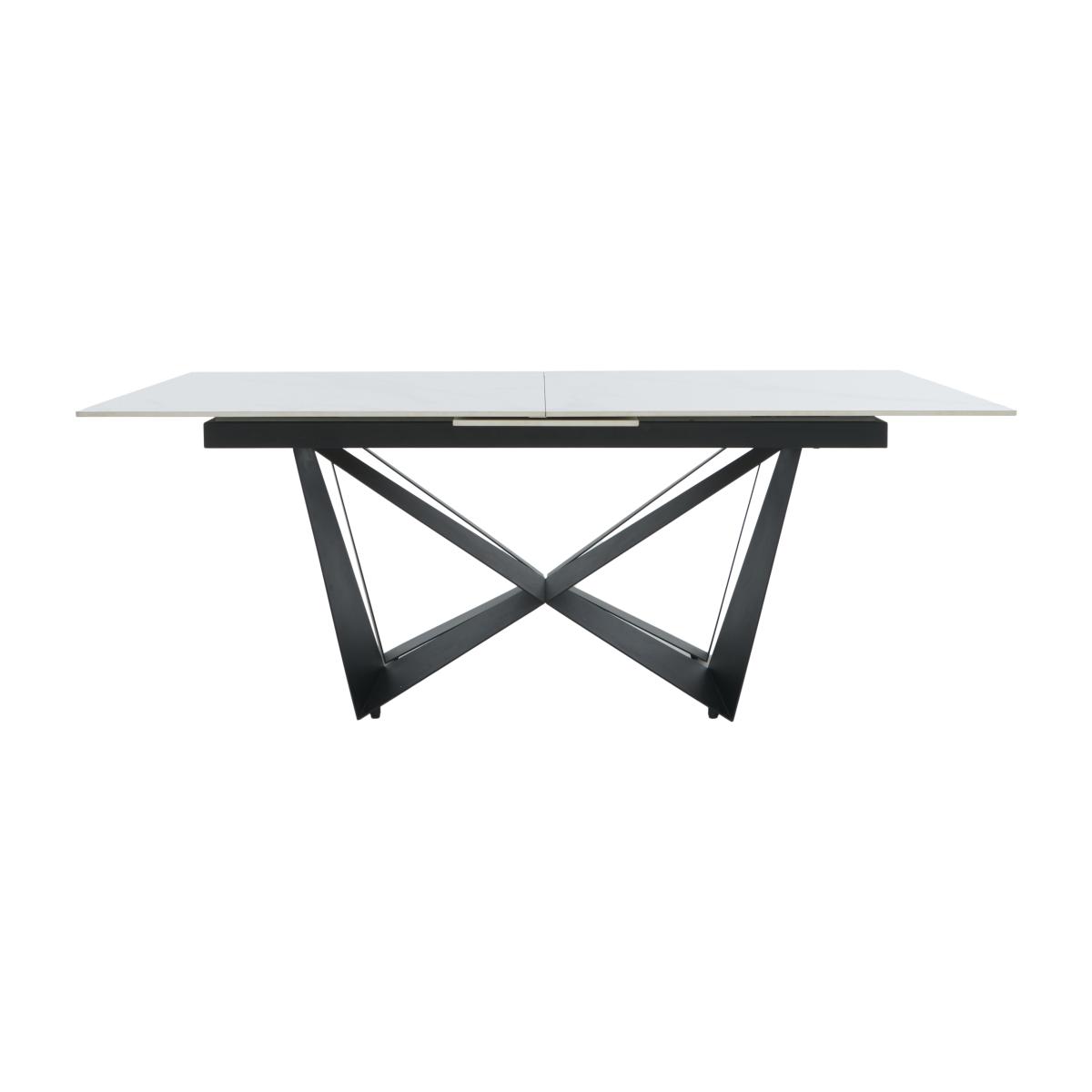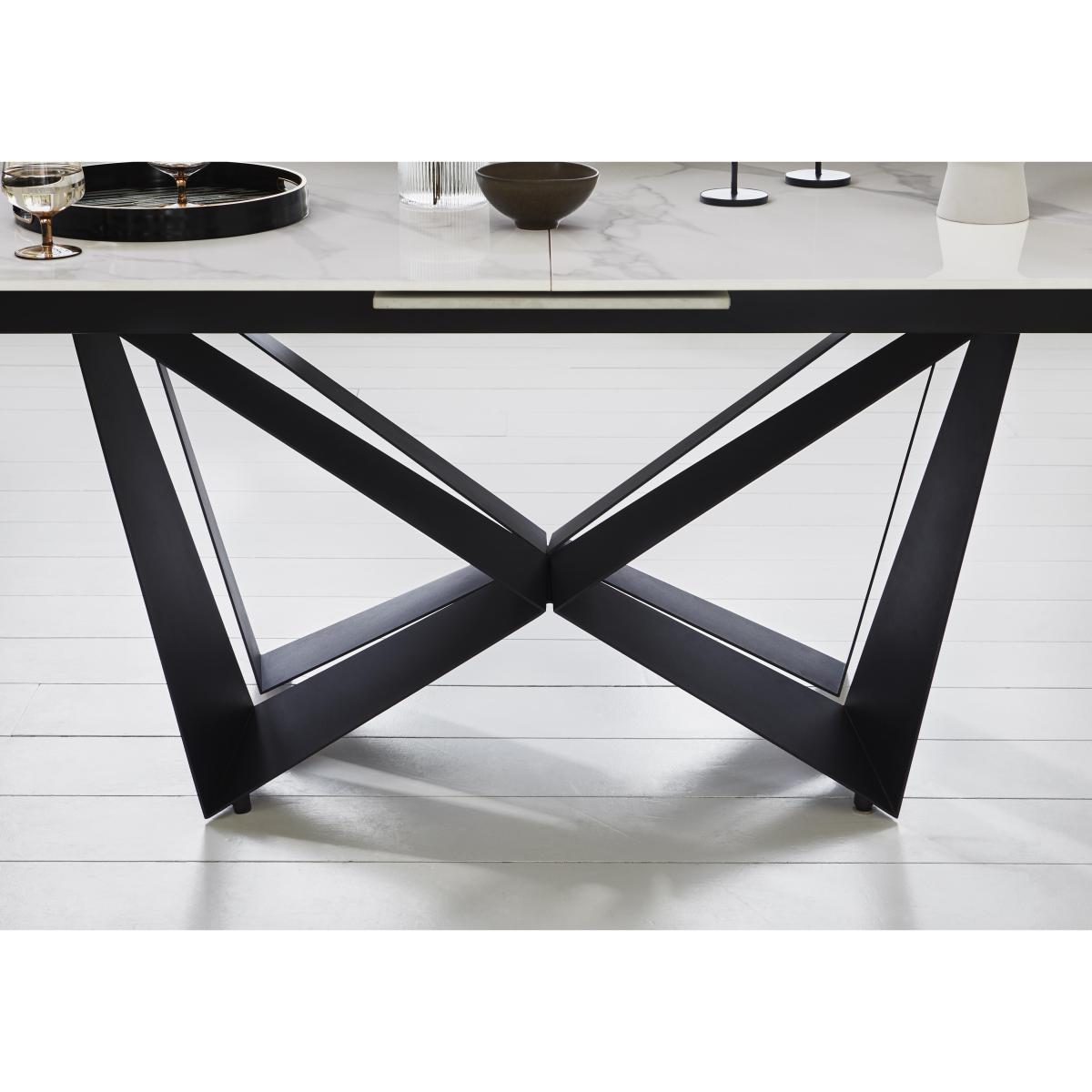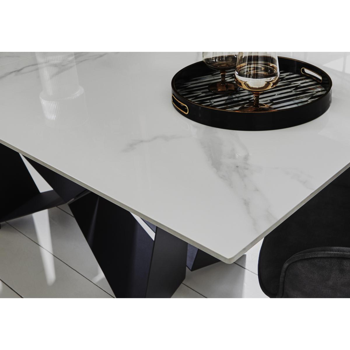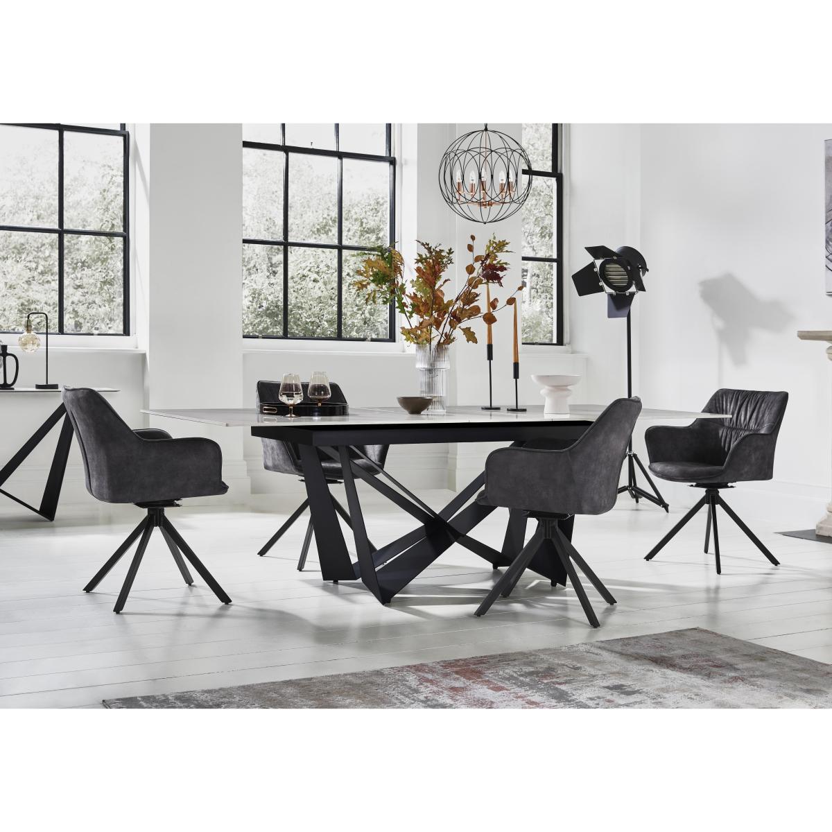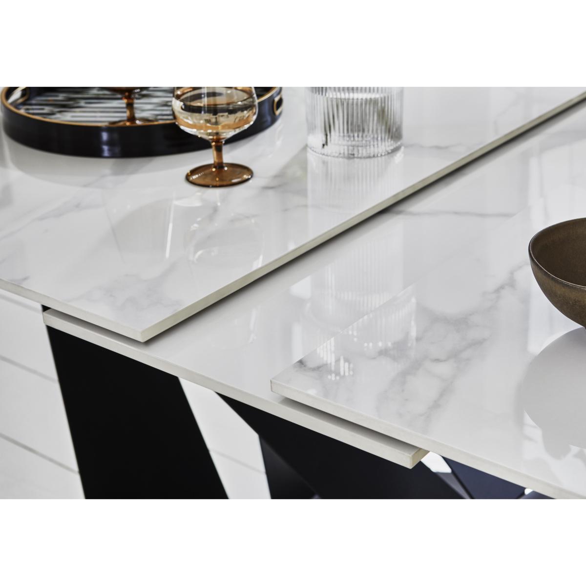 Can’t decide between bold urban style and modern glam luxury for your dining room? We have the very range for you. With glossy ceramic tops and artisan-made bases, our Marvel dining collection showcases statement style in a choice of two distinctly different looks for extending dining tables, dining sets, sideboards and occasional tables. Marvel Black features bold black iron bases that deliver a contemporary industrial vibe, while Marvel Chrome has high-shine chrome-effect bases for a gorgeously glam aesthetic. Each comes with its own style of elegant velvet-upholstered dining chair. Showstopping style two ways, only at Furniture Village. Bold and beautiful, this striking dining table has a ceramic top and showstopping angular black iron base. Eye-catching industrial style. Why you'll love it. This very cool extending dining table makes a bold statement. Contemporary urban style with showstopping design details. Dramatic angular black iron base. Glossy marble-effect top is made of real 12 mm ceramic that won’t fade. Practicality meets style – ceramic is heat-, scratch- and chip-resistant. The extra leaf pops up to extend the table in seconds. In 2 sizes. Artisan-handcrafted and only at Furniture Village. This extending dining table is part of the Marvel Black range. What you need to know. 160 cm table seats 4 when closed and 6 when extended. 200 cm table seats 6 when closed and 8 when extended. Tables are extremely heavy and should not be moved once in place. The iron base may display weld marks or a wire-brushed effect. Please note that ceramic is not 100% heatproof. We recommend using coasters and placemats at all times. Easy to care for. Simply wipe with a clean damp cloth. Be sure to browse Marvel Chrome – it’s Marvel Black with a glam makeover.
