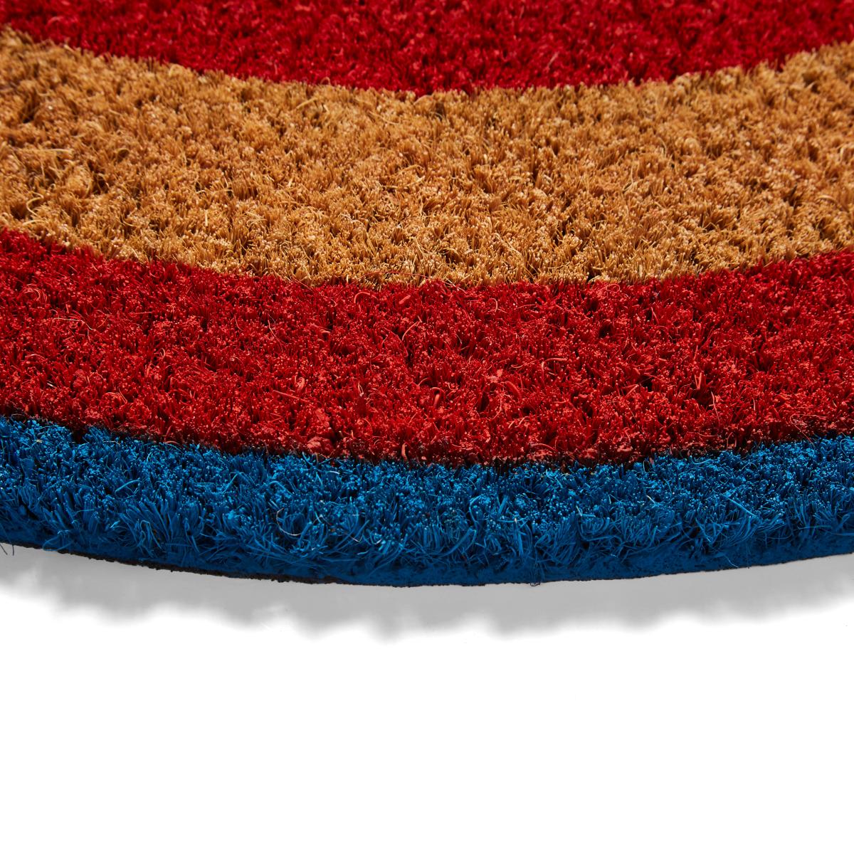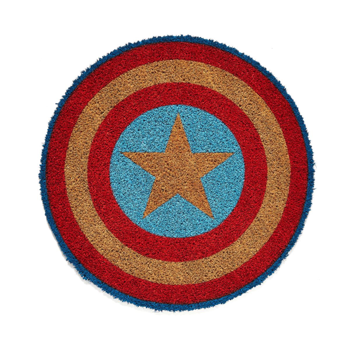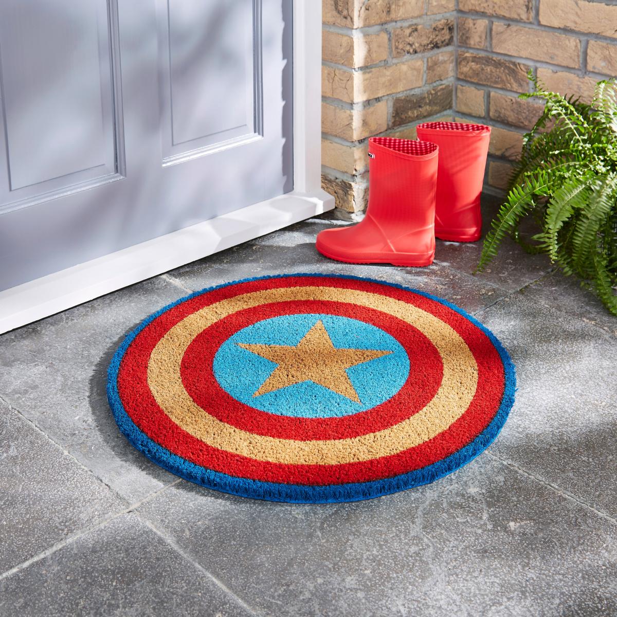 Welcome your house guests with this decorative and fun and doormat featuring a Captain America theme, circle shape and iconic shield design. This sturdy doormat is practical under a covered entrance as the coir fibre properties are resistant to mould and mildew and the thick rubber backing also creates an anti-slip effect. 5-year guarantee included. Care Guidelines: Do not Bend. Ideal for dirt removal. Not suitable for use on carpets. Do not place on light coloured flooring. Use under a covered entrance way to protect the mat from water and rain.