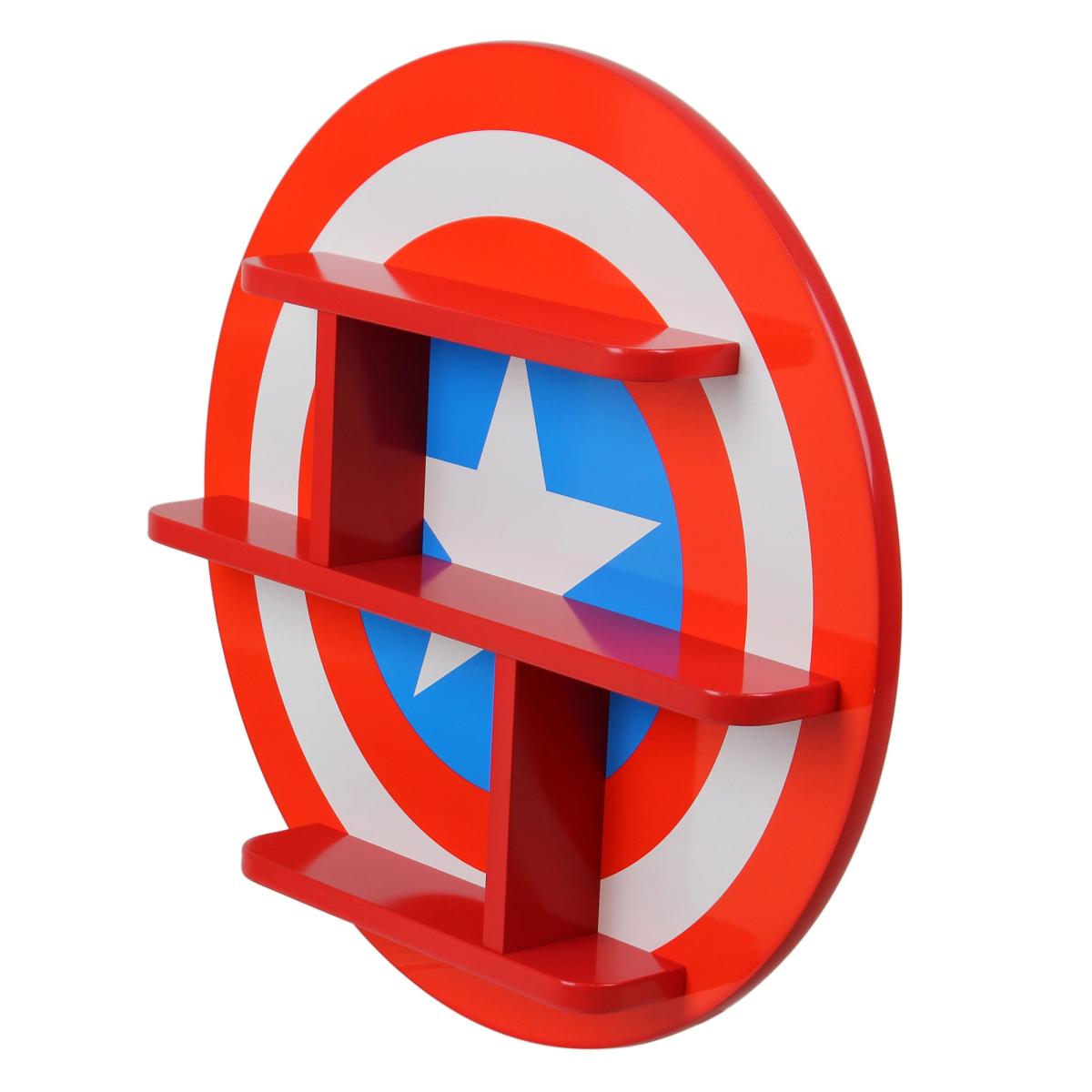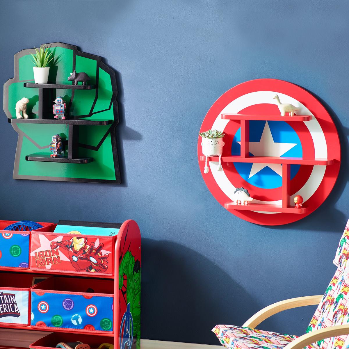 * 5 x Shelves* Wall mounted shelf* Silhouette design Inspired by the iconic Marvel character, Captain America, these wall shelves bring the excitement of superhero adventures right into your child's room. Crafted with attention to detail and featuring vibrant Captain America graphics, they add a touch of action and patriotism to any space.