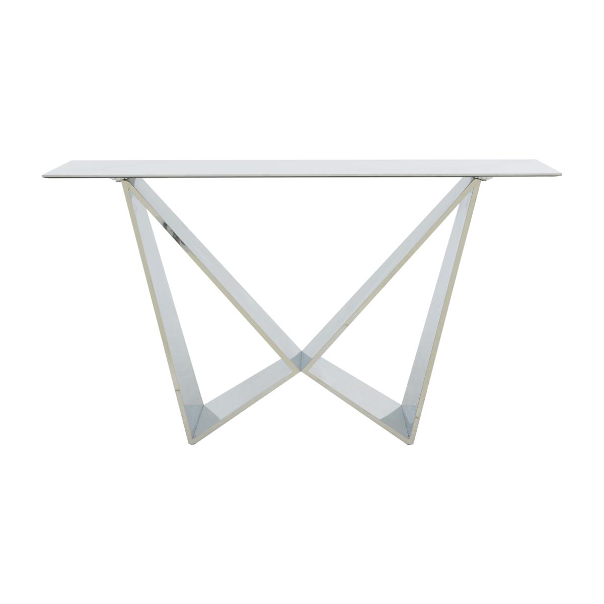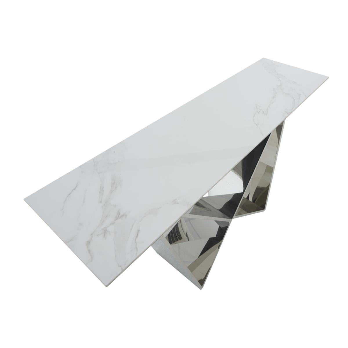 Can’t decide between bold urban style and modern glam luxury for your dining room? We have the very range for you. With glossy ceramic tops and artisan-made bases, our Marvel dining collection showcases statement style in a choice of two distinctly different looks for extending dining tables, dining sets, sideboards and occasional tables. Marvel Black features bold black iron bases that deliver a contemporary industrial vibe, while Marvel Chrome has high-shine chrome-effect bases for a gorgeously glam aesthetic. Each comes with its own style of elegant velvet-upholstered dining chair. Showstopping style two ways, only at Furniture Village. This glam console table makes any living room or hallway shine that bit brighter. A fabulous combination of glossy ceramic and polished metal. Why you'll love it. Statement console table gives any room the look of luxury. Modern glam style with showstopping design details. Stunning angular chrome-effect base. Glossy marbled top is made of real 12 mm ceramic that won’t fade. Practicality meets style – ceramic is heat-, scratch- and chip-resistant. Artisan-handcrafted and only at Furniture Village. This console table is part of the Marvel Chrome range. What you need to know. Chrome-effect base is made of polished stainless steel. The chrome-effect base may display weld marks or a wire-brushed effect. Please note that ceramic is not 100% heatproof. We recommend using coasters and placemats at all times. Easy to care for. Simply wipe with a clean damp cloth. Be sure to browse Marvel Black – it’s Marvel Chrome with an urban look. WARNING!. Furniture can tip over unexpectedly and cause injury. This item must be fixed to a wall using the anti-tip kit provided. Be sure to use the correct wall fixings suitable for the walls in your home. Furniture Village is not able to fix anti-tip devices for you. Seek professional advice if you are unsure.