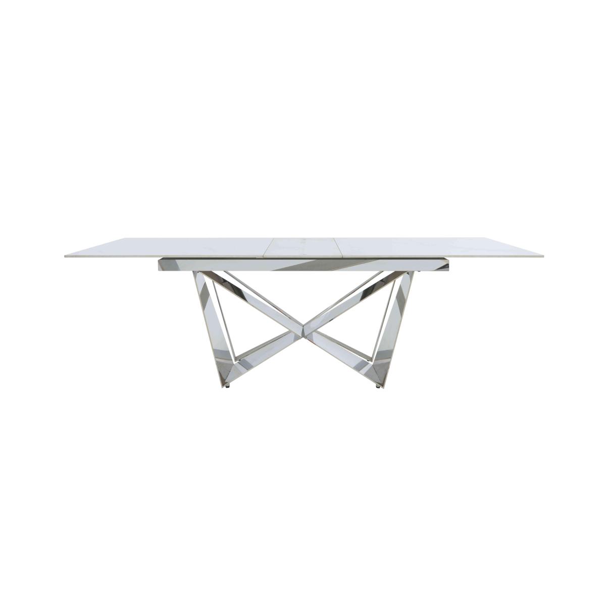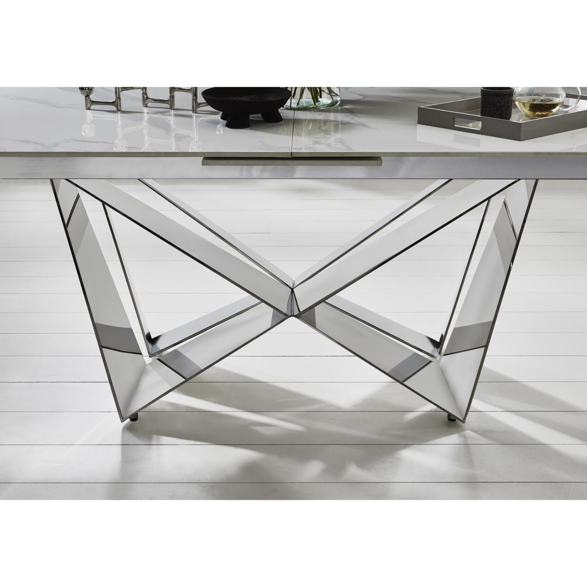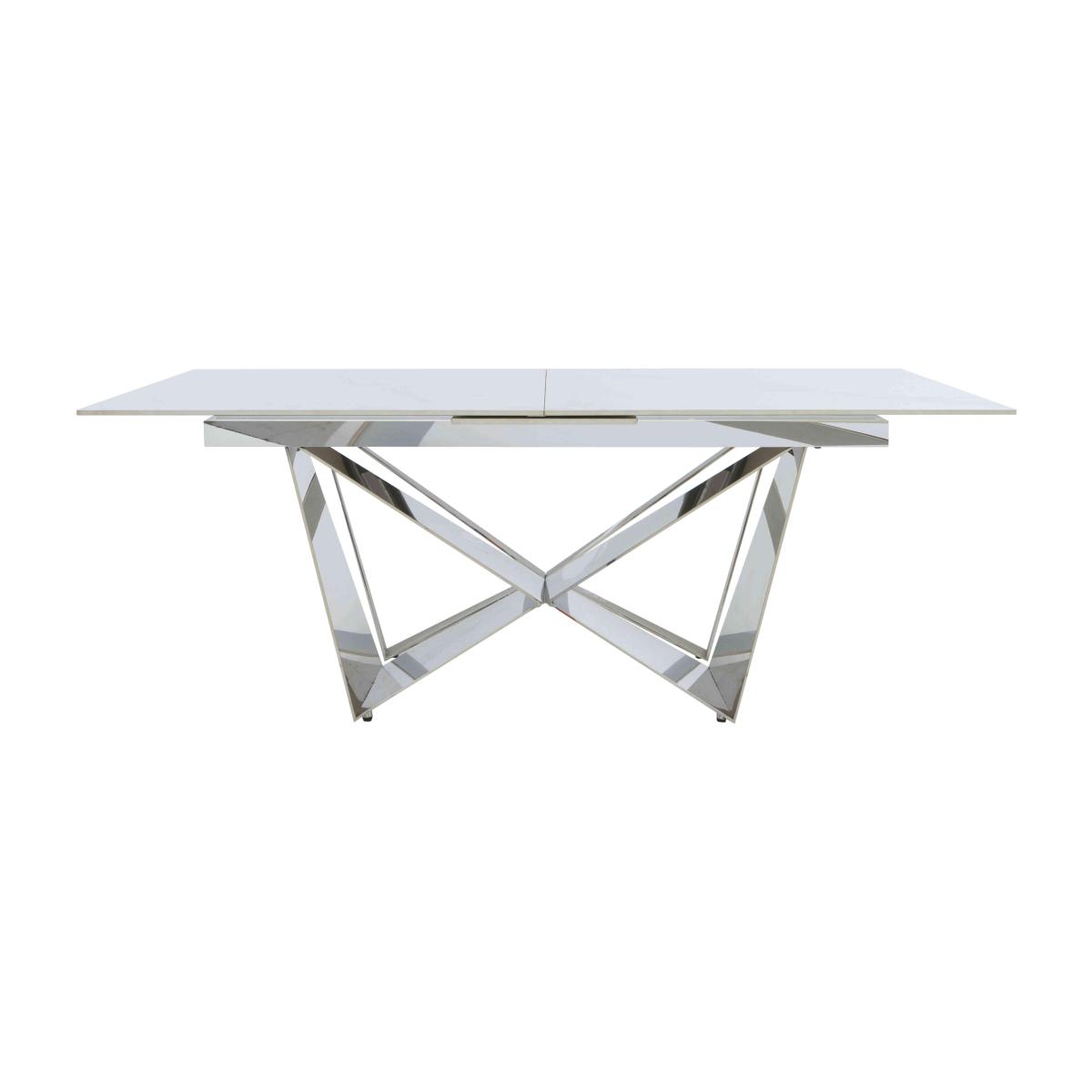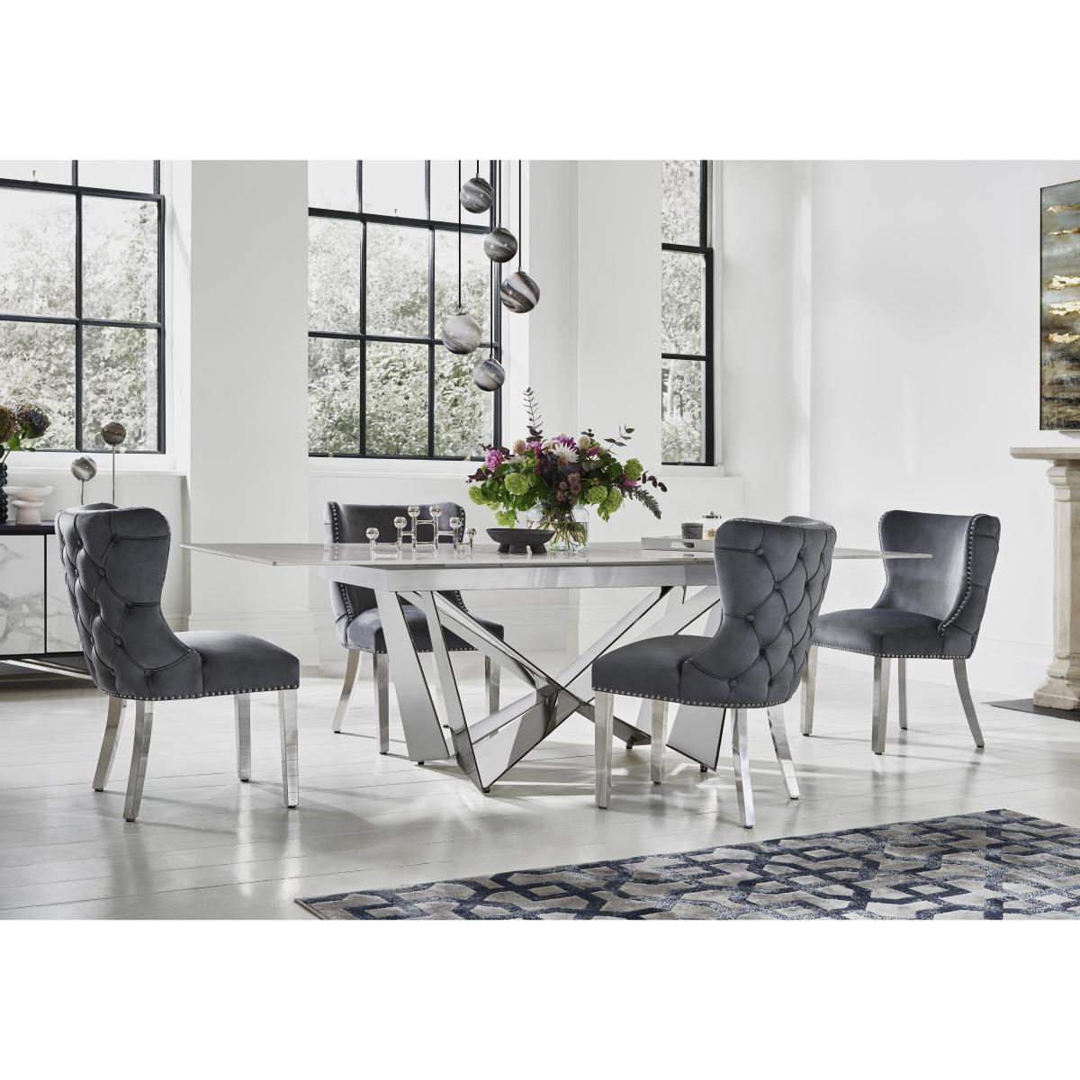 Can’t decide between bold urban style and modern glam luxury for your dining room? We have the very range for you. With glossy ceramic tops and artisan-made bases, our Marvel dining collection showcases statement style in a choice of two distinctly different looks for extending dining tables, dining sets, sideboards and occasional tables. Marvel Black features bold black iron bases that deliver a contemporary industrial vibe, while Marvel Chrome has high-shine chrome-effect bases for a gorgeously glam aesthetic. Each comes with its own style of elegant velvet-upholstered dining chair. Showstopping style two ways, only at Furniture Village. Designed to make an impact, this stunning dining table has an artisan-made chrome-effect base and a beautiful glossy ceramic top. Gorgeous glam style. Why you'll love it. Sleek and striking, this extending dining table redefines luxury dining. Modern glam style with showstopping design details. Stunning angular chrome-effect base. Glossy marbled top is made of real 12 mm ceramic that won’t fade. Practicality meets style – ceramic is heat-, scratch- and chip-resistant. The extra leaf pops up to extend the table in seconds. In 2 sizes. Artisan-handcrafted and only at Furniture Village. This extending dining table is part of the Marvel Chrome range. What you need to know. 160 cm table seats 4 when closed and 6 when extended. 200 cm table seats 6 when closed and 8 when extended. Tables are extremely heavy and should not be moved once in place. Chrome-effect base is made of polished stainless steel. The chrome-effect base may display weld marks or a wire-brushed effect. Please note that ceramic is not 100% heatproof. We recommend using coasters and placemats at all times. Easy to care for. Simply wipe with a clean damp cloth. Be sure to browse Marvel Black – it’s Marvel Chrome with an urban look.