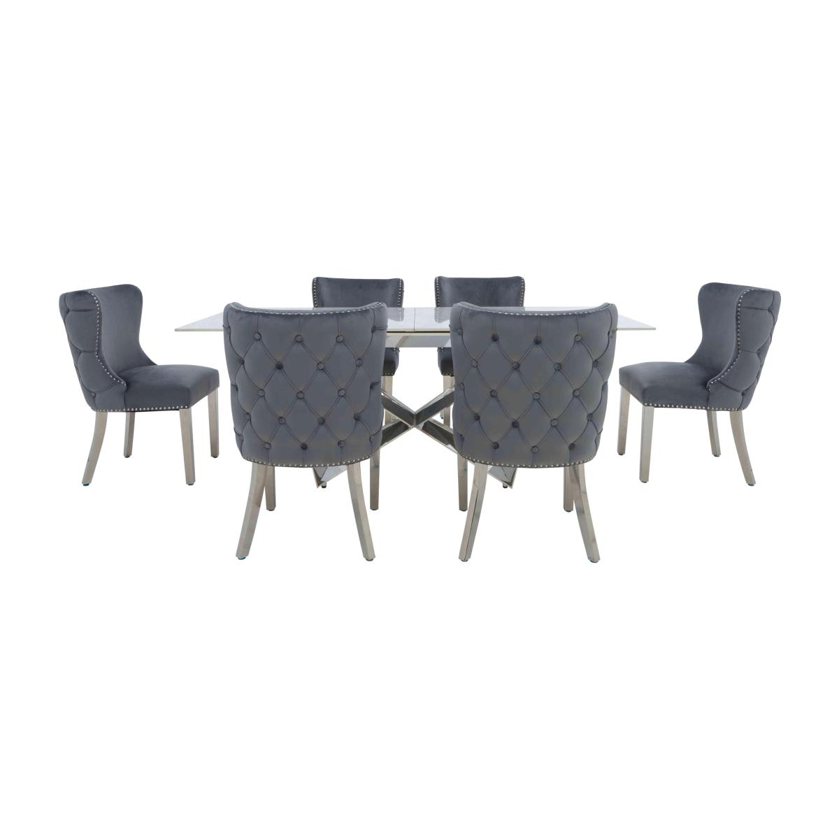 Can’t decide between bold urban style and modern glam luxury for your dining room? We have the very range for you. With glossy ceramic tops and artisan-made bases, our Marvel dining collection showcases statement style in a choice of two distinctly different looks for extending dining tables, dining sets, sideboards and occasional tables. Marvel Black features bold black iron bases that deliver a contemporary industrial vibe, while Marvel Chrome has high-shine chrome-effect bases for a gorgeously glam aesthetic. Each comes with its own style of elegant velvet-upholstered dining chair. Showstopping style two ways, only at Furniture Village. With its standout chrome-effect base and high-gloss ceramic top, this extending dining table is the perfect expression of luxury style. This dining set comes with six velvet dining chairs. Why you'll love it. Everything about this gorgeous dining set says luxury and elegance. Modern glam style with showstopping design details. Stunning angular chrome-effect base. Glossy marble-effect top is made of real 12 mm ceramic that won’t fade. Practicality meets style – ceramic is heat-, scratch- and chip-resistant. The extra leaf pops up to extend the table in seconds. With 6 statement button back dining chairs. Velvet upholstery in a choice of colours. Elegant details include chrome-effect legs and studding. Artisan-handcrafted and only at Furniture Village. This dining set is part of the Marvel Chrome range. What you need to know. Dining table seats 6 when closed and 8 when extended. This table is extremely heavy and should not be moved once in place. Chrome-effect base is made of polished stainless steel. The chrome-effect base may display weld marks or a wire-brushed effect. Please note that ceramic is not 100% heatproof. We recommend using coasters and placemats at all times. Easy to care for. Simply wipe with a clean damp cloth. Dining chairs are cushioned with foam. The flattening and shading of pile fabrics like velvet is unavoidable. Be sure to browse Marvel Black – it’s Marvel Chrome with an urban look.