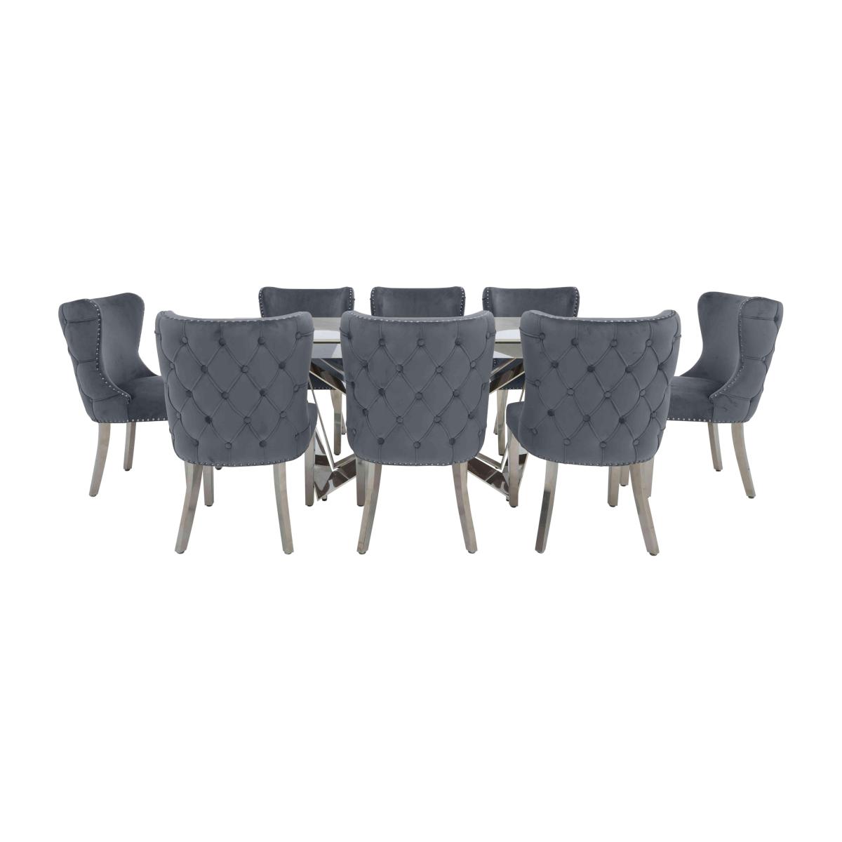 Can’t decide between bold urban style and modern glam luxury for your dining room? We have the very range for you. With glossy ceramic tops and artisan-made bases, our Marvel dining collection showcases statement style in a choice of two distinctly different looks for extending dining tables, dining sets, sideboards and occasional tables. Marvel Black features bold black iron bases that deliver a contemporary industrial vibe, while Marvel Chrome has high-shine chrome-effect bases for a gorgeously glam aesthetic. Each comes with its own style of elegant velvet-upholstered dining chair. Showstopping style two ways, only at Furniture Village. Large and luxurious, this fabulous dining set mixes and matches high-gloss, high-shine and velvet finishes. If you’re a lover of glam style this one’s for you. Why you'll love it. High-shine, high-gloss dining set is the essence of luxury dining. Modern glam style with showstopping design details. Stunning angular chrome-effect base. Glossy marble-effect top is made of real 12 mm ceramic that won’t fade. Practicality meets style – ceramic is heat-, scratch- and chip-resistant. The extra leaf pops up to extend the table in seconds. With 8 statement button back dining chairs. Velvet upholstery in a choice of colours. Elegant details include chrome-effect legs and studding. Artisan-handcrafted and only at Furniture Village. This dining set is part of the Marvel Chrome range. What you need to know. Dining table seats 6 when closed and 8 when extended. This table is extremely heavy and should not be moved once in place. Chrome-effect base is made of polished stainless steel. The chrome-effect base may display weld marks or a wire-brushed effect. Please note that ceramic is not 100% heatproof. We recommend using coasters and placemats at all times. Easy to care for. Simply wipe with a clean damp cloth. Dining chairs are cushioned with foam. The flattening and shading of pile fabrics like velvet is unavoidable. Be sure to browse Marvel Black – it’s Marvel Chrome with an urban look.
