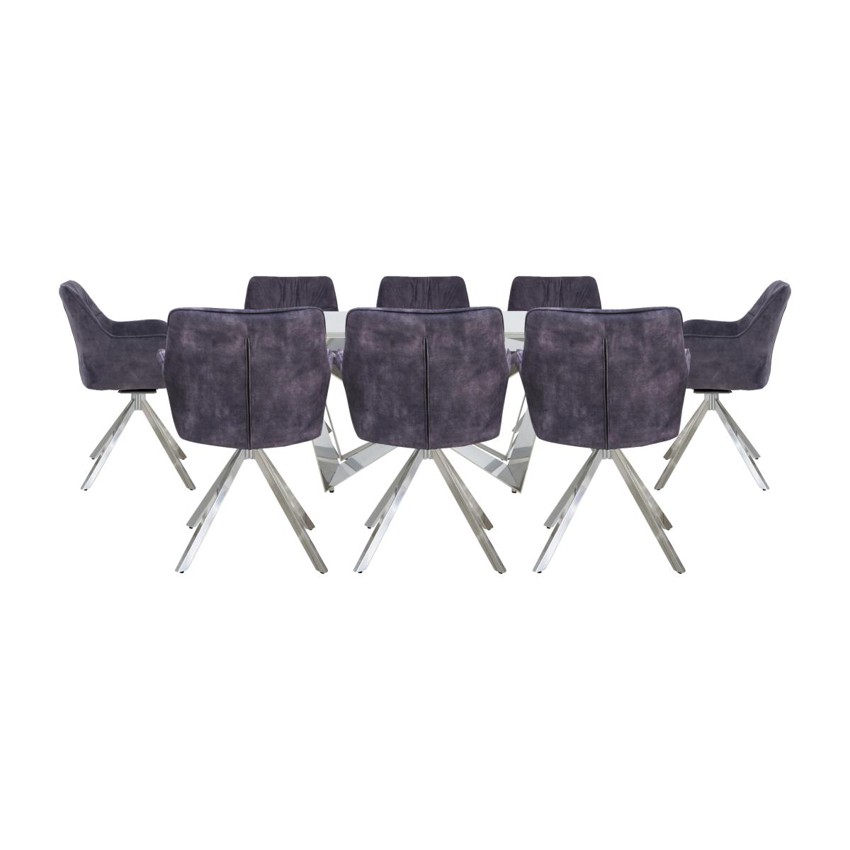 Can’t decide between bold urban style and modern glam luxury for your dining room? We have the very range for you. With glossy ceramic tops and artisan-made bases, our Marvel dining collection showcases statement style in a choice of two distinctly different looks for extending dining tables, dining sets, sideboards and occasional tables. Marvel Black features bold black iron bases that deliver a contemporary industrial vibe, while Marvel Chrome has high-shine chrome-effect bases for a gorgeously glam aesthetic. Each look includes its own velvet-upholstered swivel dining chairs. Showstopping style two ways, only at Furniture Village. For a luxury look, bring home this glam dining set. The extending dining table has a really striking chrome-effect base and extends to seat six. With a full set of eight swivel dining chairs. Why you'll love it This dining set with 8 swivel chairs is a real showstopper. Modern glam style with showstopping design details. Stunning angular chrome-effect base. Glossy marble-effect top is made of real 12 mm ceramic that won’t fade. Practicality meets style – ceramic is heat-, scratch- and chip-resistant. The extra leaf pops up to extend the table in seconds. With 8 well-cushioned and curvaceous swivel dining chairs. Velvet upholstery in a choice of colours. Chrome-effect metal swivel bases. Artisan-handcrafted and only at Furniture Village. This dining set is part of the Marvel Chrome range. What you need to know Dining table seats 4 when closed and 6 when extended. This table is extremely heavy and should not be moved once in place. Chrome-effect base is made of polished stainless steel. The chrome-effect base may display weld marks or a wire-brushed effect. Please note that ceramic is not 100% heatproof. We recommend using coasters and placemats at all times. Easy to care for. Simply wipe with a clean damp cloth. Dining chairs are cushioned with foam. The flattening and shading of pile fabrics like velvet is unavoidable. Be sure to browse Marvel Black – it’s Marvel Chrome with an urban look.