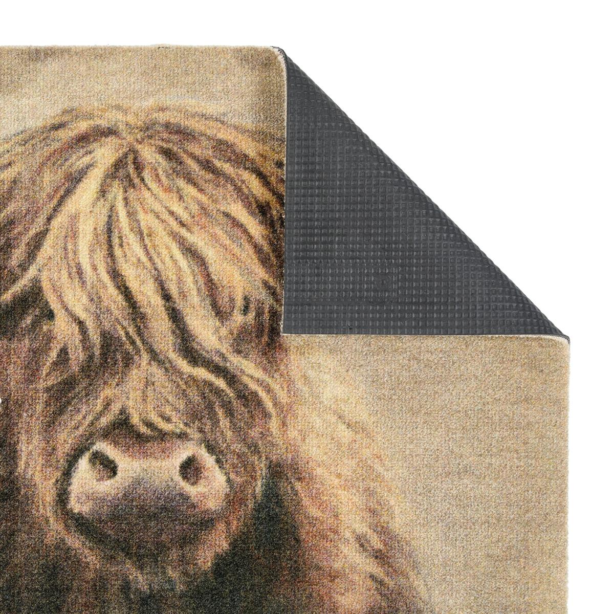 * Made with recycled materials* Machine washable* Highland Cow design* Anti-slip rubber backing with recycled content This gorgeous Highland Cow is ready to welcome people to your home and trap dirt at the door. In a black and natural colourway, this mat is fully machine washable for simple maintenance. The anti-slip backing ensures stability and safety and the soft pile gives a luxurious feel underfoot. Care Instructions: Machine washable at30°C, do not tumble dry.
