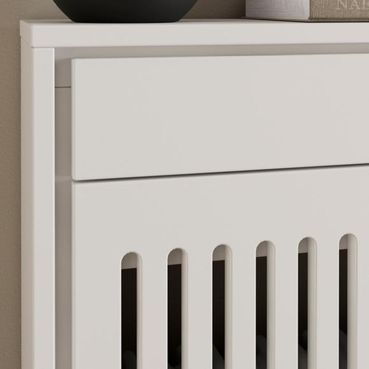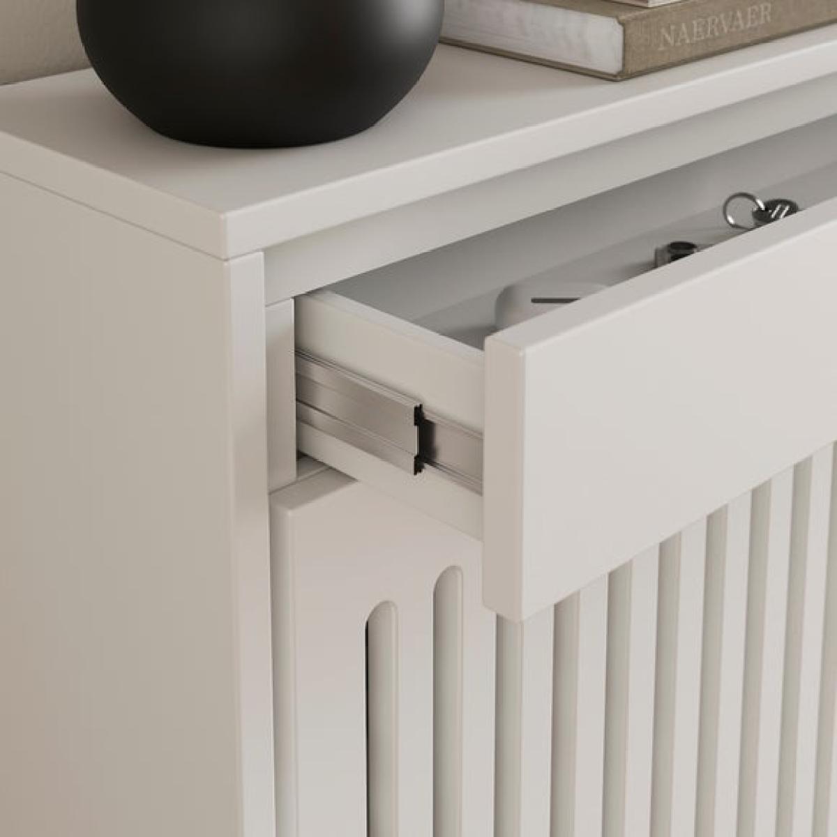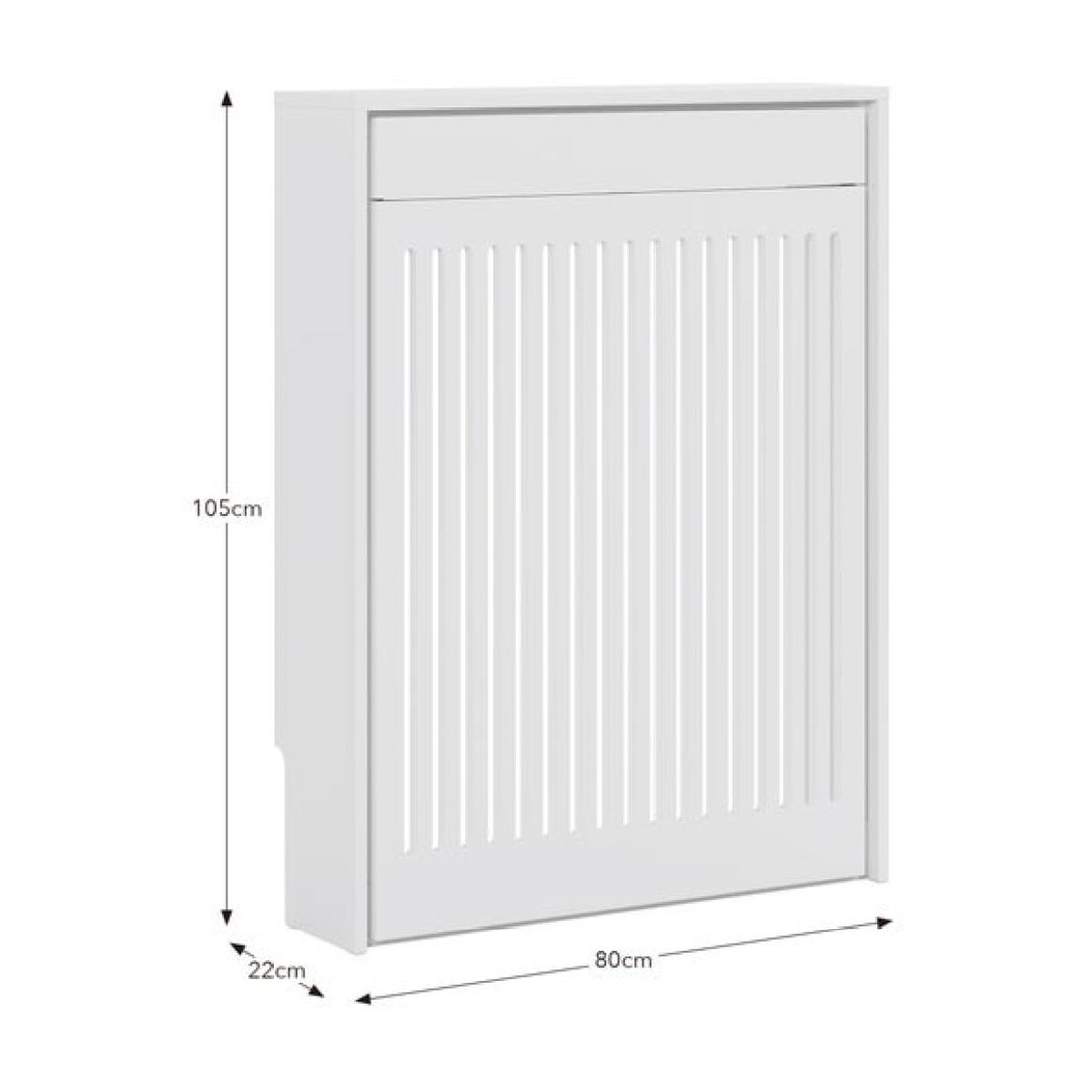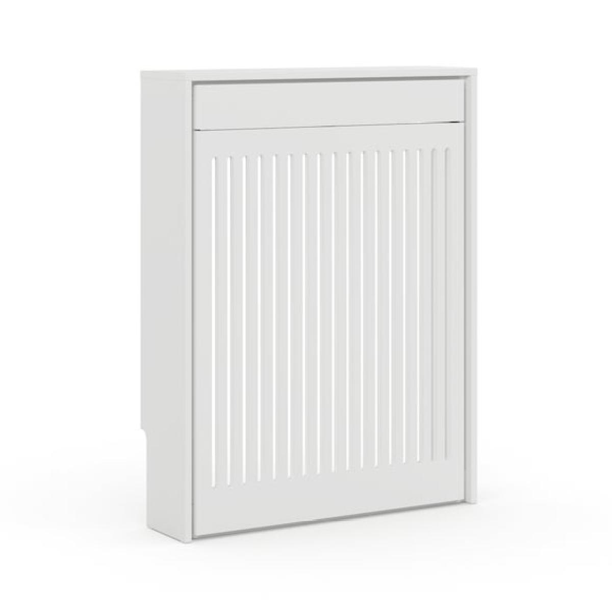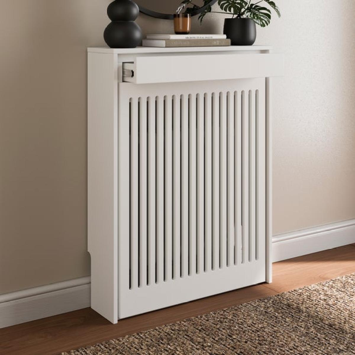 * Wooden radiator cover * Slim design * 1 large drawer Ideal for smaller spaces, this slim radiator cover combines clever design with subtle elegance. Complete with a handy drawer for extra storage, it’s finished in a soft misty white that complements any décor. A smart solution for keeping your space neat and stylish.