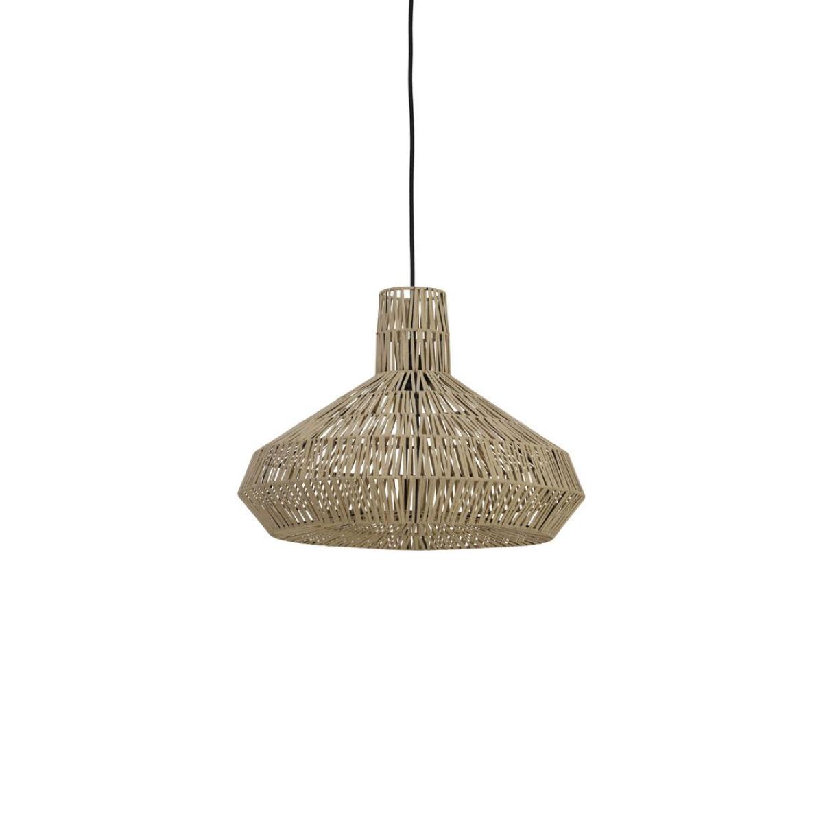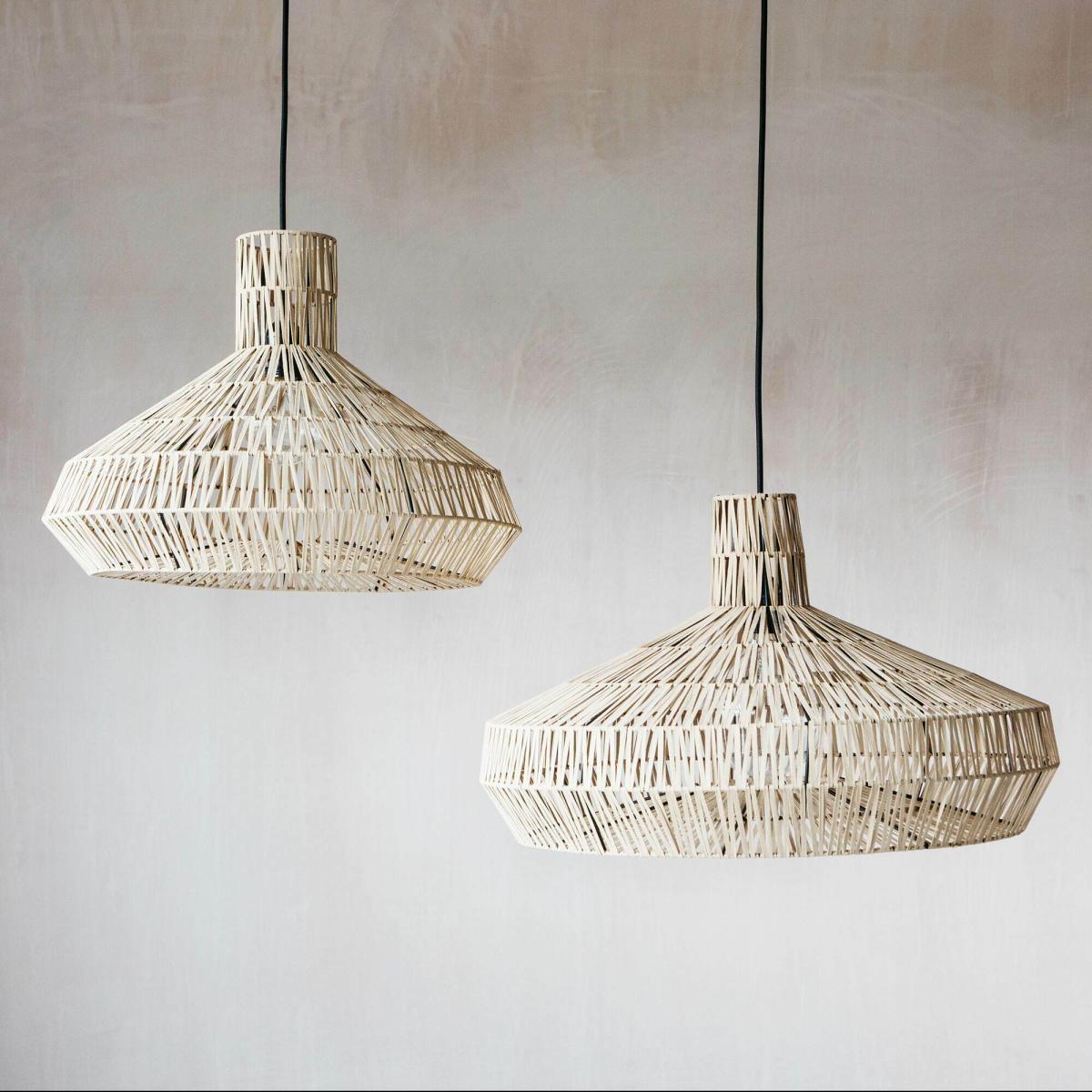 Amid layers of textural handwoven taupe leather and with a simple silhouette, the Masey pendant brings an artisan aesthetic to any pared back bohemian home. Available in two sizes.