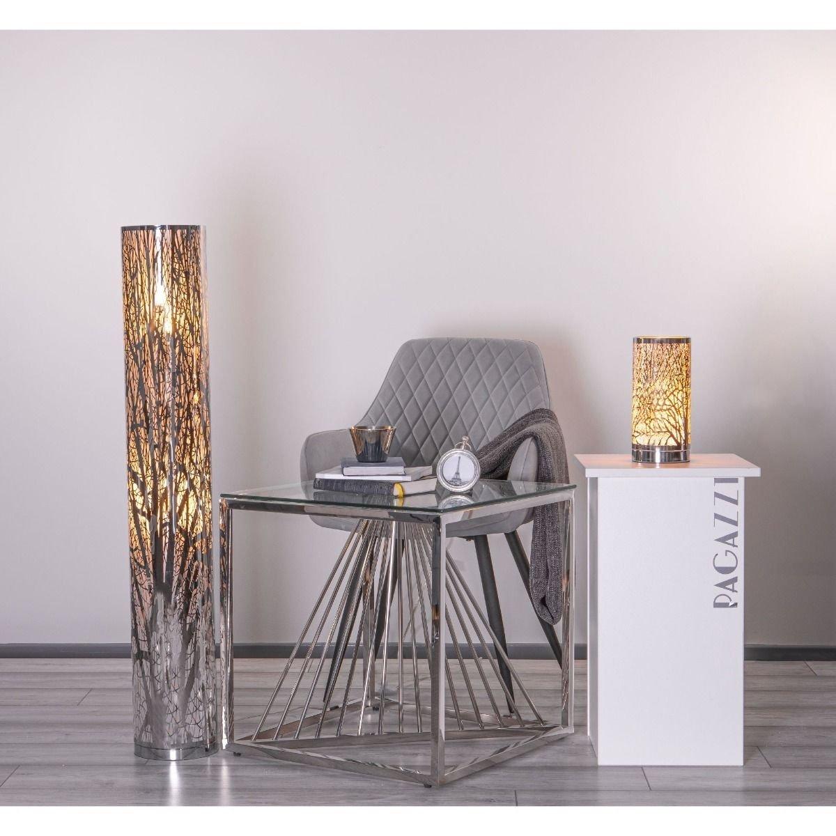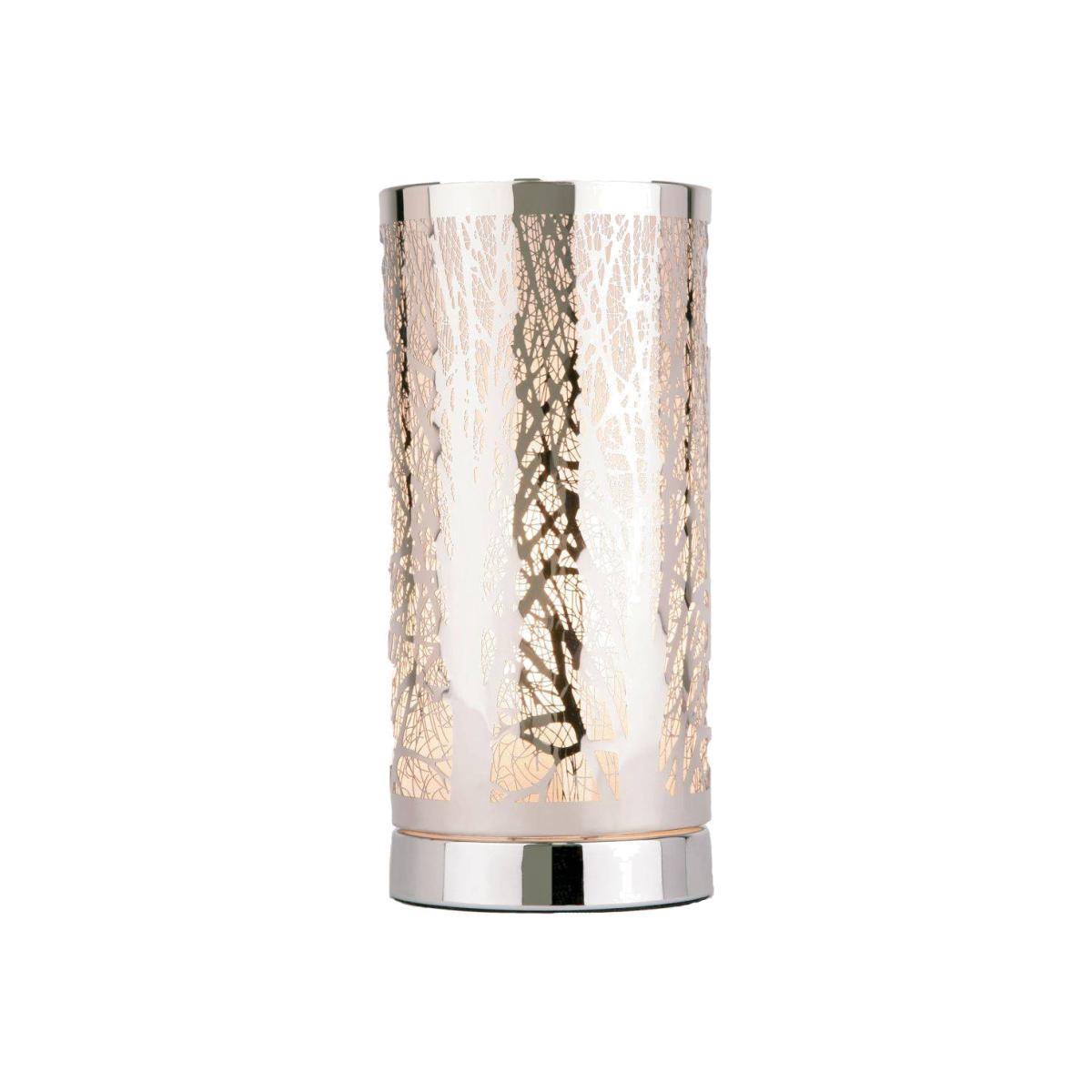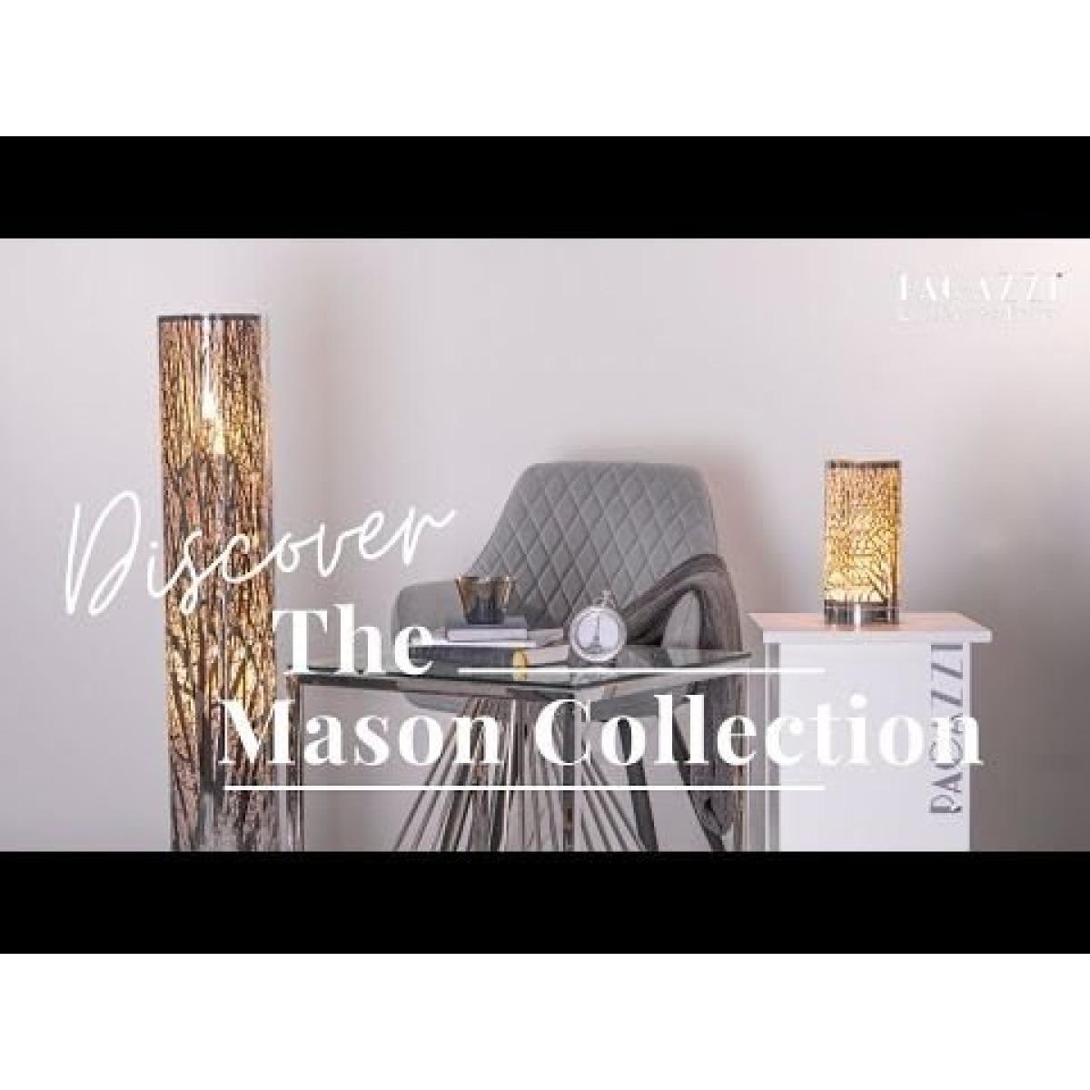 Mason Touch Table Lamp. The Mason Touch Table Lamp is a beautiful design from PAGAZZI Lighting. The unique lamp features a cylinder shade with a unique pattern. The frosted section has an unstructured, branch-like pattern in polished chrome which gives the lamp a unique and edgy finish.