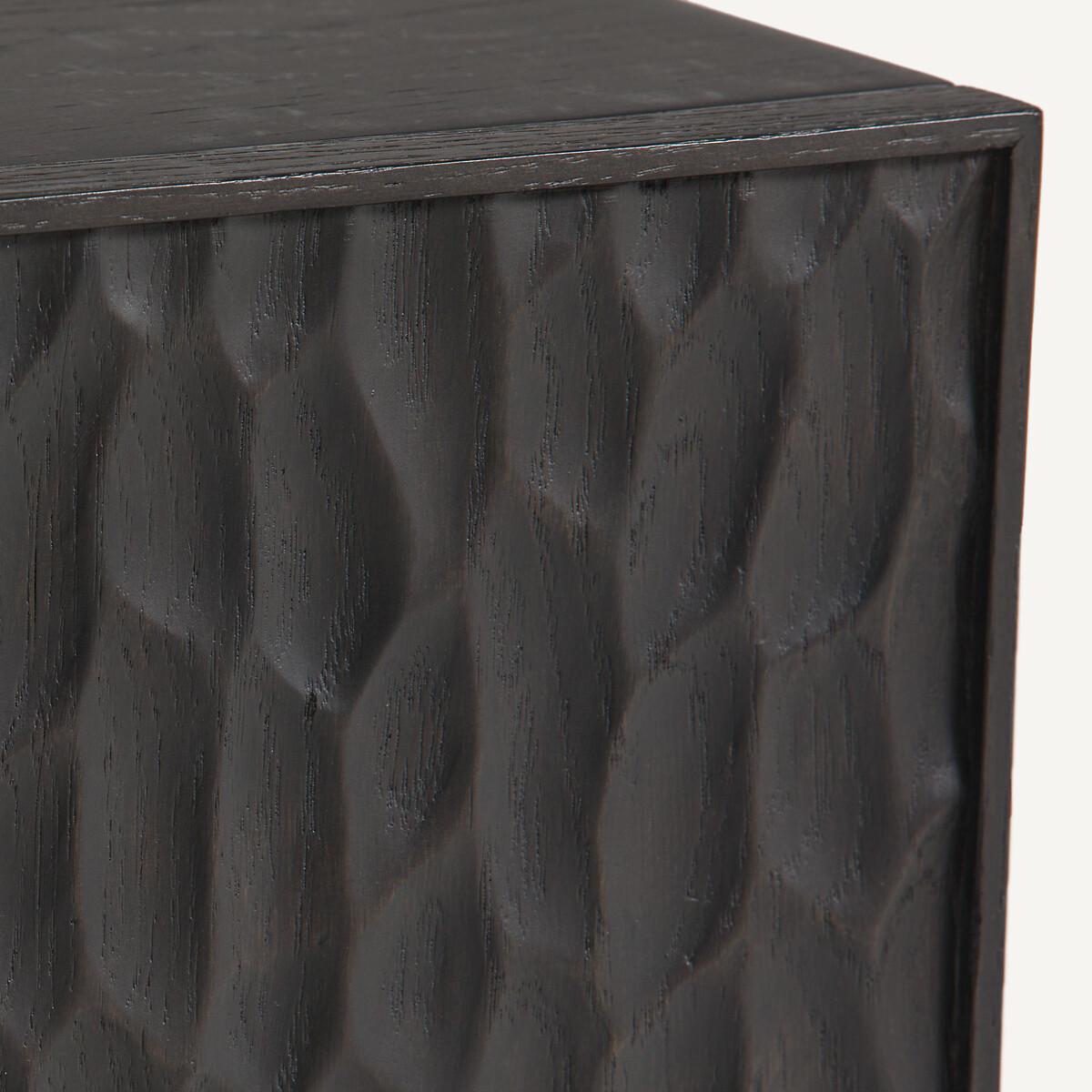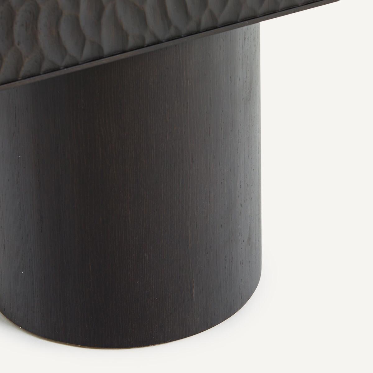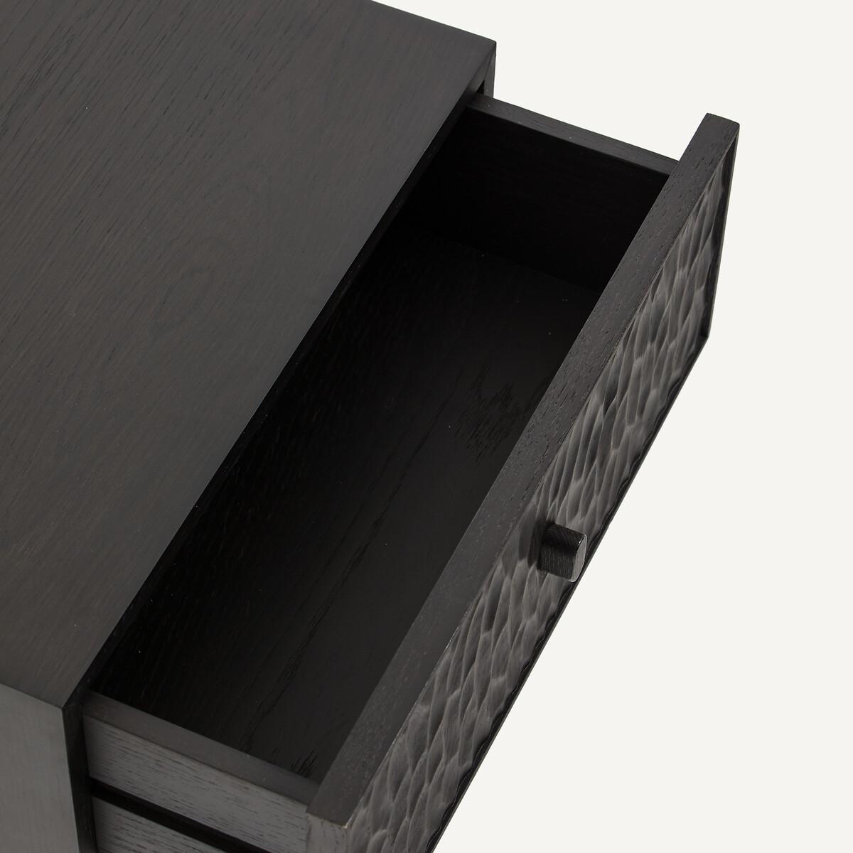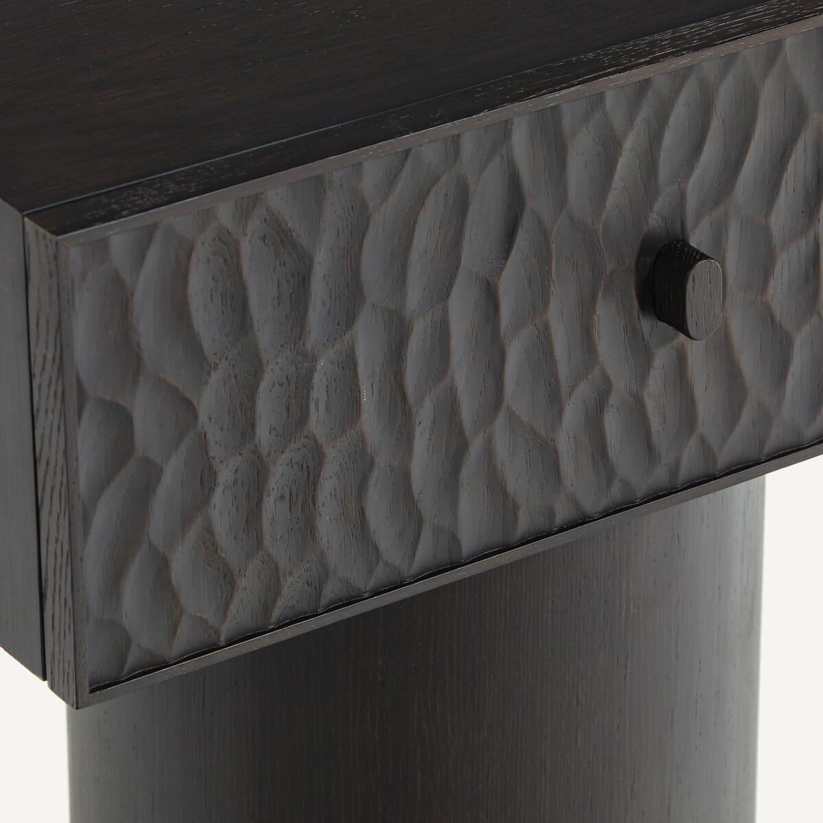 The Mason bedside table is made up of two simple, contrasting volumes in Coffee stained oak. The front of the thick drawer block is covered with an elegant texture, hollowed out, and the base is smooth and round. Mason is as aesthetic as it is practical with its large sliding drawer. The work on its surface makes each piece of furniture unique and authentic.. Every side can be seen, even the back. A contemporary and sophisticated piece, an AMPM signature. Product Details • Box and drawer in solid oak and oak veneered MDF, stained Coffee Grill • Drawer front in solid oak carved in the manner of a gouge Each piece is unique and the relief can be more or less marked. • Base in MDF with oak veneer, Coffee toast stain • Drawer with oak handle • Polyurethane finish • FSC® Mixed certified wood Care Advice • We recommend wiping up any spilled liquid immediately. Quality Info • Wood is a living material. The differences in shades, grains and knots reinforce its character and authenticity.. Over time it may crack slightly. It is a process caused by variations in temperature and humidity. Dimensions. Overall • Width: 48cm • Height: 49cm • Depth: 33.7cm. Usable space • Drawer: W48 x H17 x D29.5 cm • Sold pre-assembled. • WOOD FROM MORE SUSTAINABLY MANAGED FORESTS AND CONTROLLED SOURCES. FSC® Mix wood contains at least 70% FSC® certified and/or recycled wood, the remainder being FSC® controlled wood. Dimensions and weight of parcel1 parcel • W57 x H55 x D40 cm, 18 kg