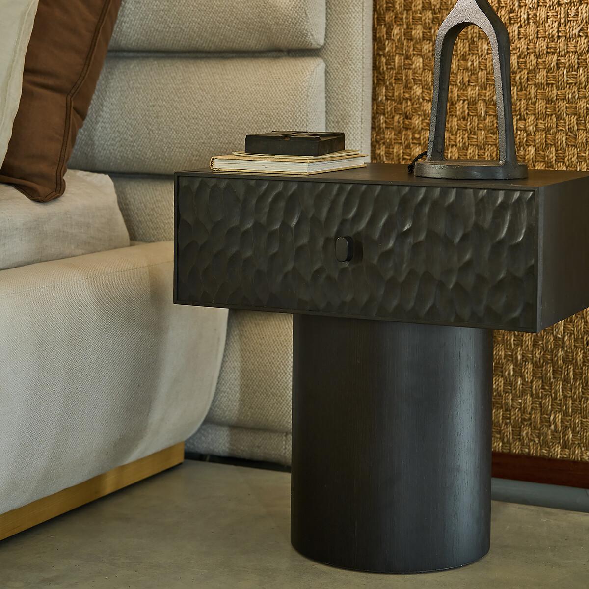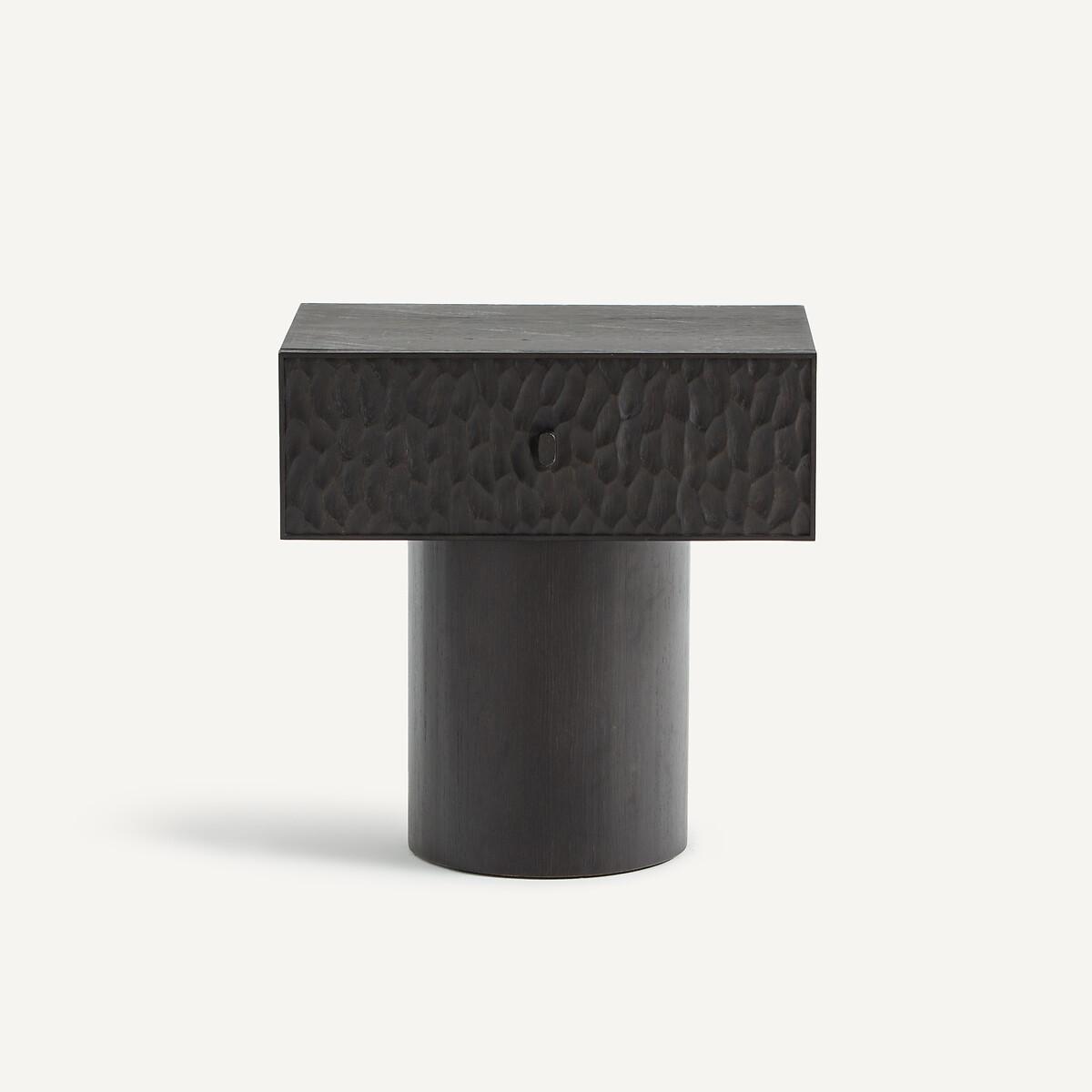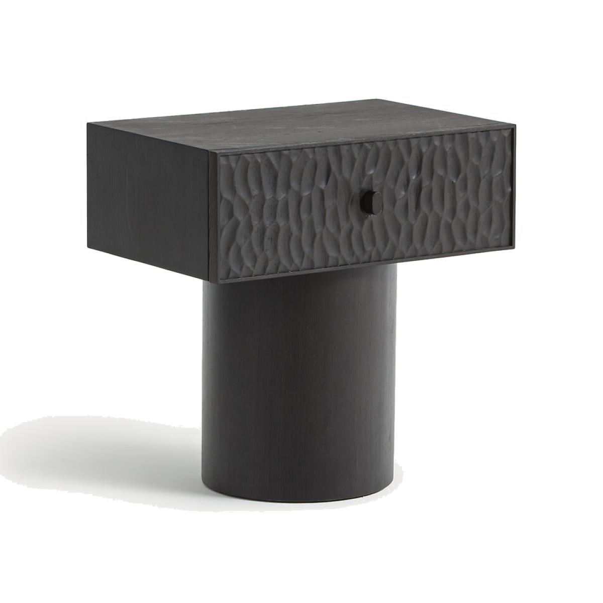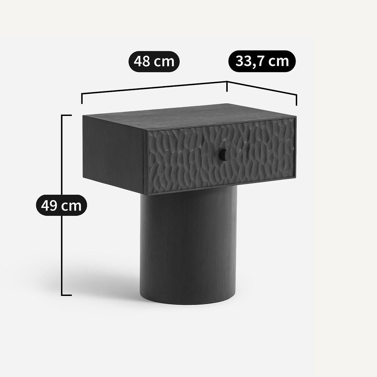 The Mason bedside table is made up of two simple, contrasting volumes in Coffee stained oak. The front of the thick drawer block is covered with an elegant texture, hollowed out, and the base is smooth and round. Mason is as aesthetic as it is practical with its large sliding drawer. The work on its surface makes each piece of furniture unique and authentic.. Every side can be seen, even the back. A contemporary and sophisticated piece, an AMPM signature. Product Details • Box and drawer in solid oak and oak veneered MDF, stained Coffee Grill • Drawer front in solid oak carved in the manner of a gouge Each piece is unique and the relief can be more or less marked. • Base in MDF with oak veneer, Coffee toast stain • Drawer with oak handle • Polyurethane finish • FSC® Mixed certified wood Care Advice • We recommend wiping up any spilled liquid immediately. Quality Info • Wood is a living material. The differences in shades, grains and knots reinforce its character and authenticity.. Over time it may crack slightly. It is a process caused by variations in temperature and humidity. Dimensions. Overall • Width: 48cm • Height: 49cm • Depth: 33.7cm. Usable space • Drawer: W48 x H17 x D29.5 cm • Sold pre-assembled. • WOOD FROM MORE SUSTAINABLY MANAGED FORESTS AND CONTROLLED SOURCES. FSC® Mix wood contains at least 70% FSC® certified and/or recycled wood, the remainder being FSC® controlled wood. Dimensions and weight of parcel1 parcel • W57 x H55 x D40 cm, 18 kg