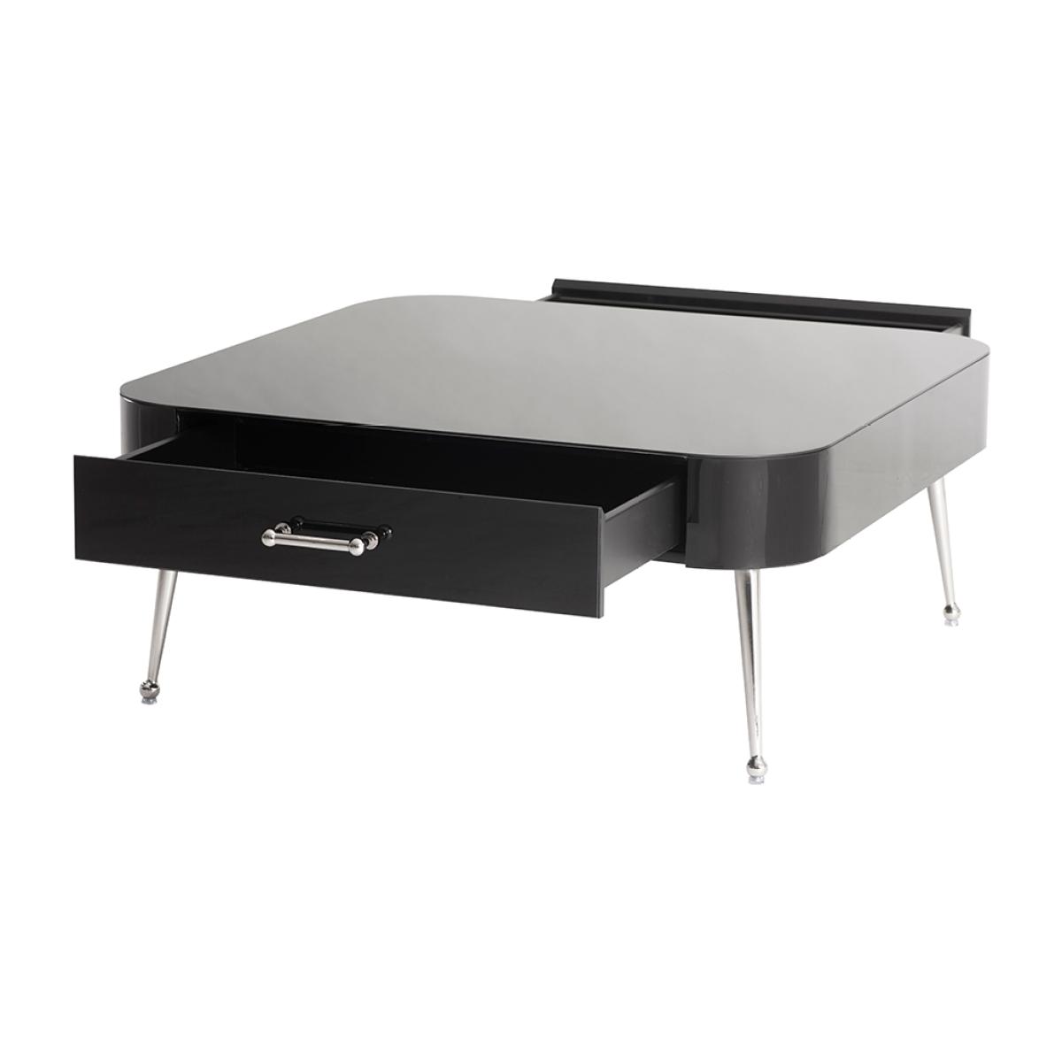 Elegant coffee table Inspired by highly collectable Mid-Century American furniture. Toughened black glass with distinctive curved corners. Two drawers with soft close drawer runners. Polished stainless steel legs and handle. Assembly required – approximately 10 minutes.