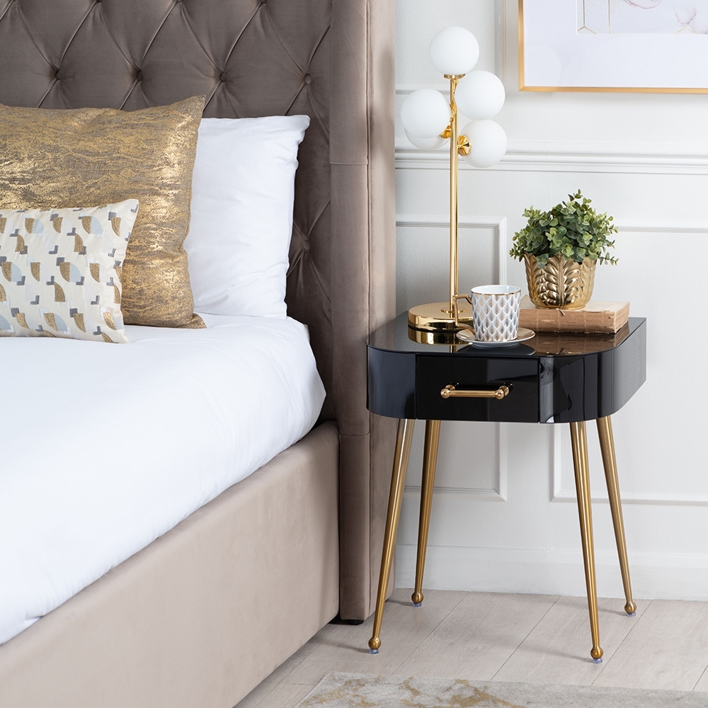I love this black glass side table because of its sleek, contemporary look combined with the metallic gold legs, which add a touch of luxury. It works particularly well in modern or eclectic interiors that blend sophistication with bold design elements. For styling, consider using it beside a neutral sofa to create a striking contrast, or pair it with other gold accents to tie a room’s colour palette together. Practical tips include using it as a chic surface for a lamp, a small plant, or a favourite book - its compact size makes it versatile without cluttering the space. Its mix of materials makes it adaptable, whether in a living room corner or as a bedside table in a bedroom with a contemporary aesthetic.