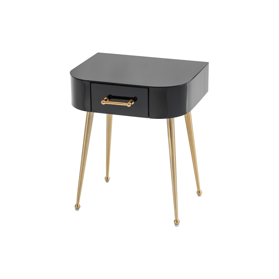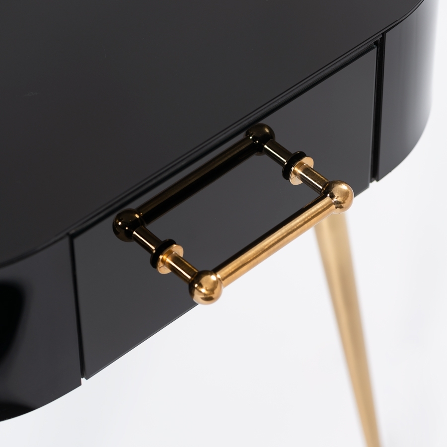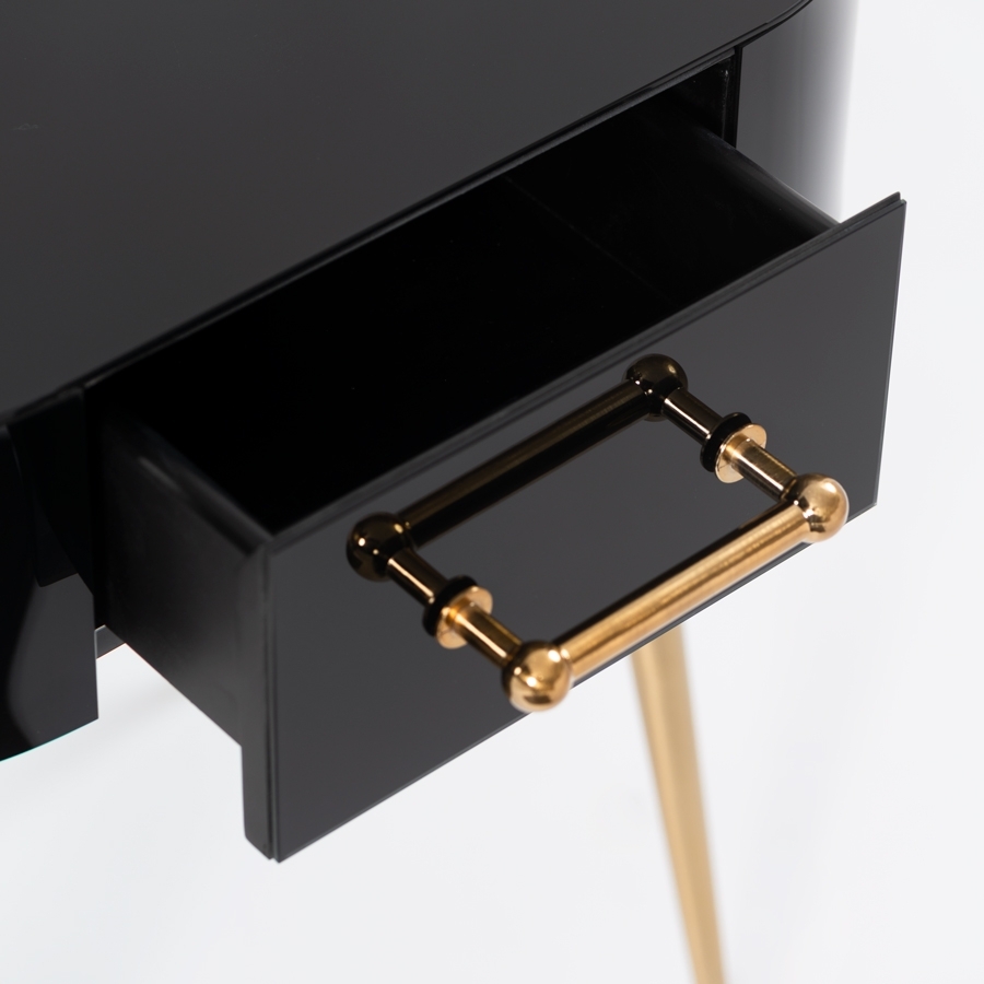 Toughened black glass with distinctive curved corners Soft close drawer runners Brushed stainless steel legs and handle with brass finish Assembly required - approximately 10 minutes