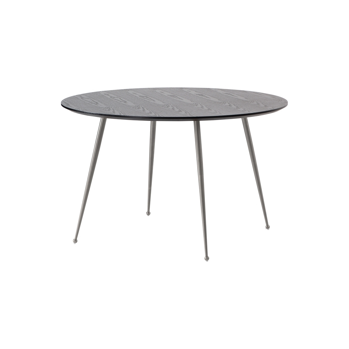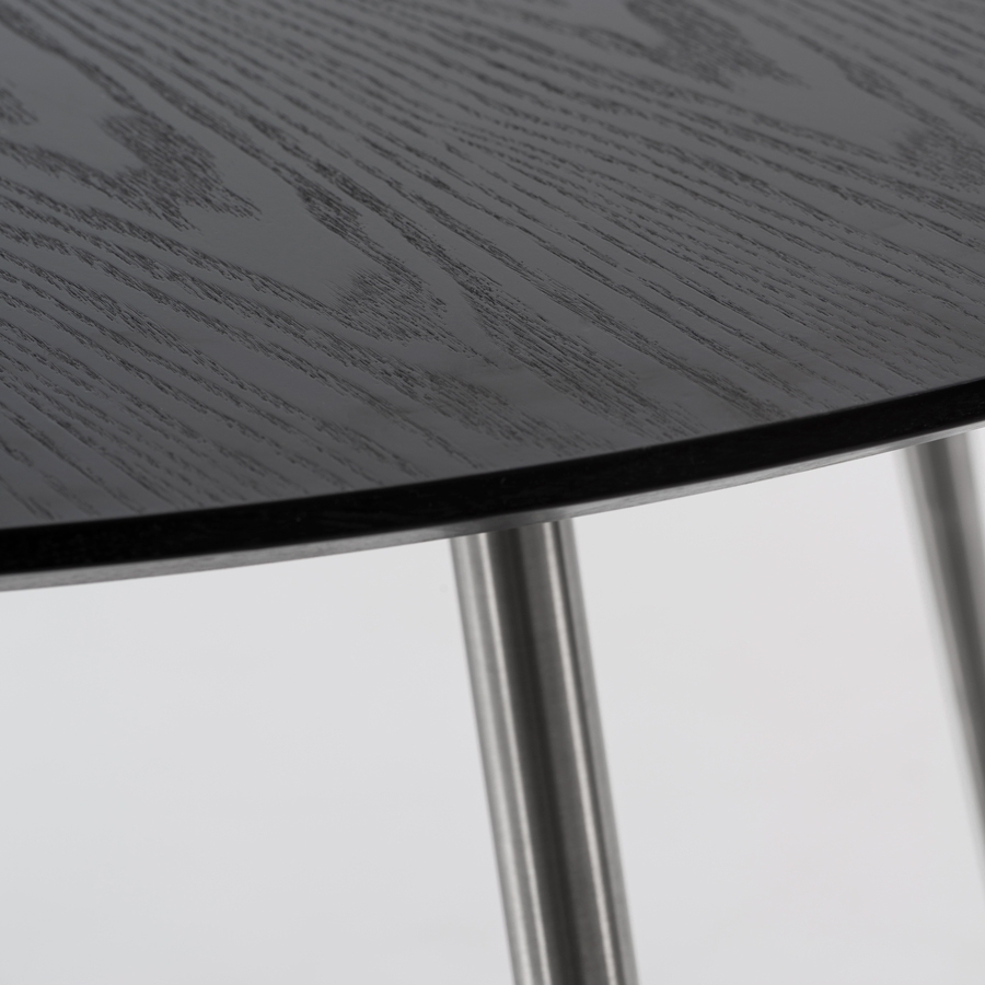 Elegant dining table Inspired by highly collectable Mid-Century American furniture. Solid ash and ash veneer with black stain and satin lacquer finish. Brushed stainless steel legs. Comfortable seats four people. Assembly required – approximately 10 minutes.