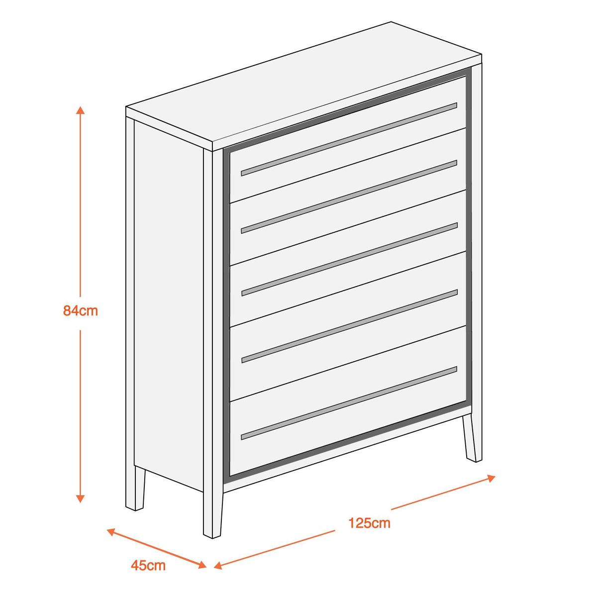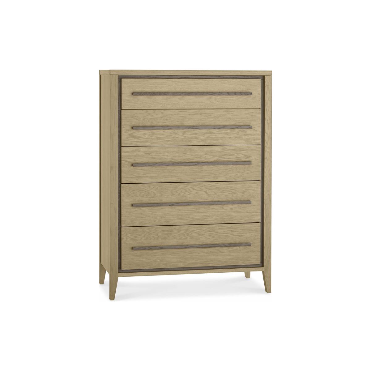 Offering five drawers with beech wood strip handles and angled legs, this wooden chest of drawers features a weathered finish and is crafted with solid white oak and oak veneer.