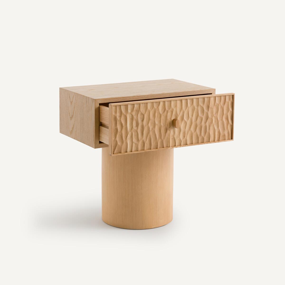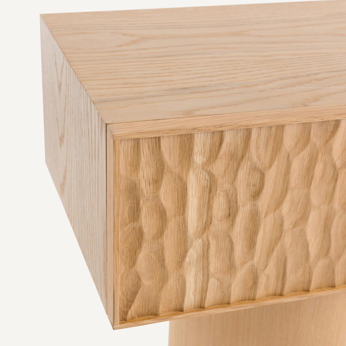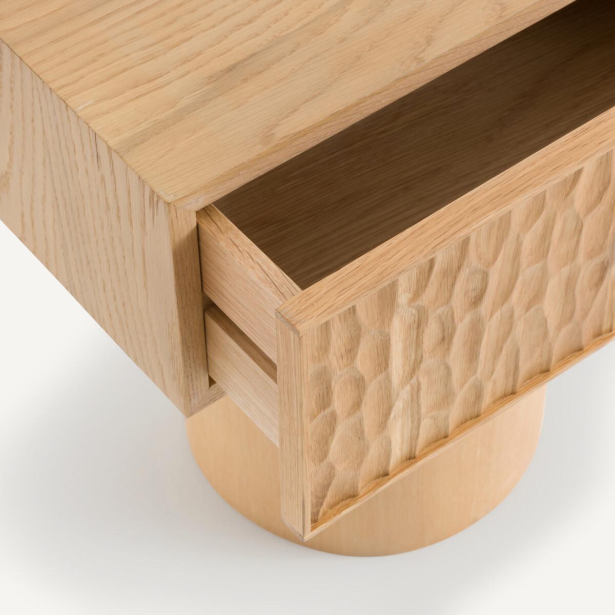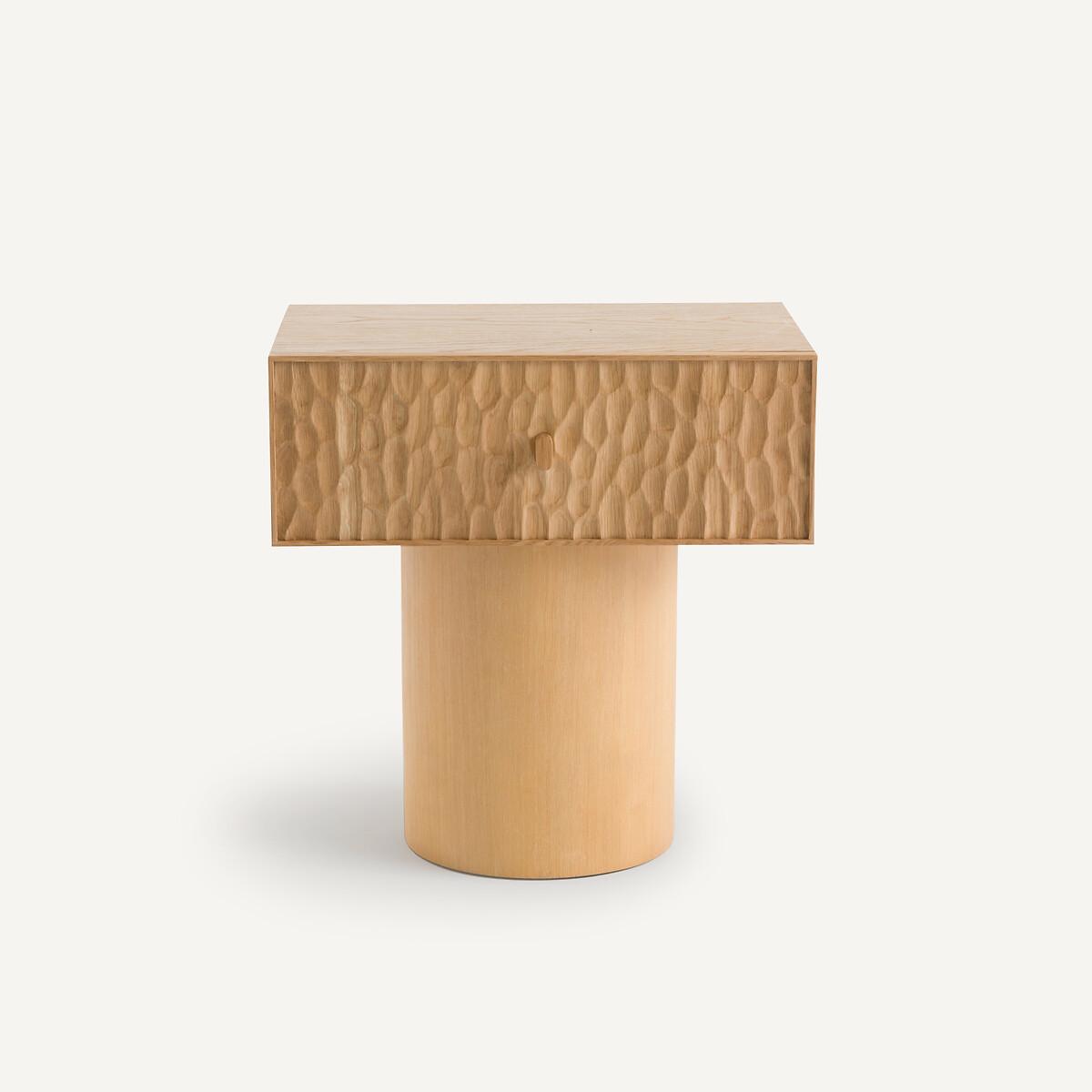 Two simple and contrasting volumes, in oak, make up the Mason bedside table. The front of the thick drawer block is covered with an elegant texture, hollowed out, and the base is smooth and round. Mason is as aesthetic as it is practical with its large sliding drawer. The work on its surface makes each piece of furniture unique and authentic. Every side can be seen, even the back. A contemporary and sophisticated piece, an AMPM signature. Product Details • Unit in oak-veneered MDF. • Drawer front in solid oak hollowed out with gouges. Each piece is unique, the reliefs can be more or less marked. • Solid oak base. • 1 drawer with oak handle. • Polyurethane finish. Care Advice • We recommend wiping up any spilled liquid immediately. Quality Info • Wood is a living material. The differences in shades, grains and knots reinforce its character and authenticity.. Over time it may crack slightly. It is a process caused by variations in temperature and humidity. Dimensions. Overall • Width: 48cm • Height: 49cm • Depth: 33.7cm. Drawer • Usable height: 16cmDelivery:. Sold pre-assembled. Available for home delivery. • WOOD FROM MORE SUSTAINABLY MANAGED FORESTS AND CONTROLLED SOURCES. FSC® Mix wood contains at least 70% FSC® certified and/or recycled wood, the remainder being FSC® controlled wood. Dimensions and weight of parcel • 1 parcel • L57 x H55 x D40cm. 18kg.