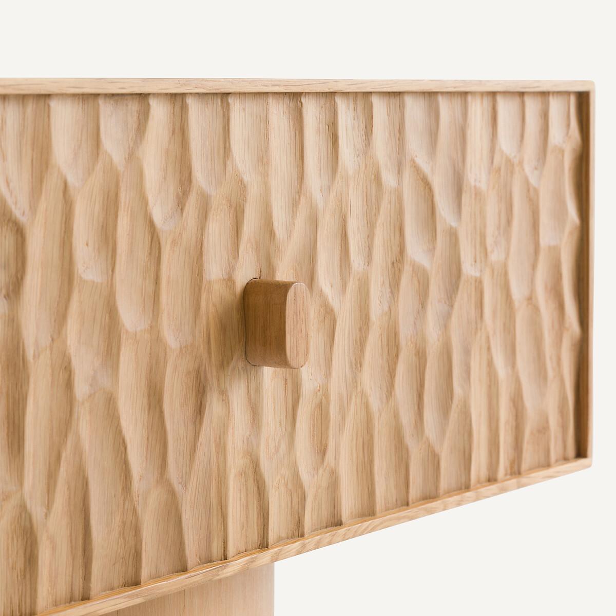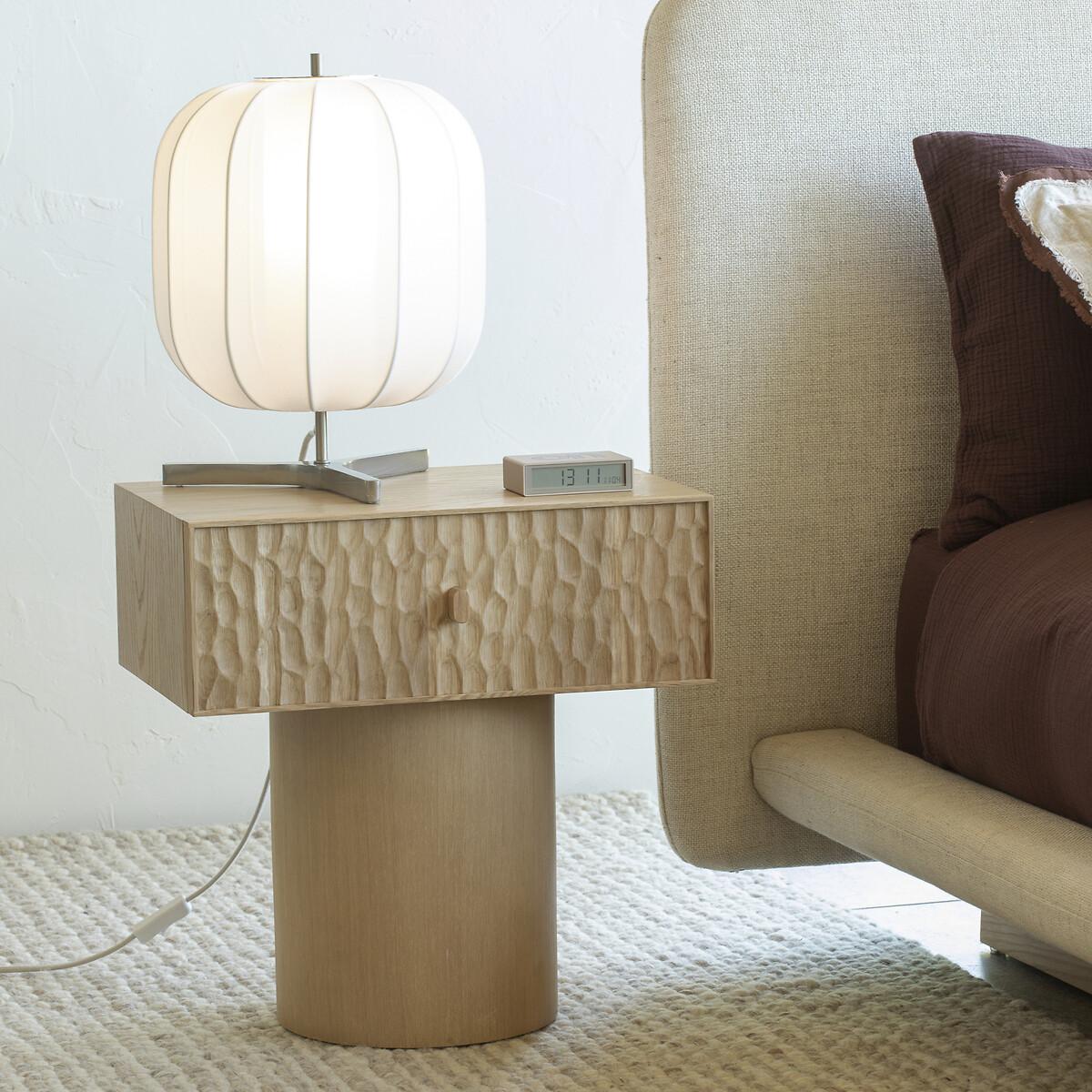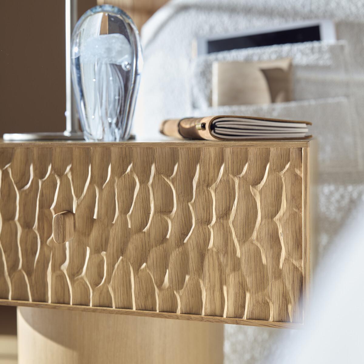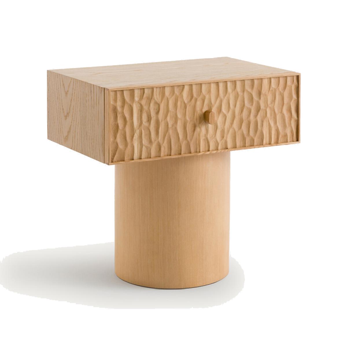 Two simple and contrasting volumes, in oak, make up the Mason bedside table. The front of the thick drawer block is covered with an elegant texture, hollowed out, and the base is smooth and round. Mason is as aesthetic as it is practical with its large sliding drawer. The work on its surface makes each piece of furniture unique and authentic. Every side can be seen, even the back. A contemporary and sophisticated piece, an AMPM signature. Product Details • Unit in oak-veneered MDF. • Drawer front in solid oak hollowed out with gouges. Each piece is unique, the reliefs can be more or less marked. • Solid oak base. • 1 drawer with oak handle. • Polyurethane finish. Care Advice • We recommend wiping up any spilled liquid immediately. Quality Info • Wood is a living material. The differences in shades, grains and knots reinforce its character and authenticity.. Over time it may crack slightly. It is a process caused by variations in temperature and humidity. Dimensions. Overall • Width: 48cm • Height: 49cm • Depth: 33.7cm. Drawer • Usable height: 16cmDelivery:. Sold pre-assembled. Available for home delivery. • WOOD FROM MORE SUSTAINABLY MANAGED FORESTS AND CONTROLLED SOURCES. FSC® Mix wood contains at least 70% FSC® certified and/or recycled wood, the remainder being FSC® controlled wood. Dimensions and weight of parcel • 1 parcel • L57 x H55 x D40cm. 18kg.
