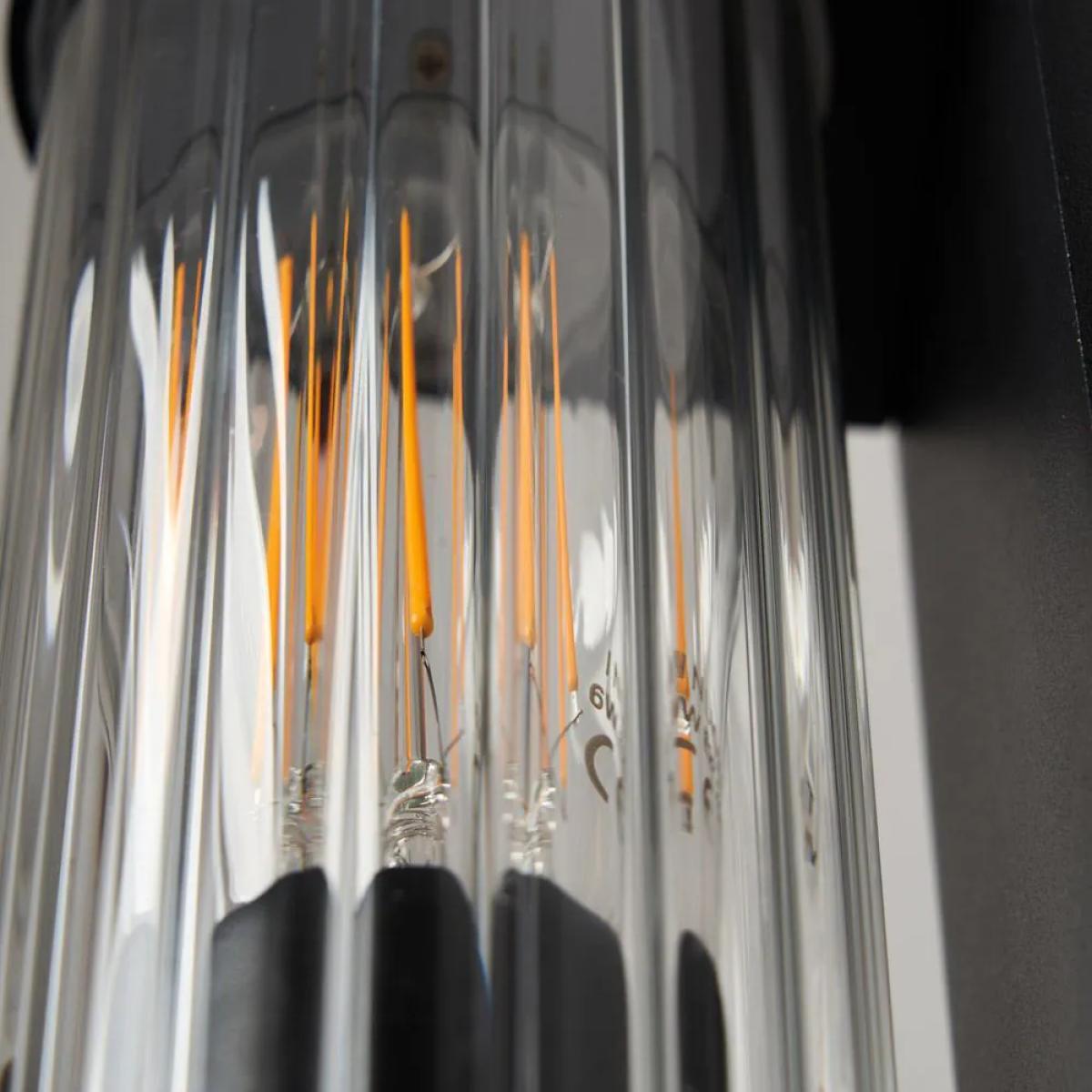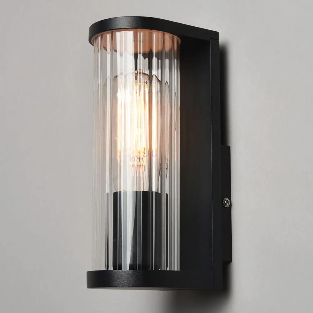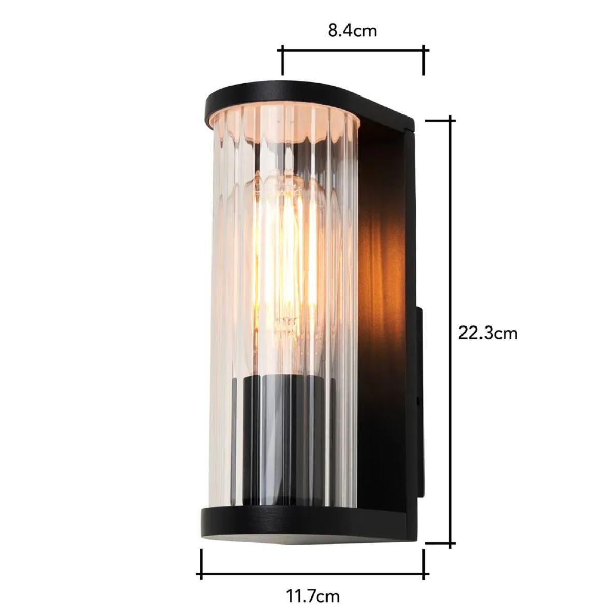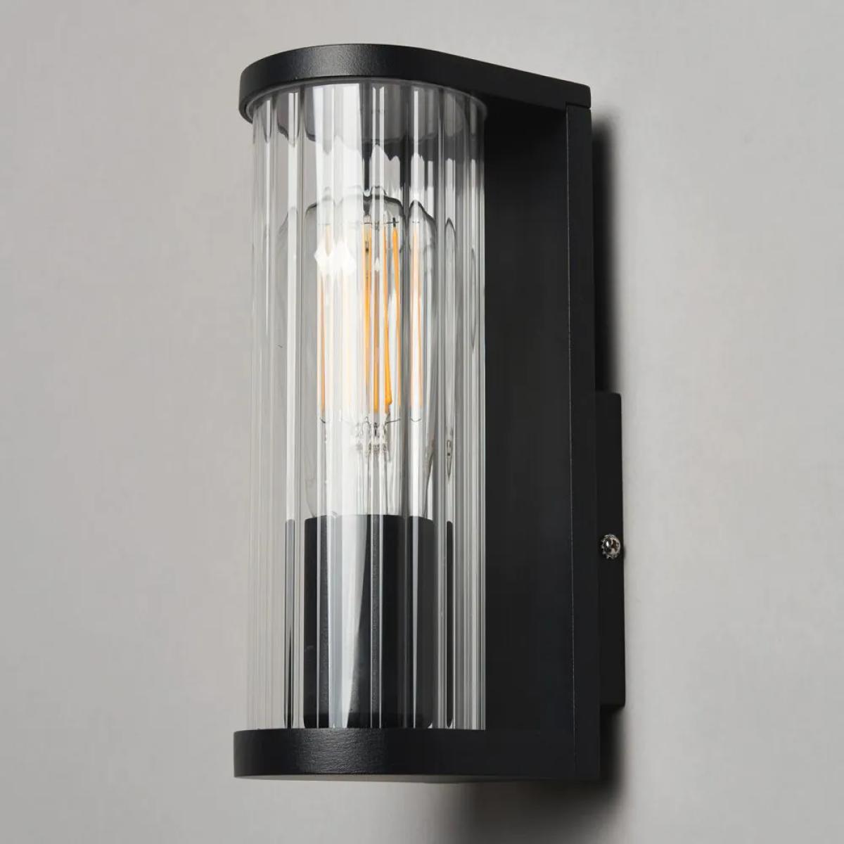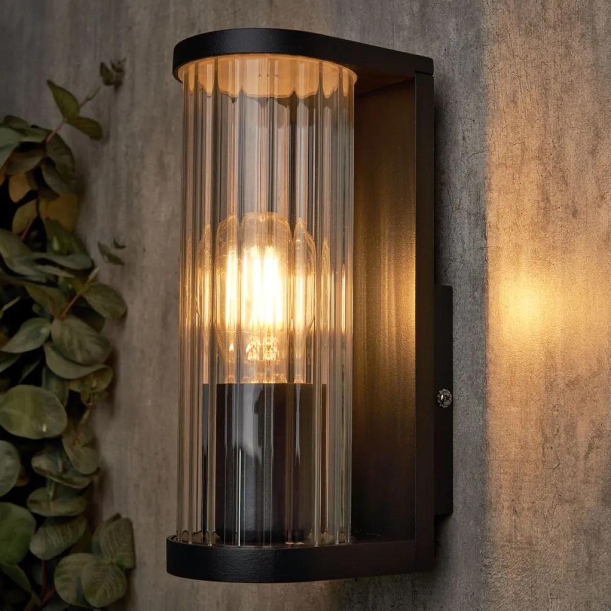I love this wall light for its sleek, modern design and its black finish, which makes it versatile for various outdoor settings. It's particularly well-suited to contemporary exteriors, such as minimalist homes or urban-townhouse backdrops, but can also add a touch of elegance to traditional gardens when paired thoughtfully. Practical styling tips include positioning it alongside doorways or along pathways to enhance safety and usability, while its ribbed glass adds subtle texture and diffuses light for a warm, inviting glow. For best effect, consider coordinating with other dark or metallic elements, or use it to create focal points in outdoor spaces that need a touch of sophistication.