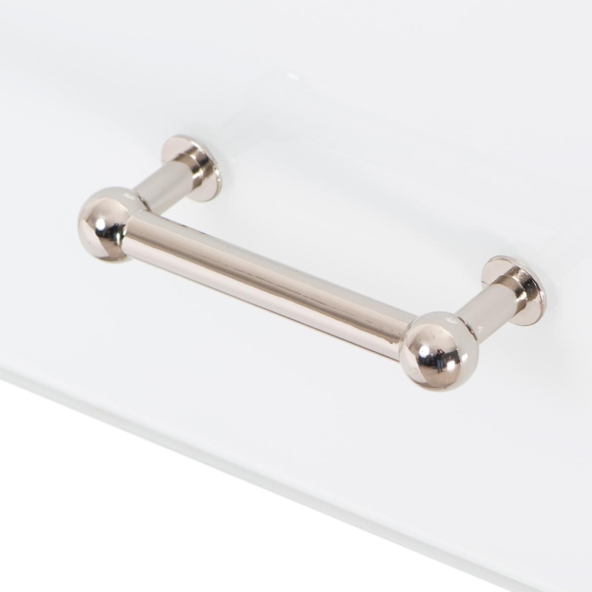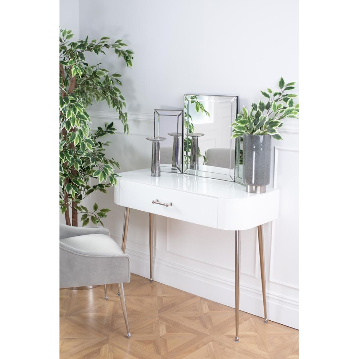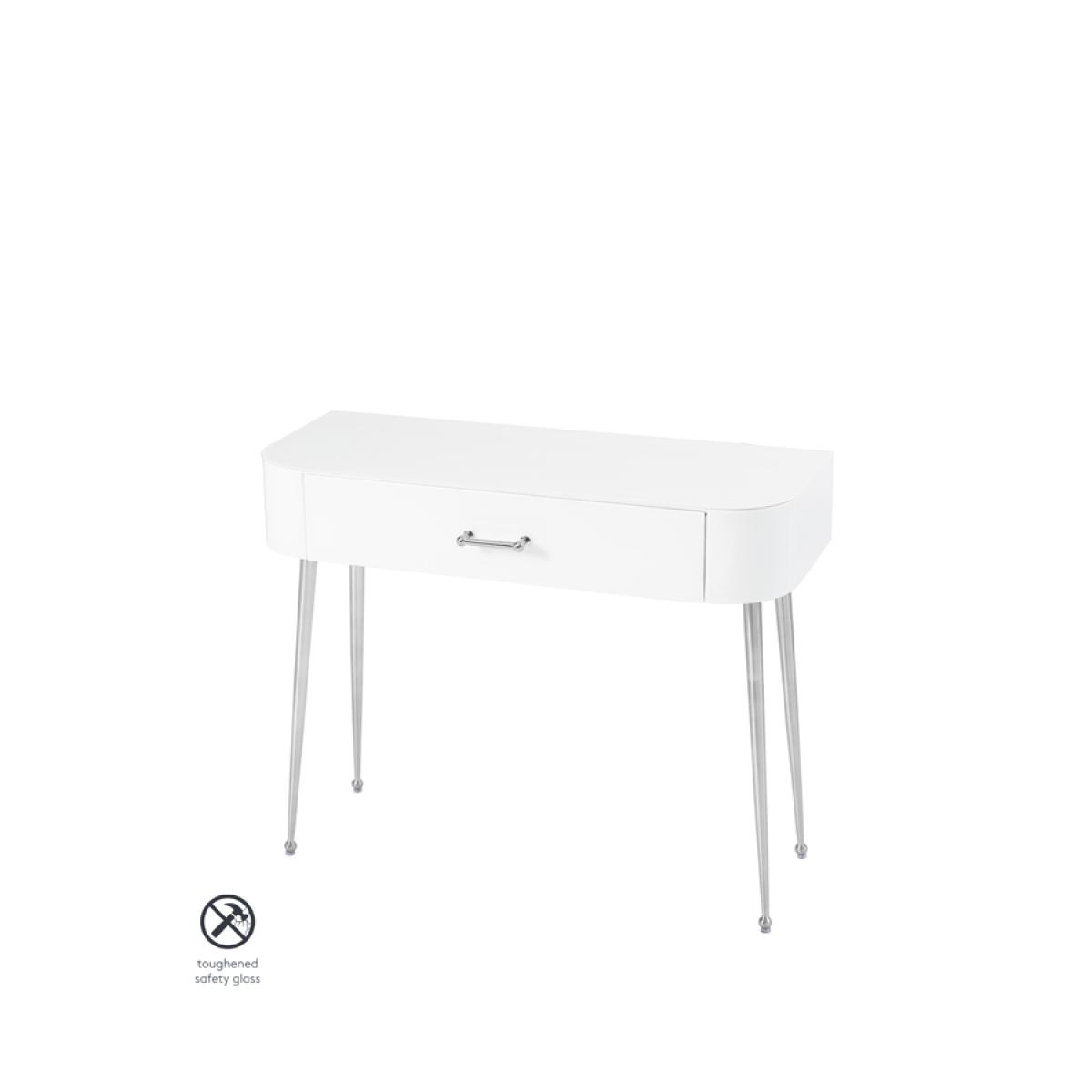 Elegant console table Inspired by highly collectable Mid-Century American furniture. Toughened white glass with distinctive curved corners. Soft close drawer runners. Polished stainless steel legs and handles. Assembly required – approximately 10 minutes.
