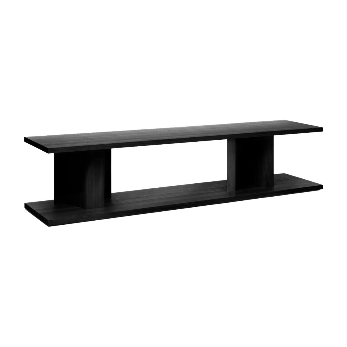 I love this piece for its clean, modern silhouette and rich black stained oak finish, which adds warmth and sophistication to a variety of interiors. It works particularly well in contemporary, Scandinavian, or even industrial spaces, providing a sleek surface without feeling bulky. To style it effectively, consider pairing with minimalist lamps, small sculptures, or books to keep the look uncluttered. The open profile makes it versatile-use it as a side table beside a sofa, or as a low-profile media stand in a living room. Practical tips include placing it against a wall to highlight its construction or layering textured objects on top to add visual interest while maintaining simplicity.