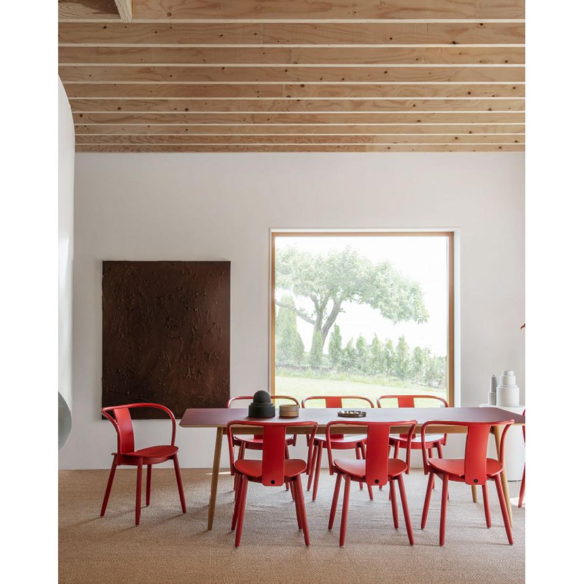 I love this chair for its bold colour and clean lines, making it a versatile choice for both modern and eclectic interiors. The red varnished beech adds a striking visual punch and works well in neutral or minimalist spaces, where it can serve as a statement piece. It’s particularly suited to kitchens or dining rooms that benefit from a pop of colour, but it can also complement vintage or industrial styles when paired with mixed materials. For styling tips, consider layering with textured tableware or adding a neutral cushion to balance the vivid hue. Its durable finish makes it practical for everyday use, and it’s a clever way to introduce colour without overwhelming the space.