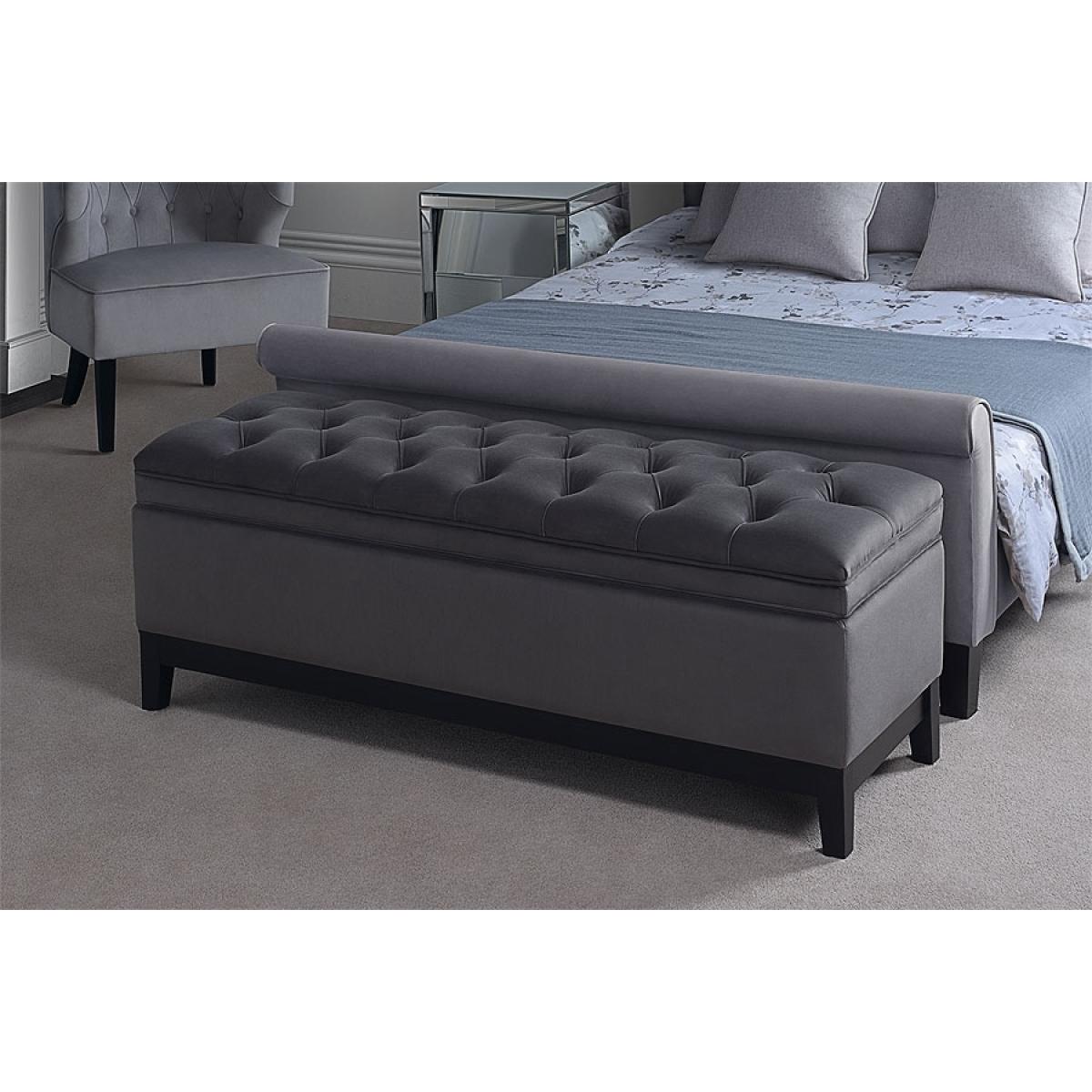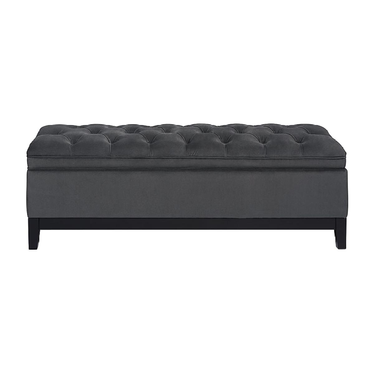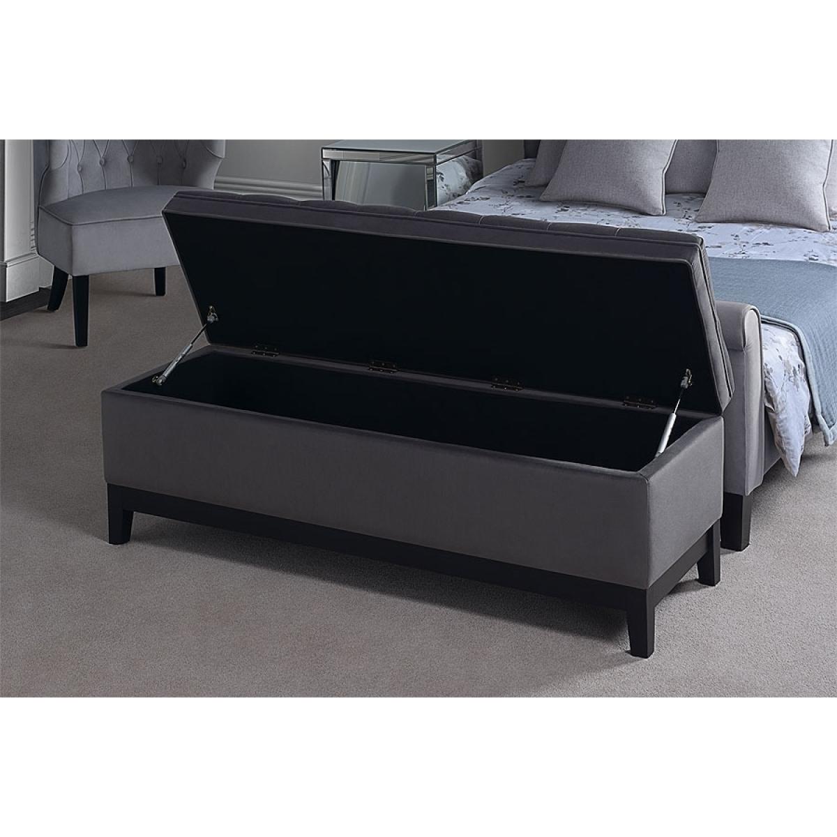 Flip-top ottoman with generous internal storage. Traditional deep-buttoned upholstery. Gas lift stay arms. Black lined interior. Black stained Ash frame. Ideal for storing bedlinen, throws and cushions. Delivered assembled.