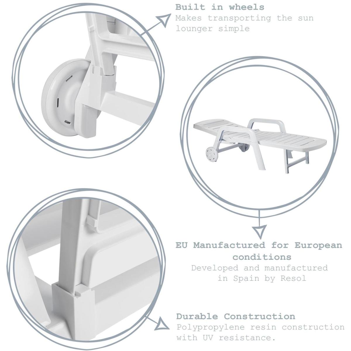 Bring a taste of the Costa Brava to your pool or back garden this summer with the Resol Palamos Plastic Adjustable Sun Lounger. Manufactured in Spain, these loungers are built from rugged, injected polypropylene that has been treated with additional UV Protection, making them perfectly suited to the rigours of the British Summertime. Three reclining positions offer a tremendous amount of flexibility, while the attached wheels at the base of the back legs provide easy movement and transportation. Twin with the Roses Folding Pool Drinks Food Trolley and the Andorra Coffee Side Table for the complete poolside summer set-up!