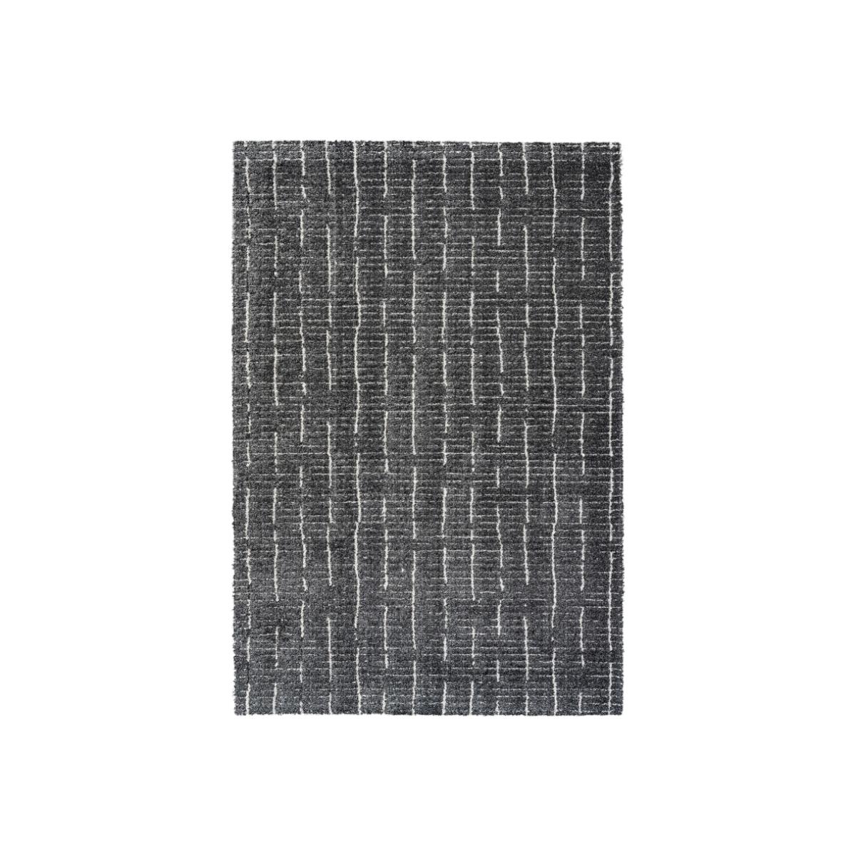 I love this surfacing. The charcoal hue makes it versatile and easy to incorporate into various colour schemes, from neutral schemes to more daring styles. Its recycled yarn composition adds an eco-friendly edge, making it suitable for contemporary, sustainable interiors. The rug’s modern, textured pattern works particularly well in minimalist or industrial spaces, adding both warmth and visual interest without overwhelming the room. For styling, consider pairing it with natural materials like wood or metal furniture and keeping accessories understated to let the rug be the focal point. It’s a practical choice for larger living areas or dining rooms, providing a durable yet stylish foundation underfoot.