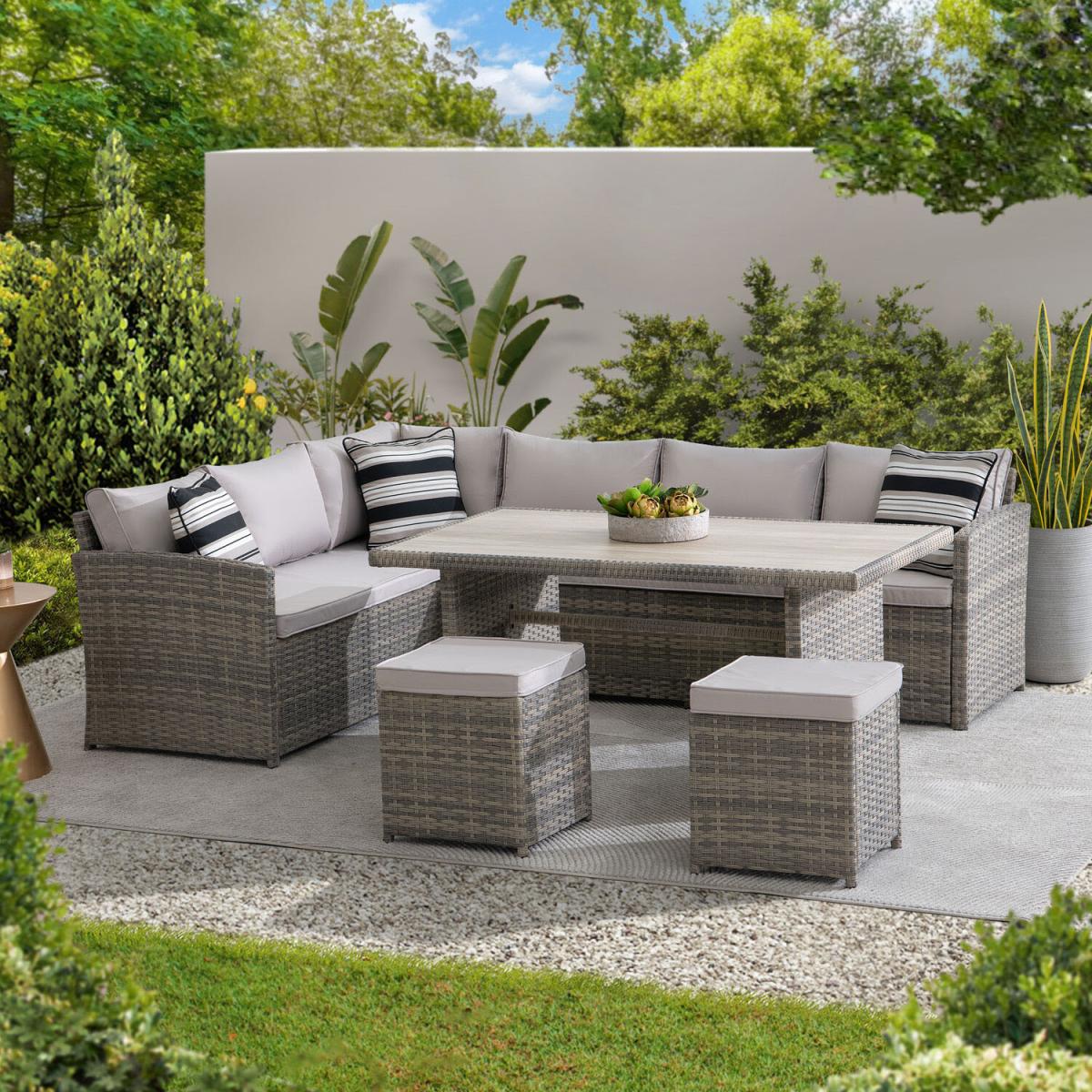 Upgrade your outdoor space with the Matara 8 Seater Corner Set. Combining style and convenience, its sleek design features a powder-coated steel frame and hand-woven synthetic resin wicker, ensuring long-lasting use and a contemporary look. The table with a glass top adds a touch of elegance and practicality. Practical and stylish, the set includes two ottomans with hidden storage to keep essential items handy or declutter your space. Matara 8 Seater Corner Set - Grey