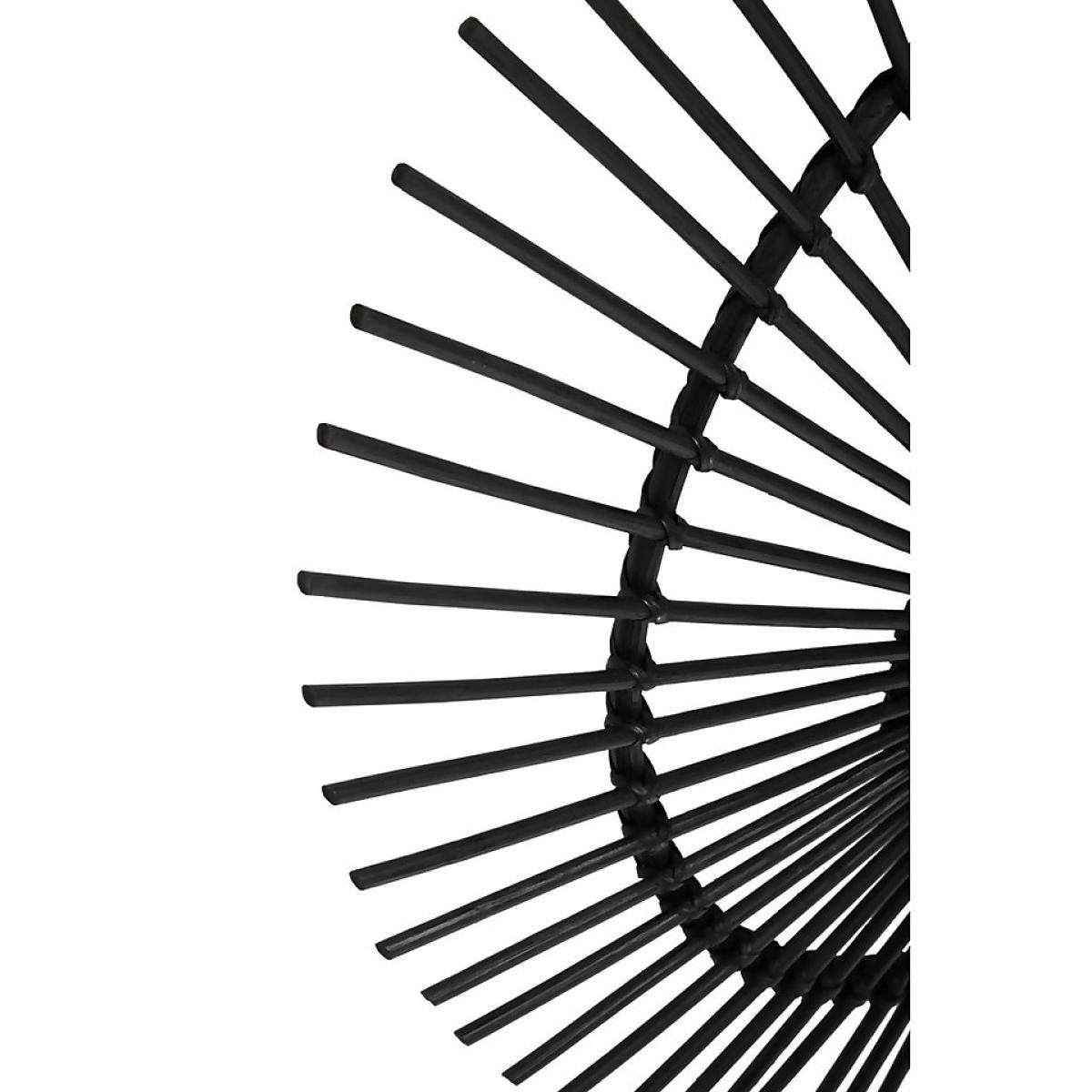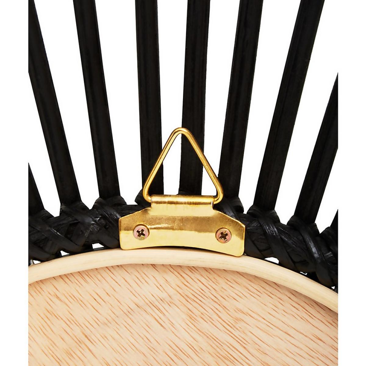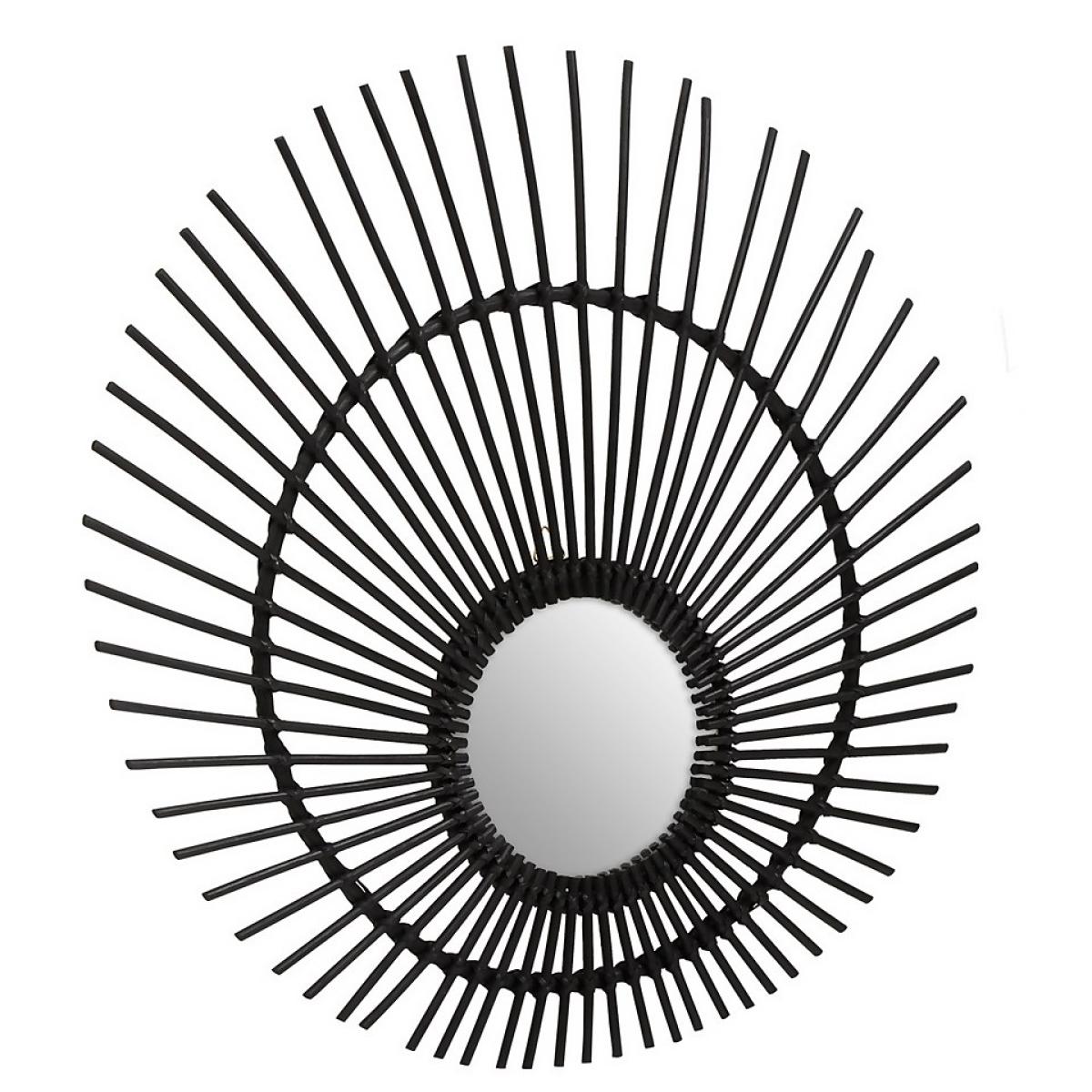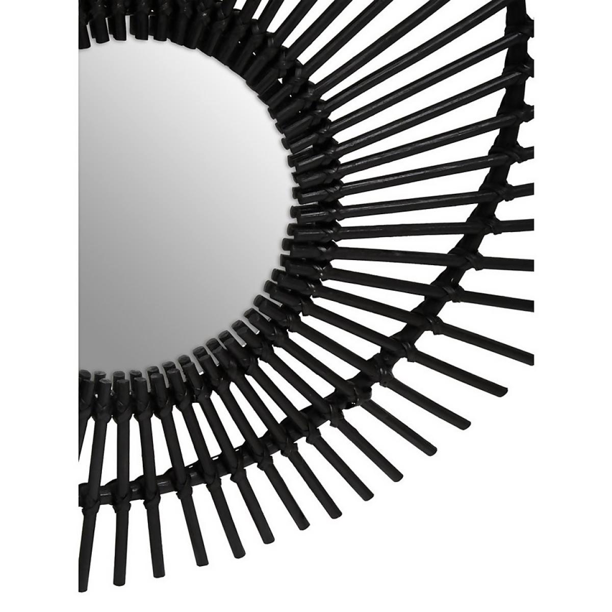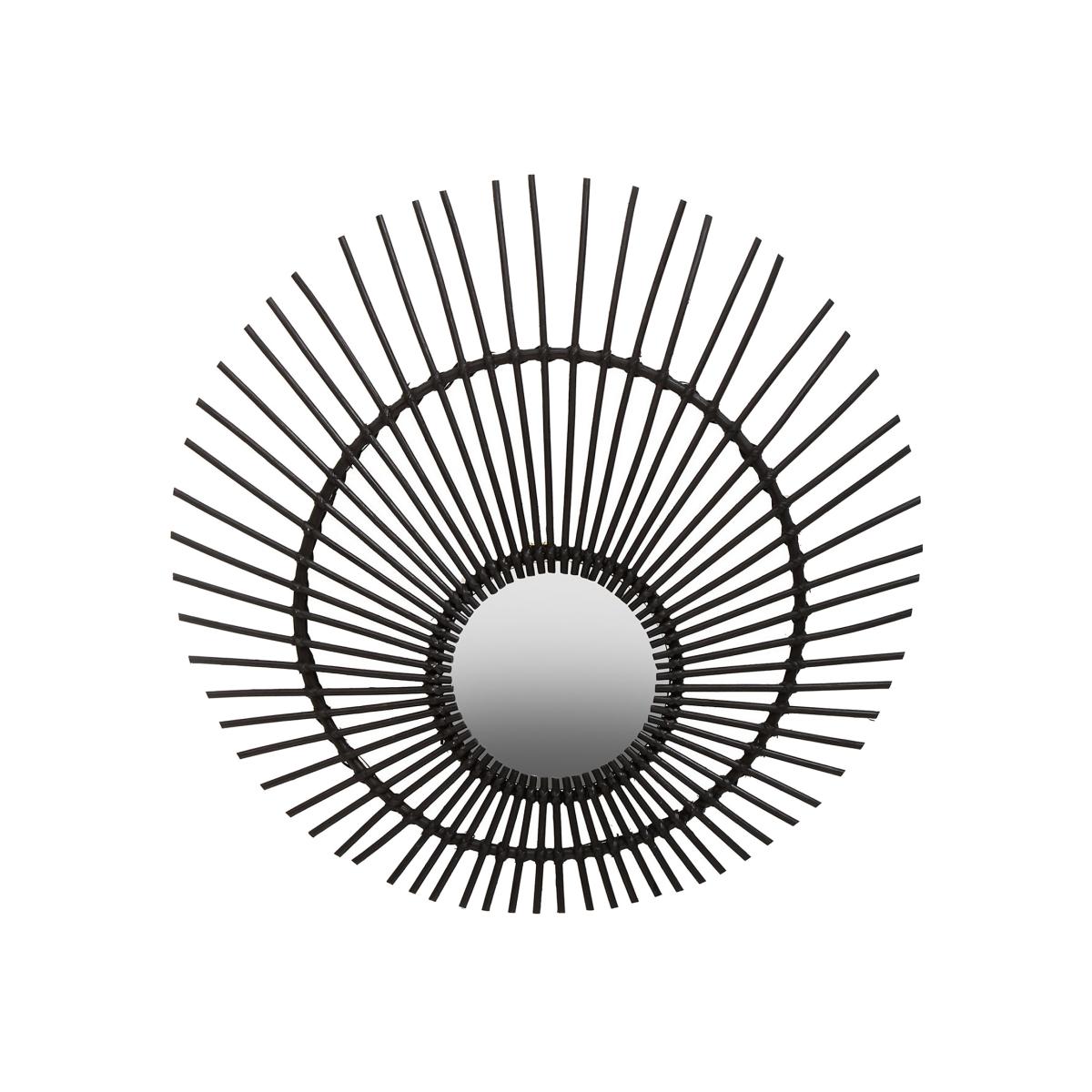 This wall mirror is intricately handwoven with black rattan to form a sunburst design. The reflective round mirror is set neatly inside the wooden frame and exudes a tribal character on the wall.