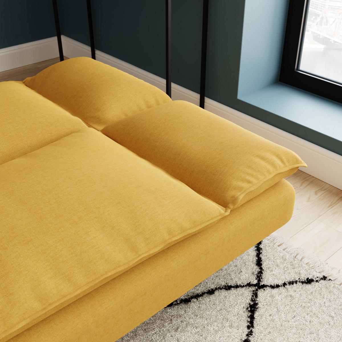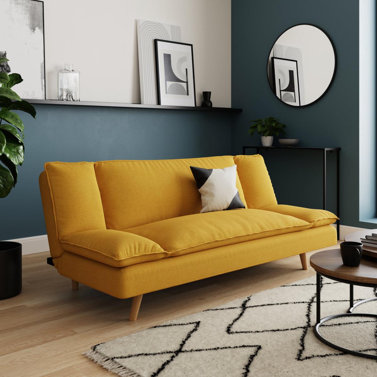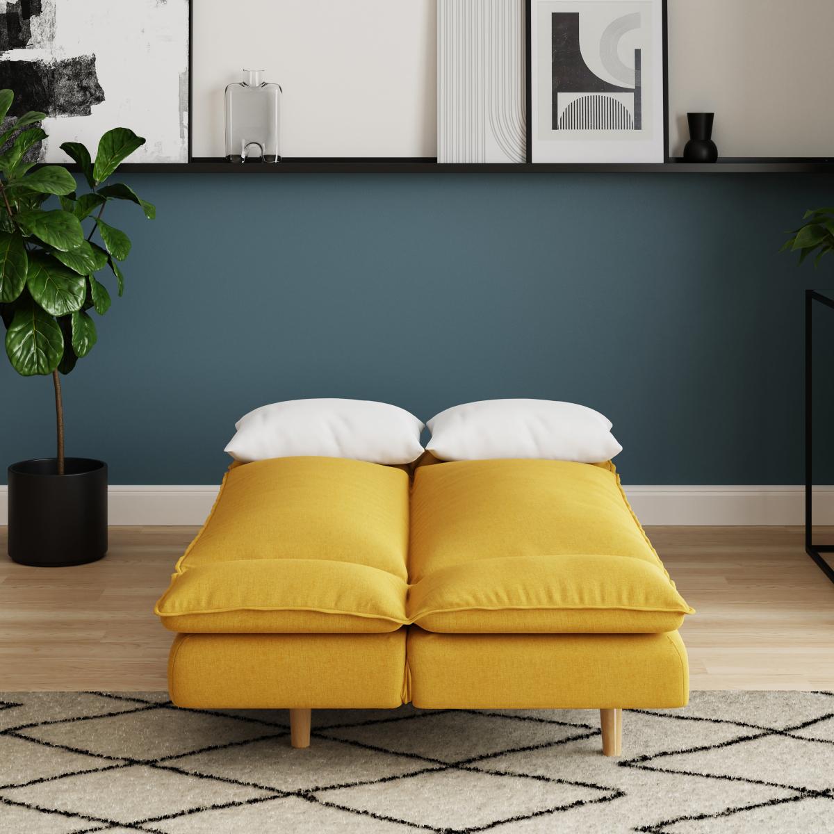 I love this sofa bed because of its bold ochre colour and versatile flatweave finish, which adds texture and warmth to contemporary and eclectic interiors. It works particularly well in living spaces where style and practicality are key-think guest rooms, studio apartments, or lounge areas that need flexible furniture. For styling tips, pair it with neutral tones and minimal accessories to let the colour stand out, or add colourful cushions and throws for a playful, layered look. Its clean lines and simple silhouette make it easy to incorporate into both modern and mid-century interiors, making it a smart choice for spaces that need a design-forward yet functional piece.
