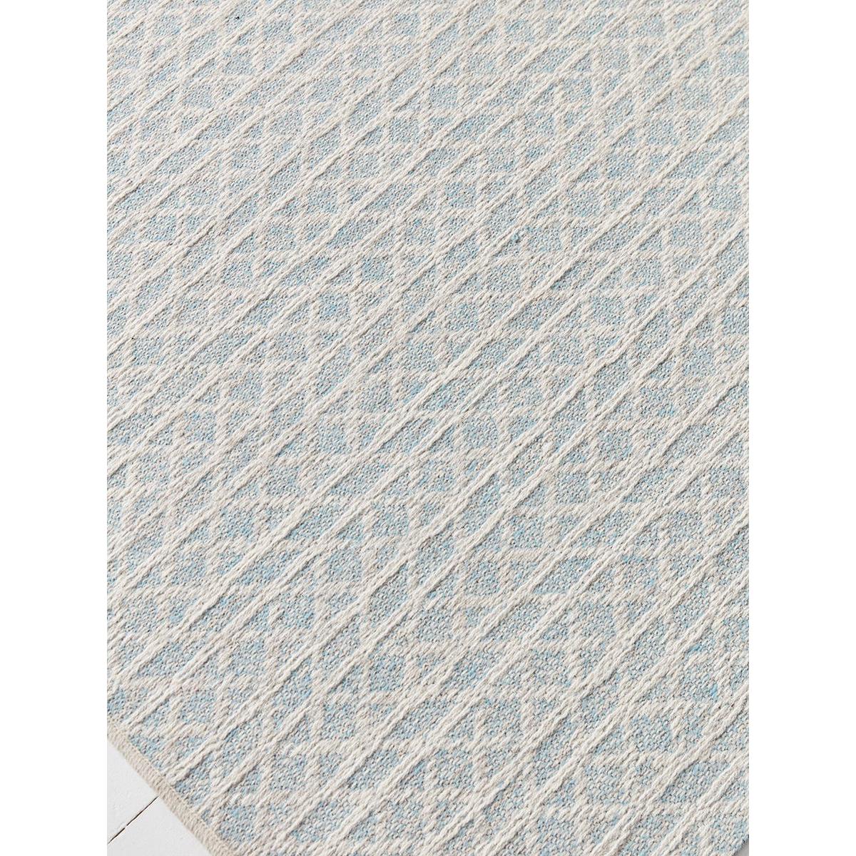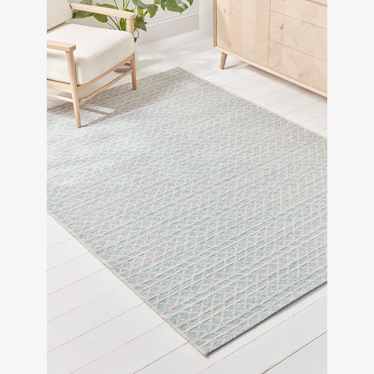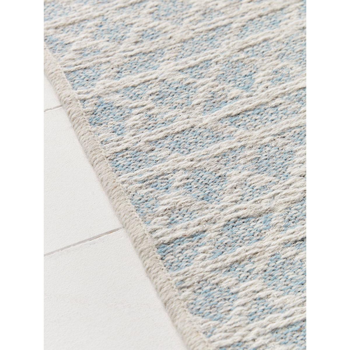 In a luxurious and warm mix of New Zealand and British wool, our Mathea Rug features a criss cross design in pale blue and white for a fresh scandi inspired addition to your floor. This generously proportioned flat weave rug will make a lovely anchoring feature in a living room or bedroom, as well as being super cosy underfoot.