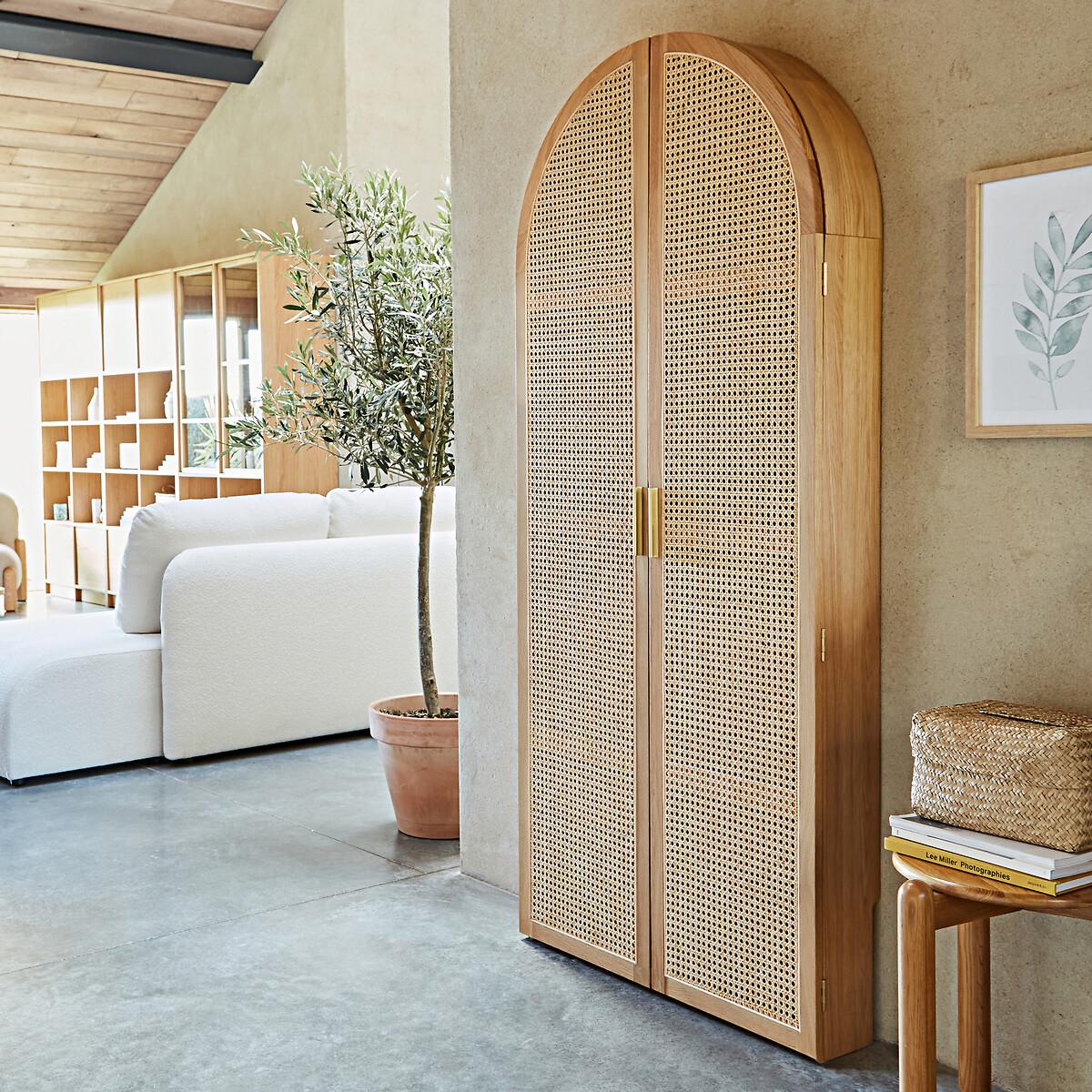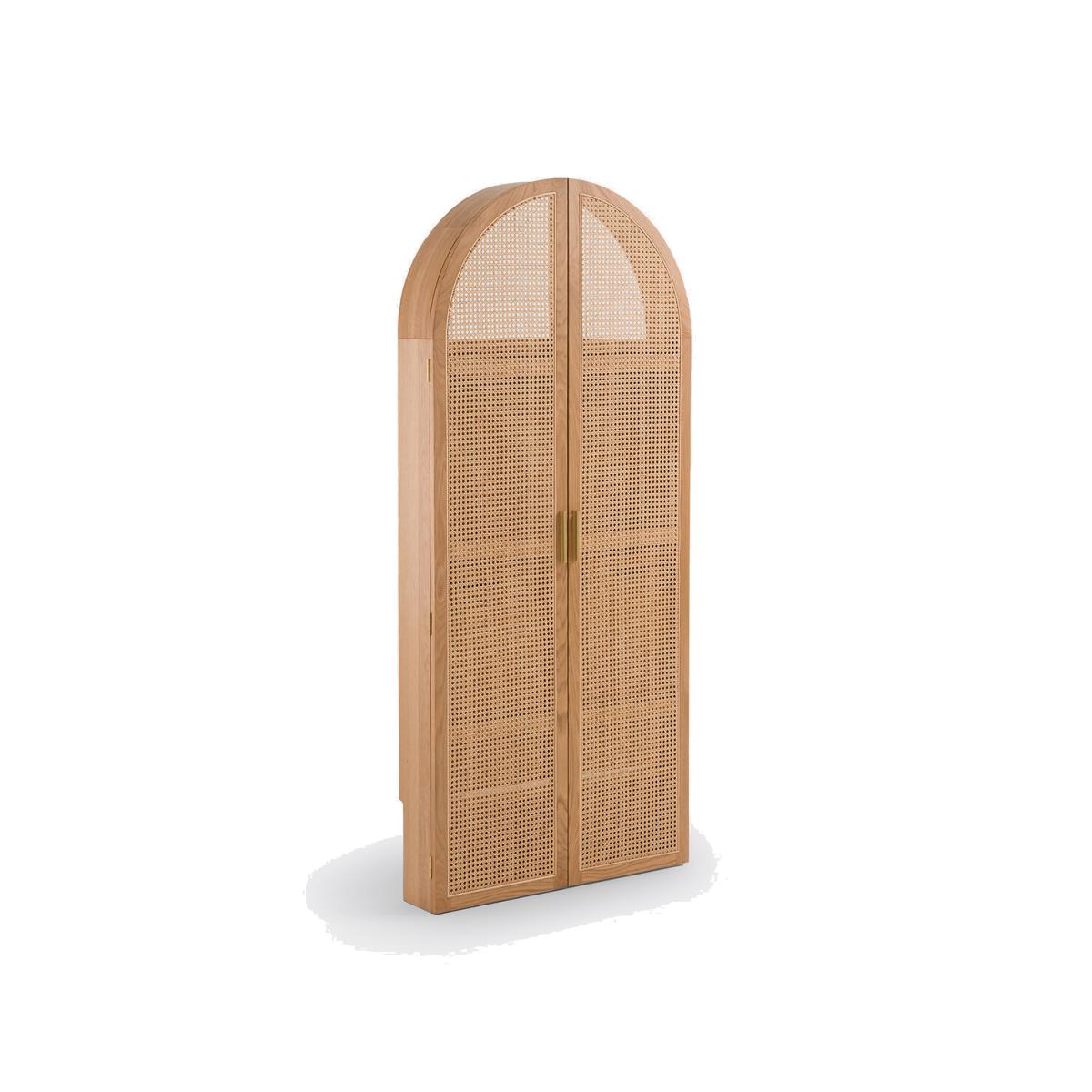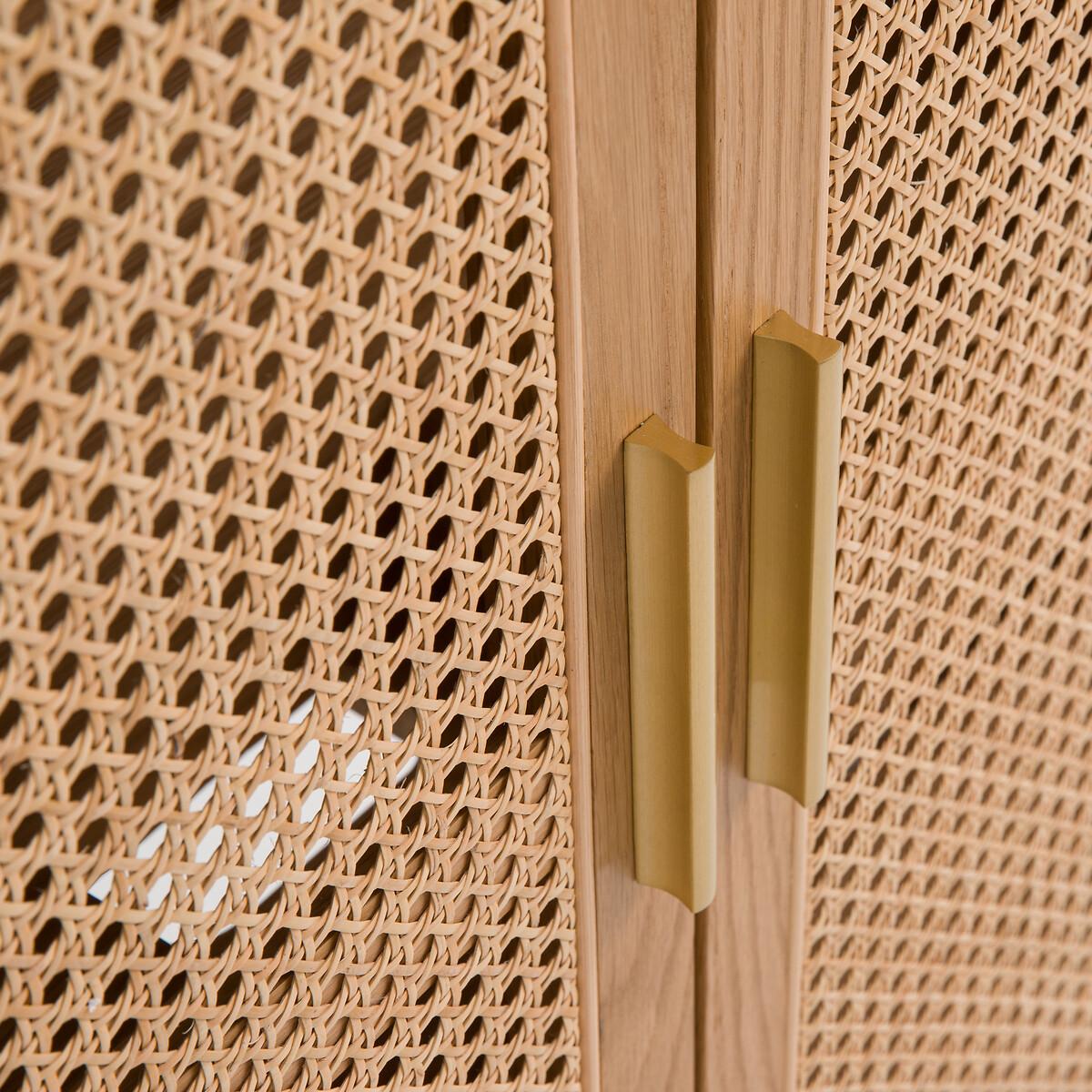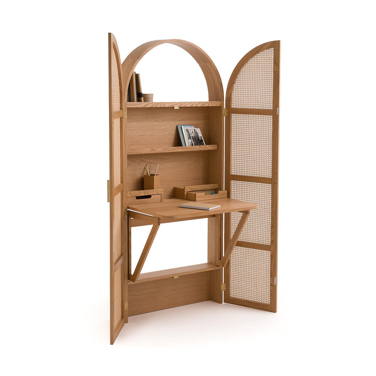 The Mathéo office cabinet is part of our Les Ingénieux collection. Creations full of ideas to make life simpler and everyday life more beautiful, imagined by our designers in France.. Mathéo, the incognito office you can put away at the end of the day. Why you'll love this product • Open, it's a real desk with storage, drawers and functional tips. Ideal for remote working. • Closed, it becomes an arch of oak and cane which fits easily anywhere, even in an entrance, thanks to its shallow depth. Product Details • Folding desk • Solid oak and MDF oak veneer with a nitrocellulose varnish • Doors in oak and rattan cane. • Brass-finish steel handles • Wall fixing (screws and plugs not supplied)Dimensions. Overall • Width: 80cm • Height: 180cm • Depth: 17cm • Weight: 24kg. Folding desktop • Width: 75cm • Height: 75cm • Depth: 45cm• Sold pre-assembled. Parcel dimensions and weight • 1 parcel • L190 x H24 x D90cm. 36kg