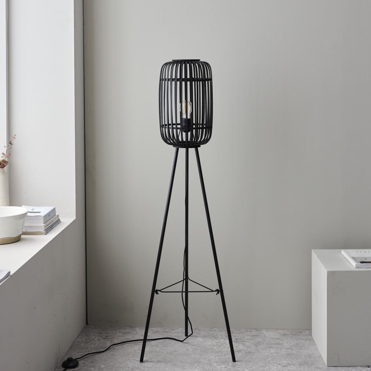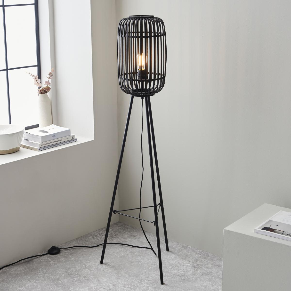 A simple and stylish floor light inspired by nature, with sustainably sourced dark bamboo cage, creating a soft warm light. Finished with matt black paint and dark wood detailing.