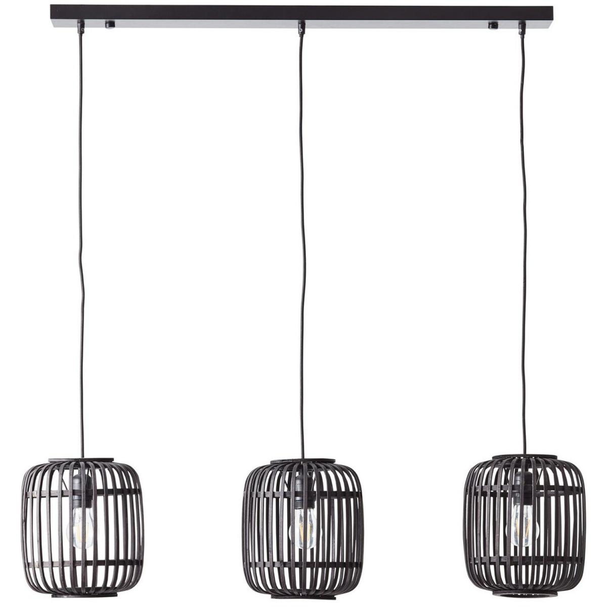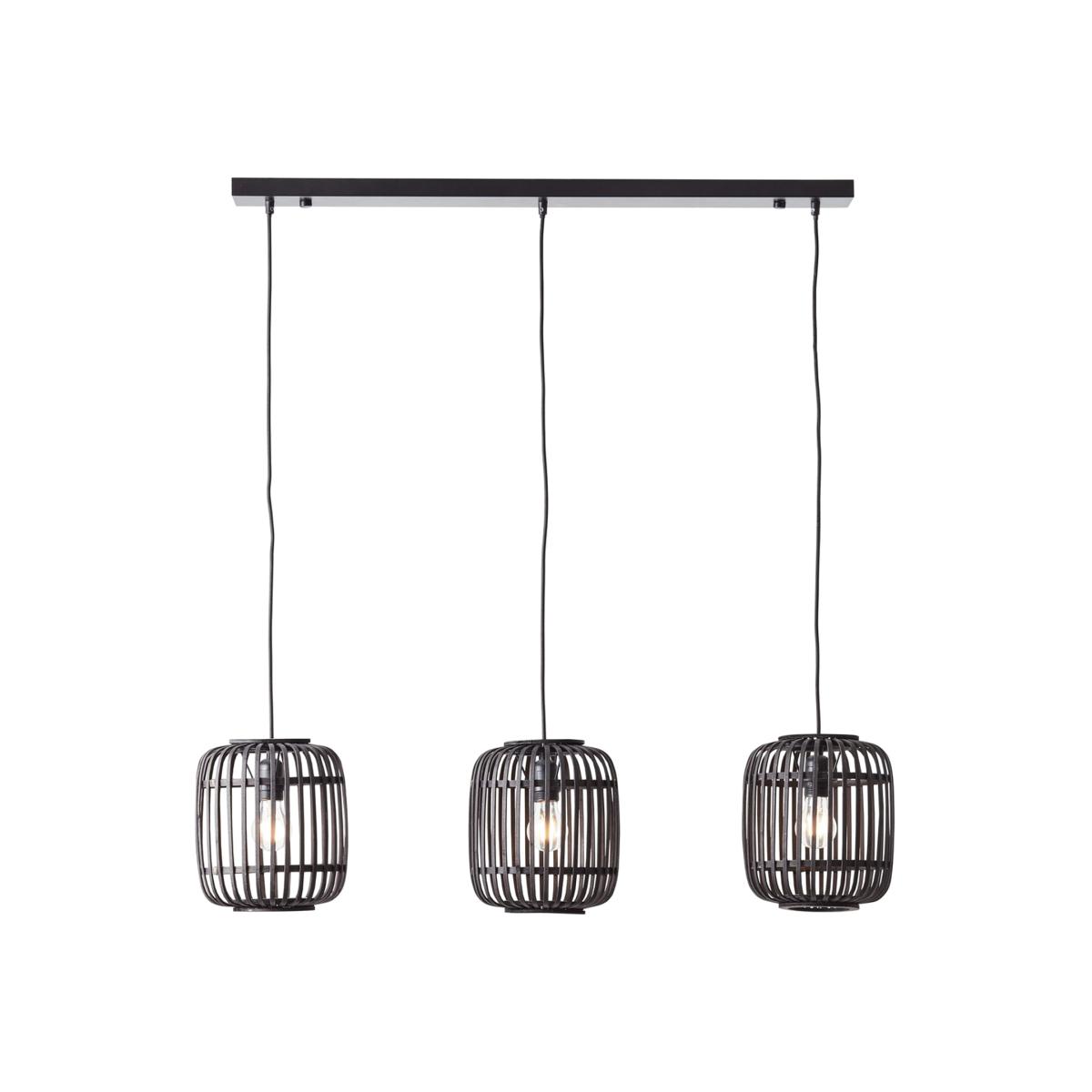 A simple and stylish three light pendant inspired by nature, with sustainably sourced dark bamboo cage, creating a soft warm light. Finished with matt black paint and dark wood detailing.