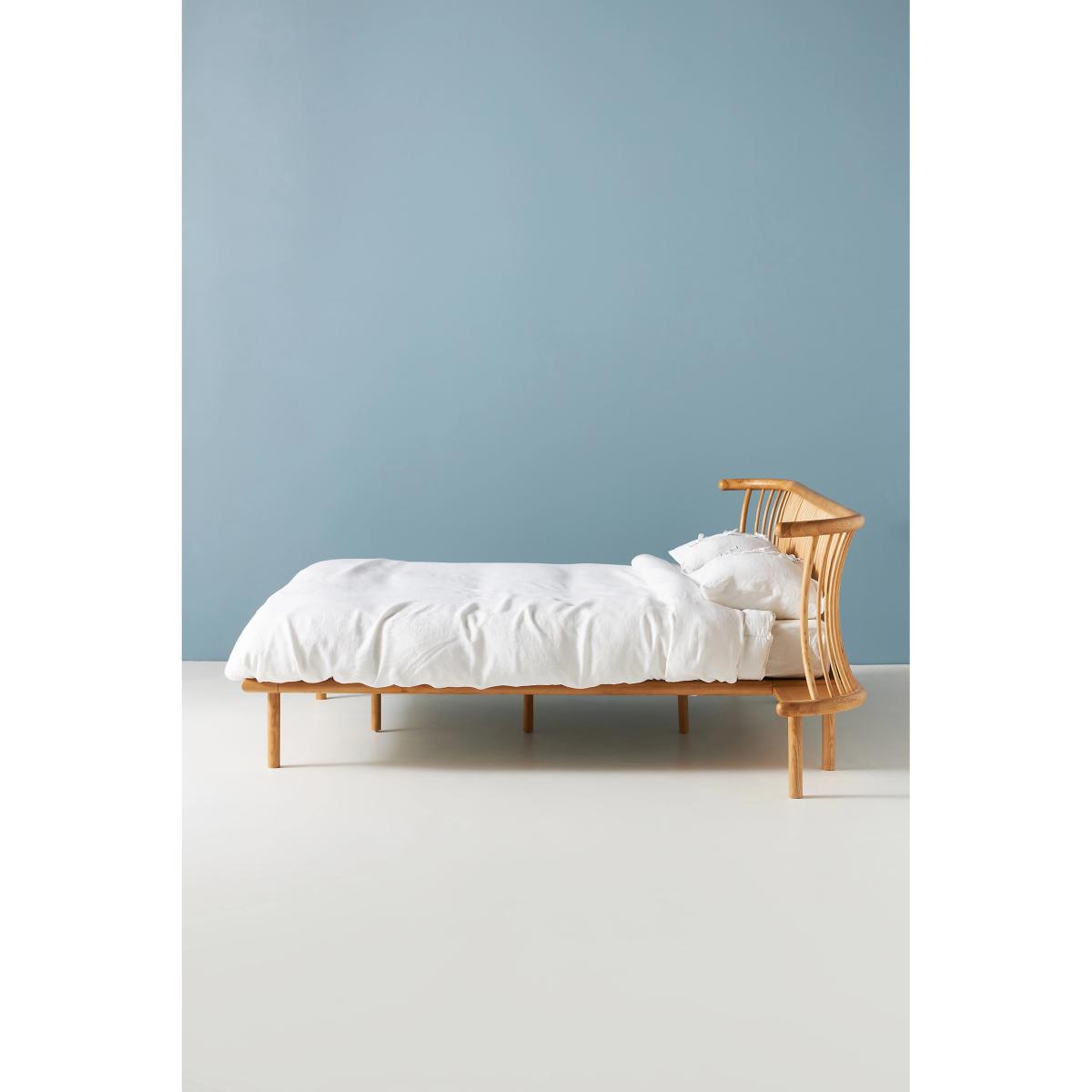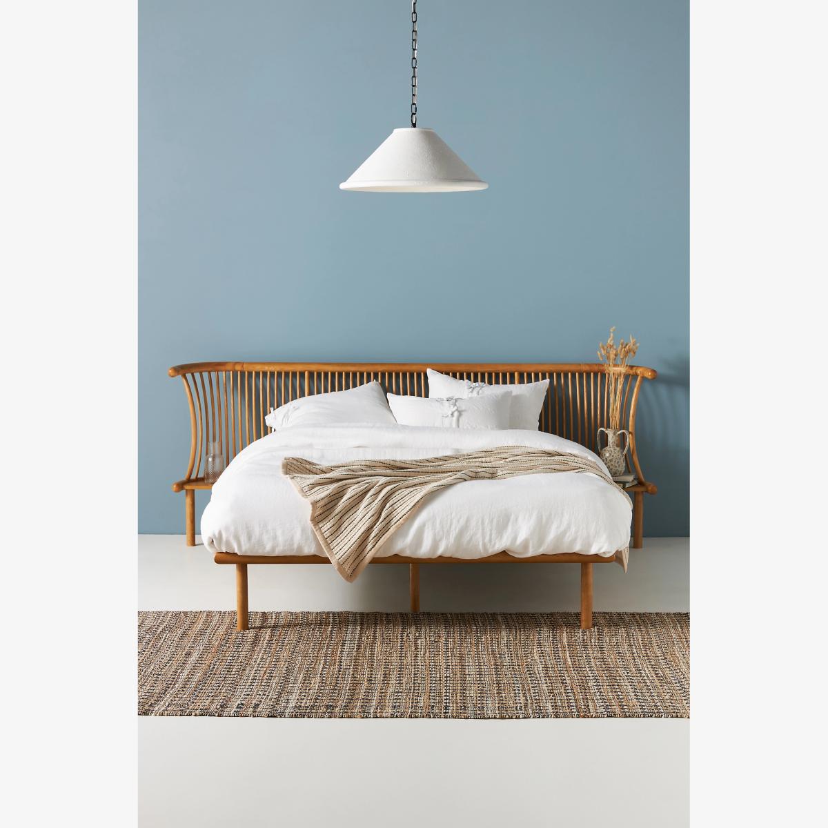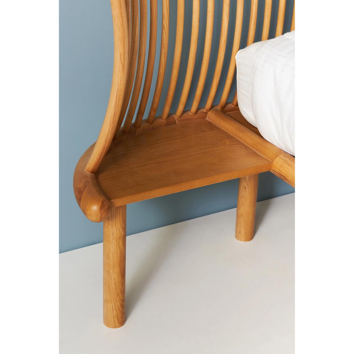Taking cues from Shaker-style furniture, this bed features an exquisitely curved headboard that extends to flanking nightstands. Left in a natural ash wood finish, each perfectly placed spindle puts sheer craftsmanship on display. * Furniture pieces weighing over 30kg include delivery to your room of choice and packaging removal * Solid ash wood veneer bed reinforced with engineered hardwood featuring flanking nightstands * Sealed with clear lacquer for protection * Slight variation in natural wood texture may occur * Easily assembled upon delivery * Legs are removable * Wipe clean with soft cloth; avoid using chemical cleaners * Imported